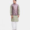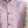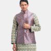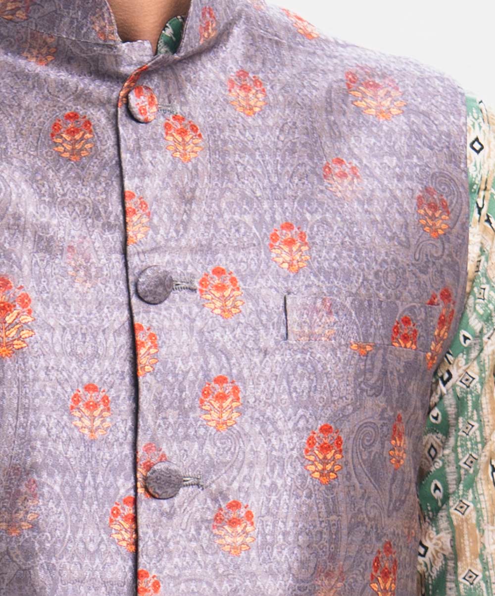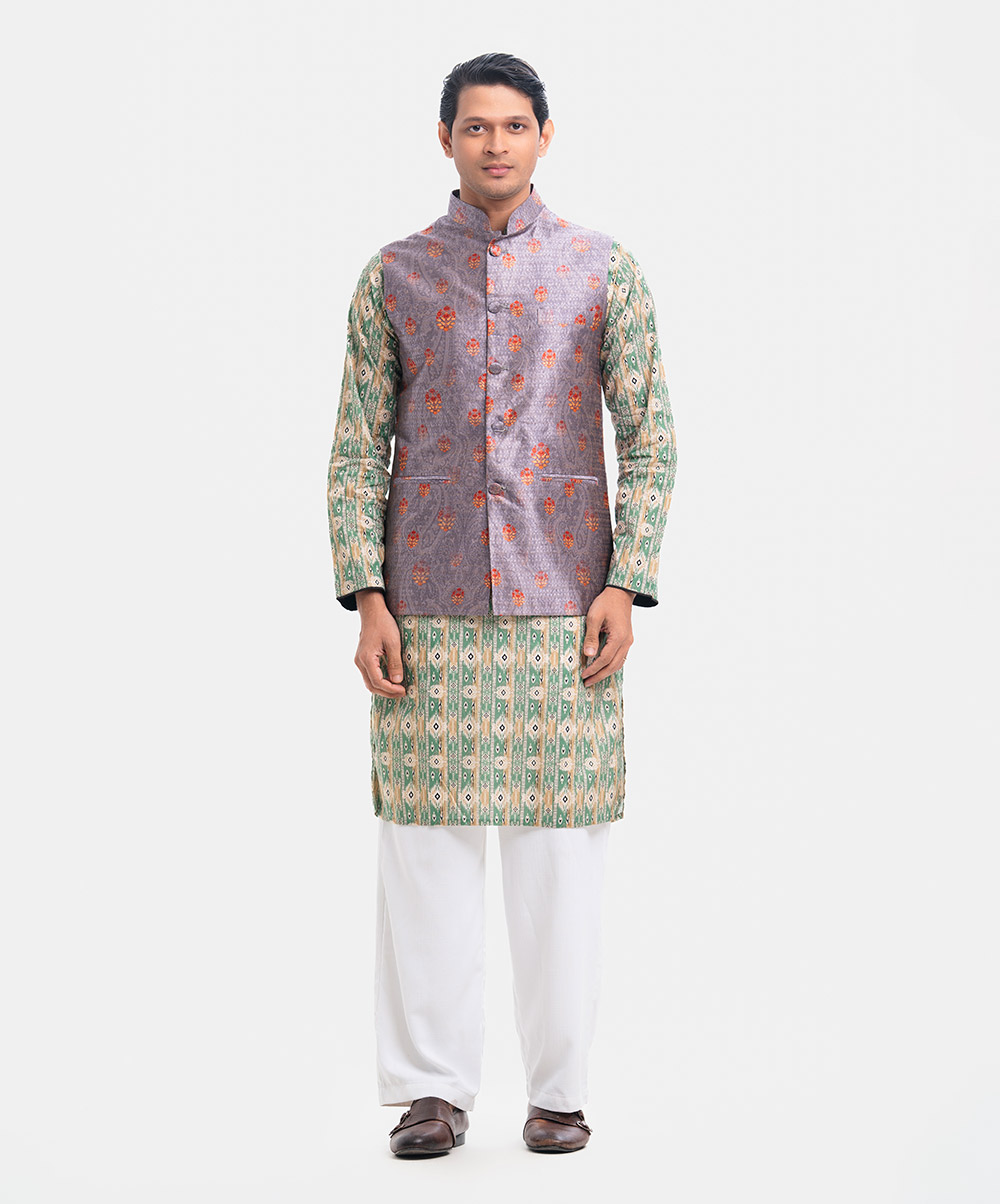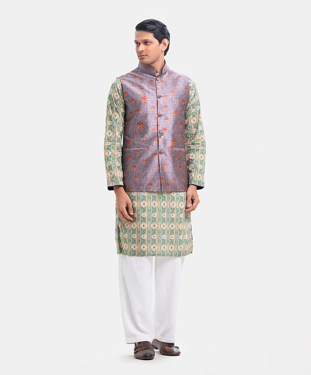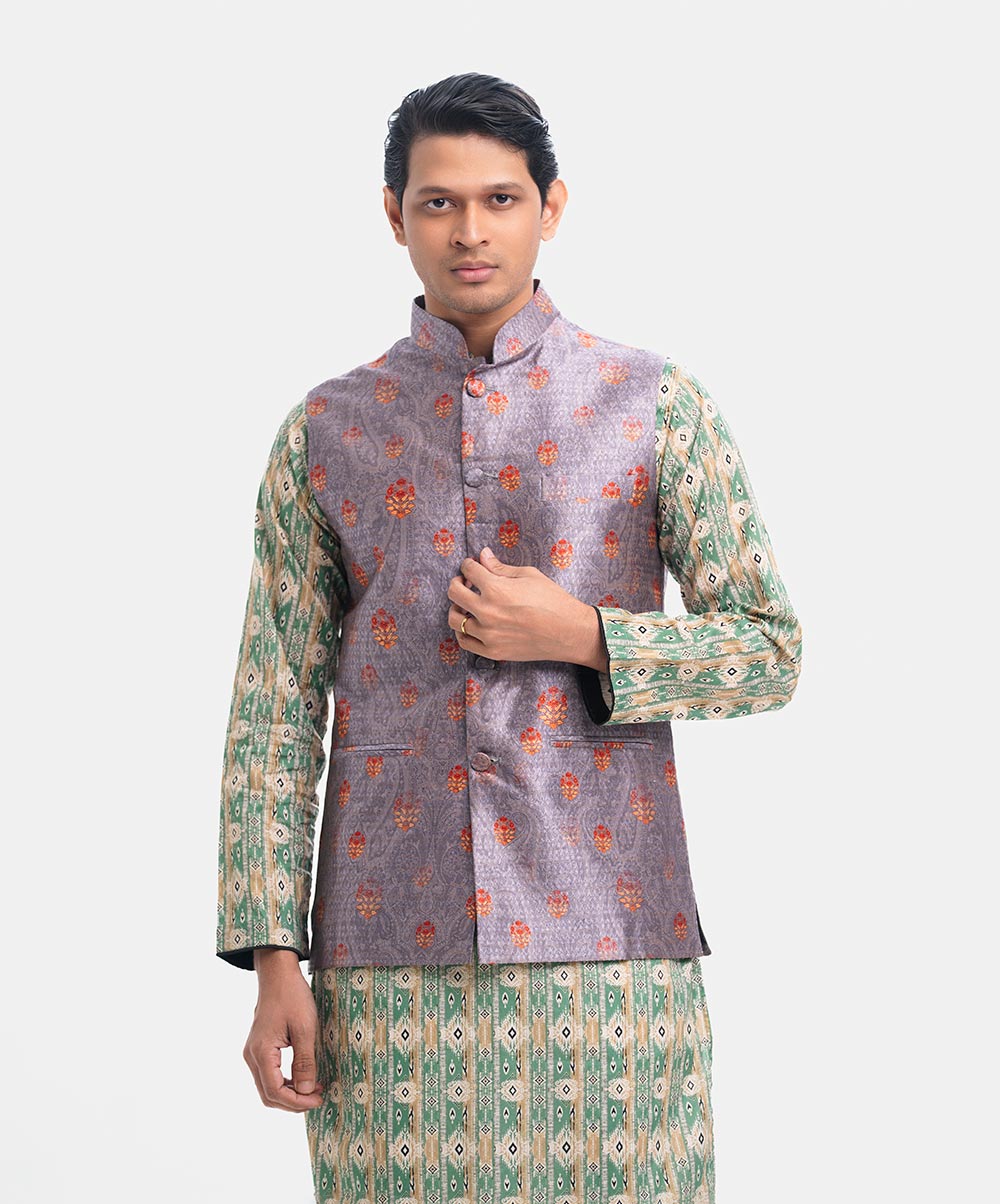 Men’s waistcoat in Jacquard fabric. Mandarin collar, sleeveless, straight hem with buttons closure and three pockets at front.