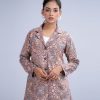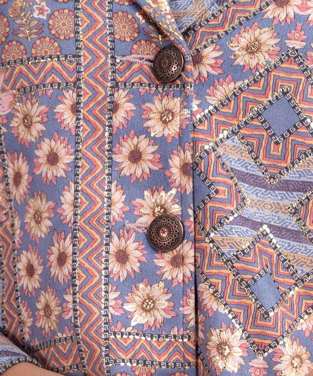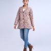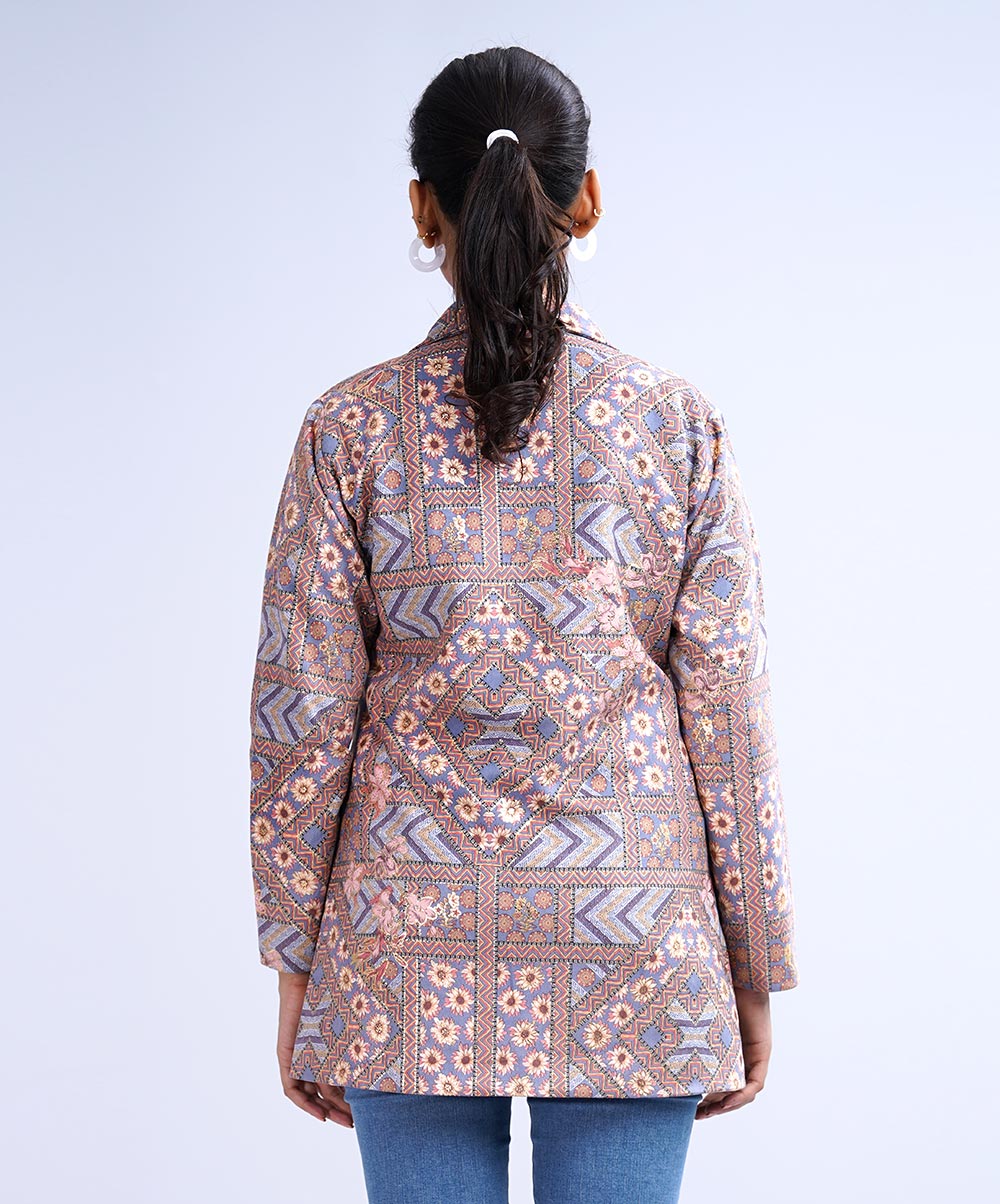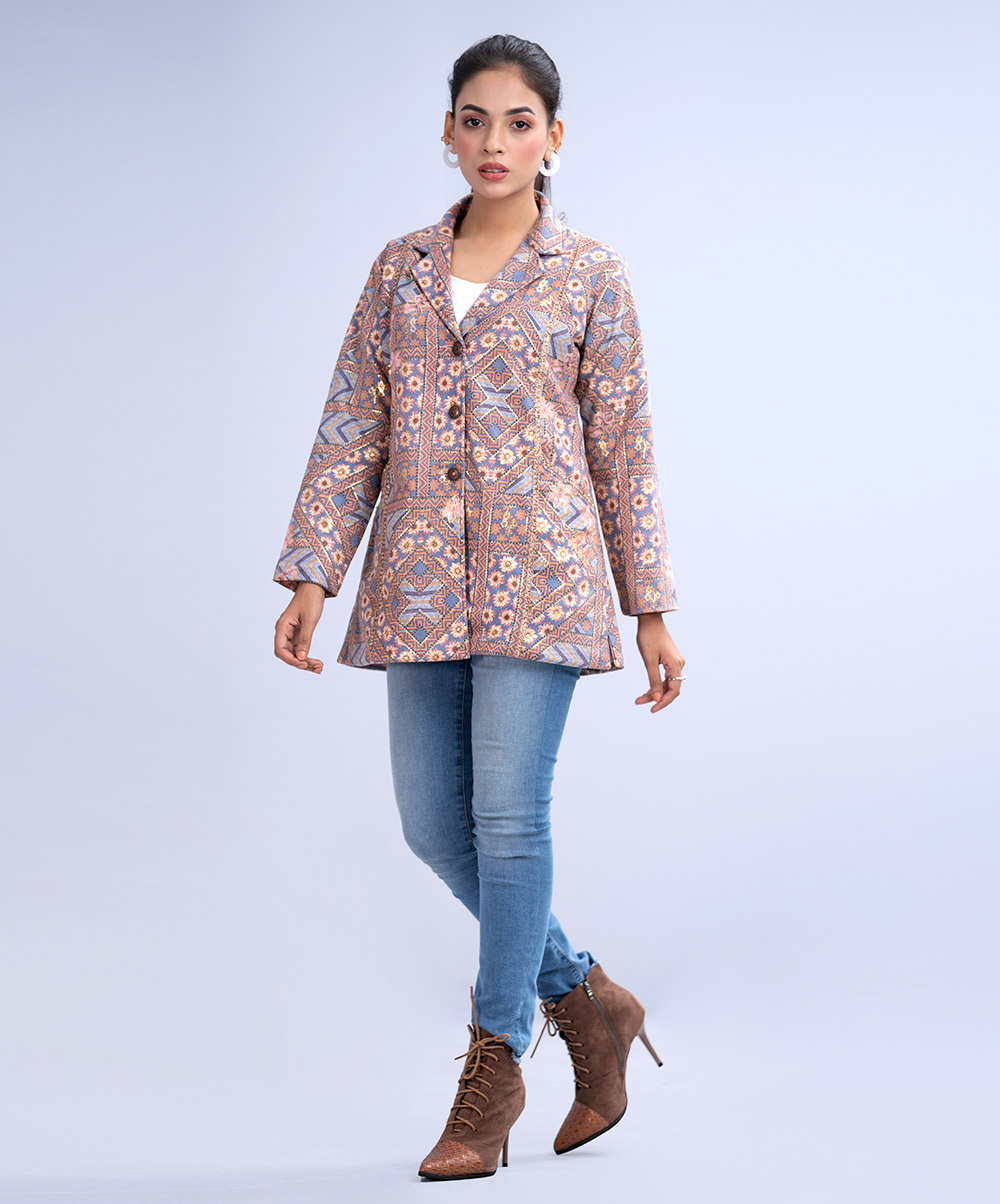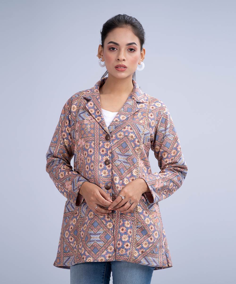 Gray printed Jacket in Polyester Spandex fabric with lapel collar & button. Pocket with lace embellishment on the front part and full sleeves.