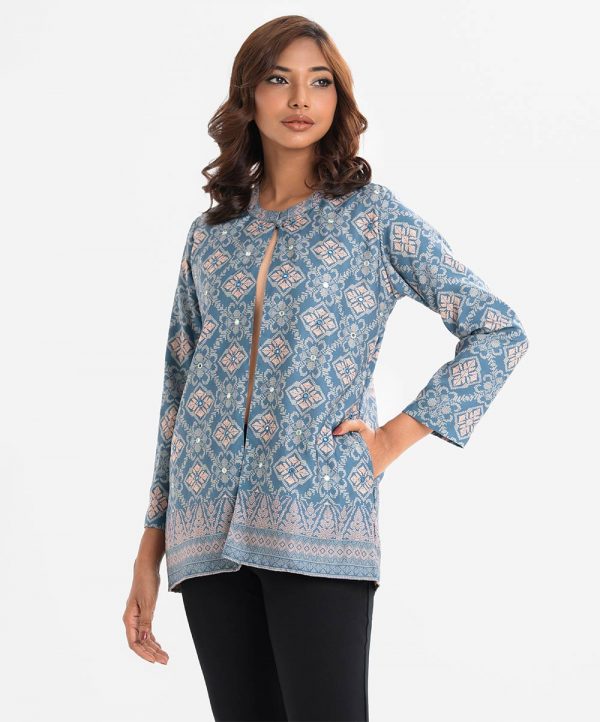 Women’s winter aztec printed jacket in faille fabric. Stand collar with single button opening, full sleeves. Karchupi at front. Inseam side pockets.