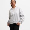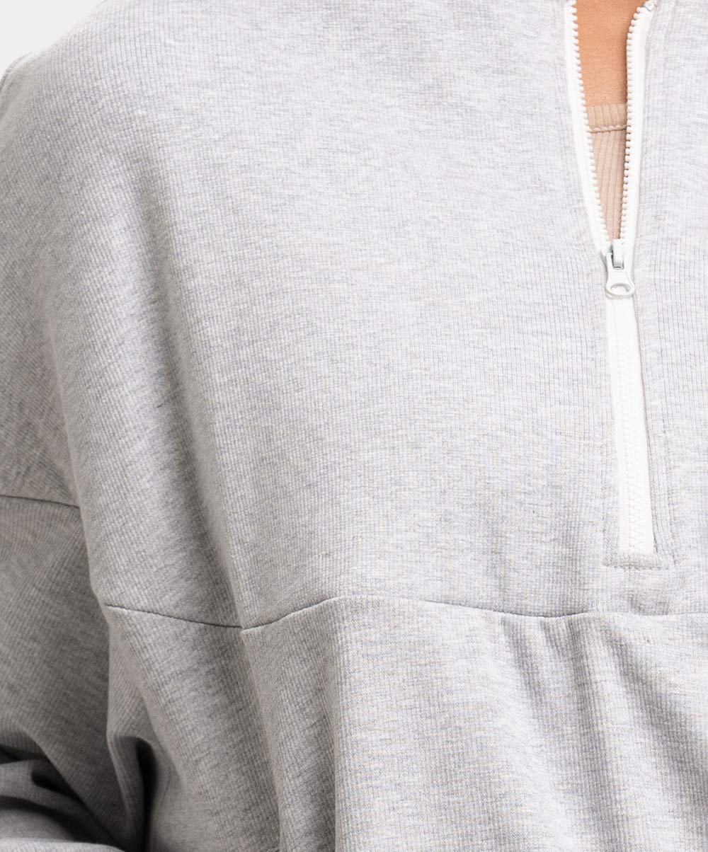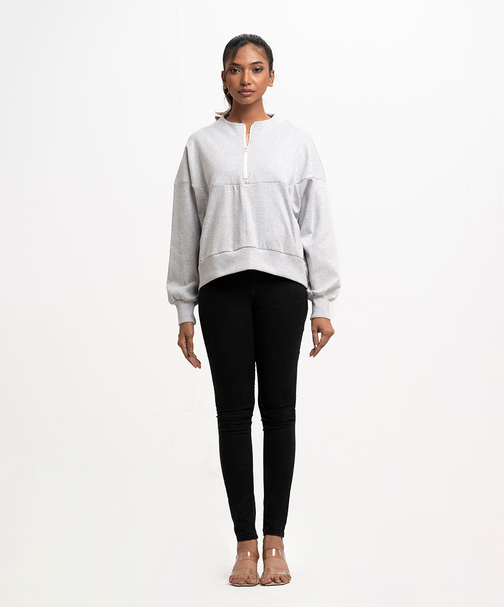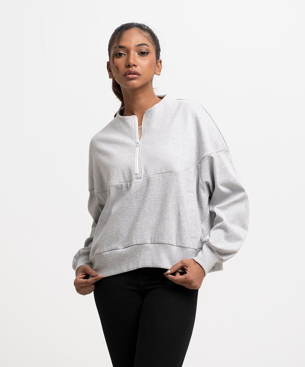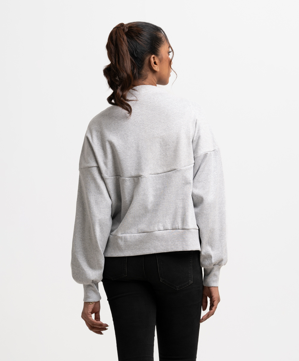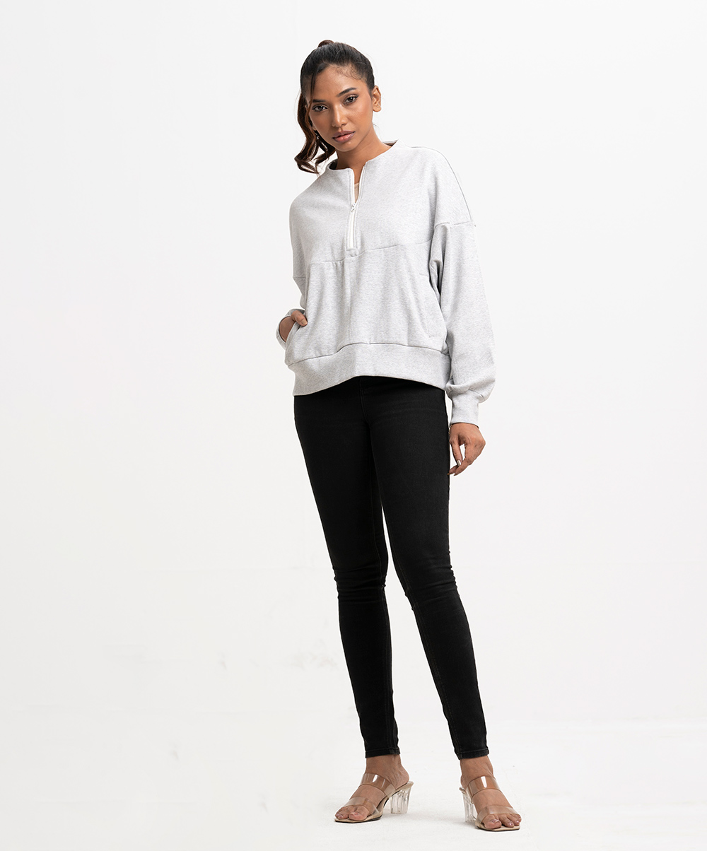 Women’s jacket in cotton knit fabric. Round neck with zipper opening, long sleeves, and two front pockets.