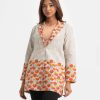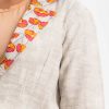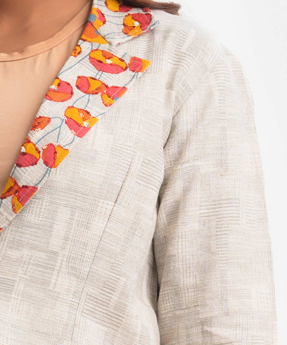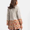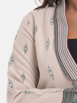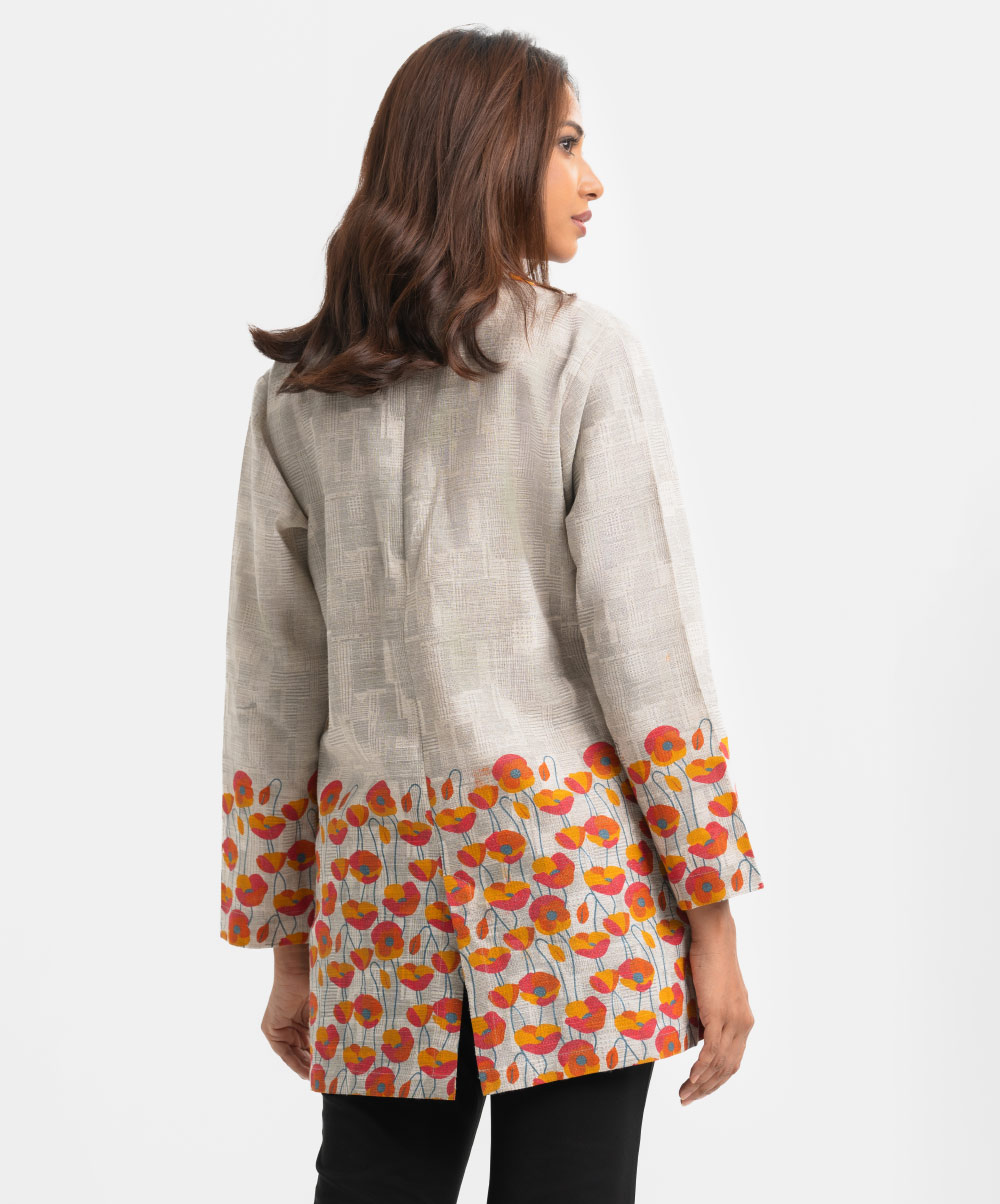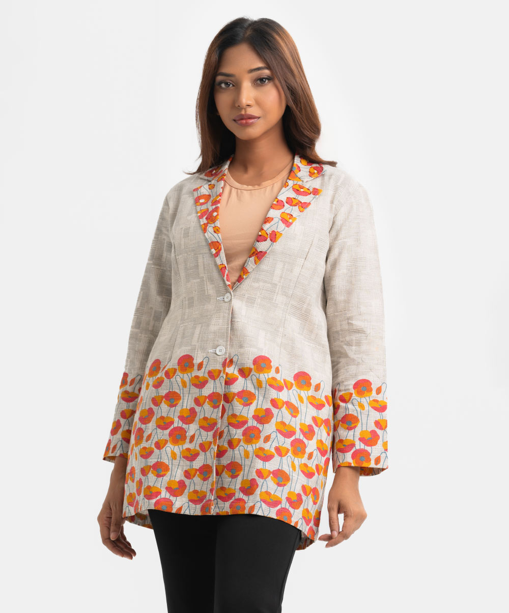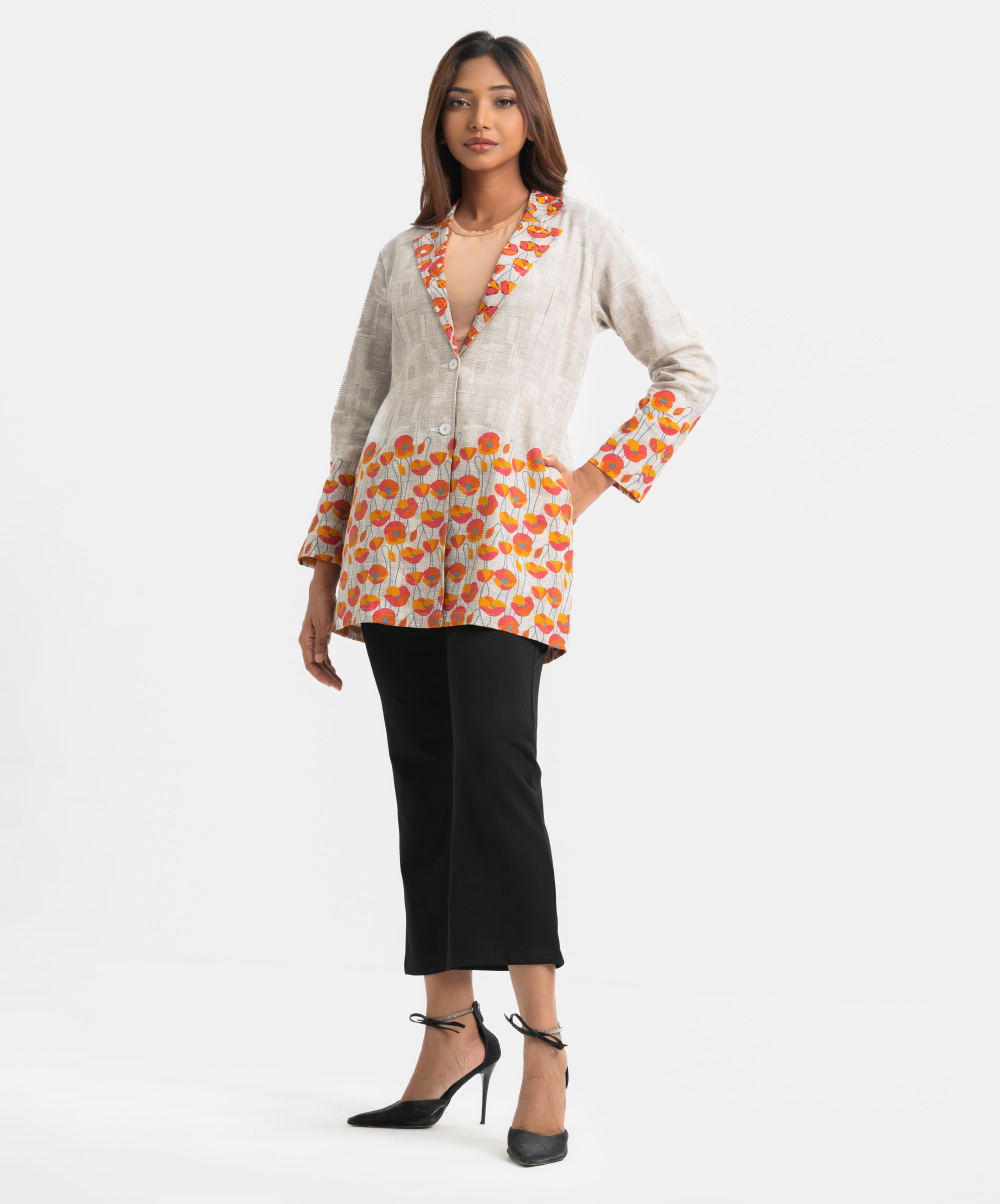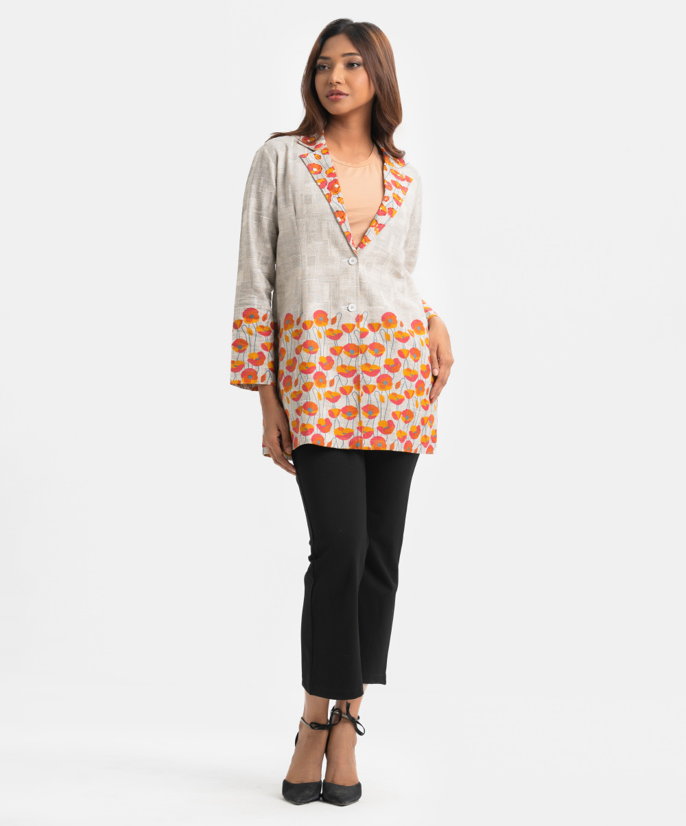 Women’s printed jacket in cotton fabric. Notch collar, long sleeves. Button fastening at the front and two sides pockets.