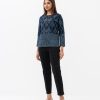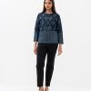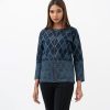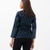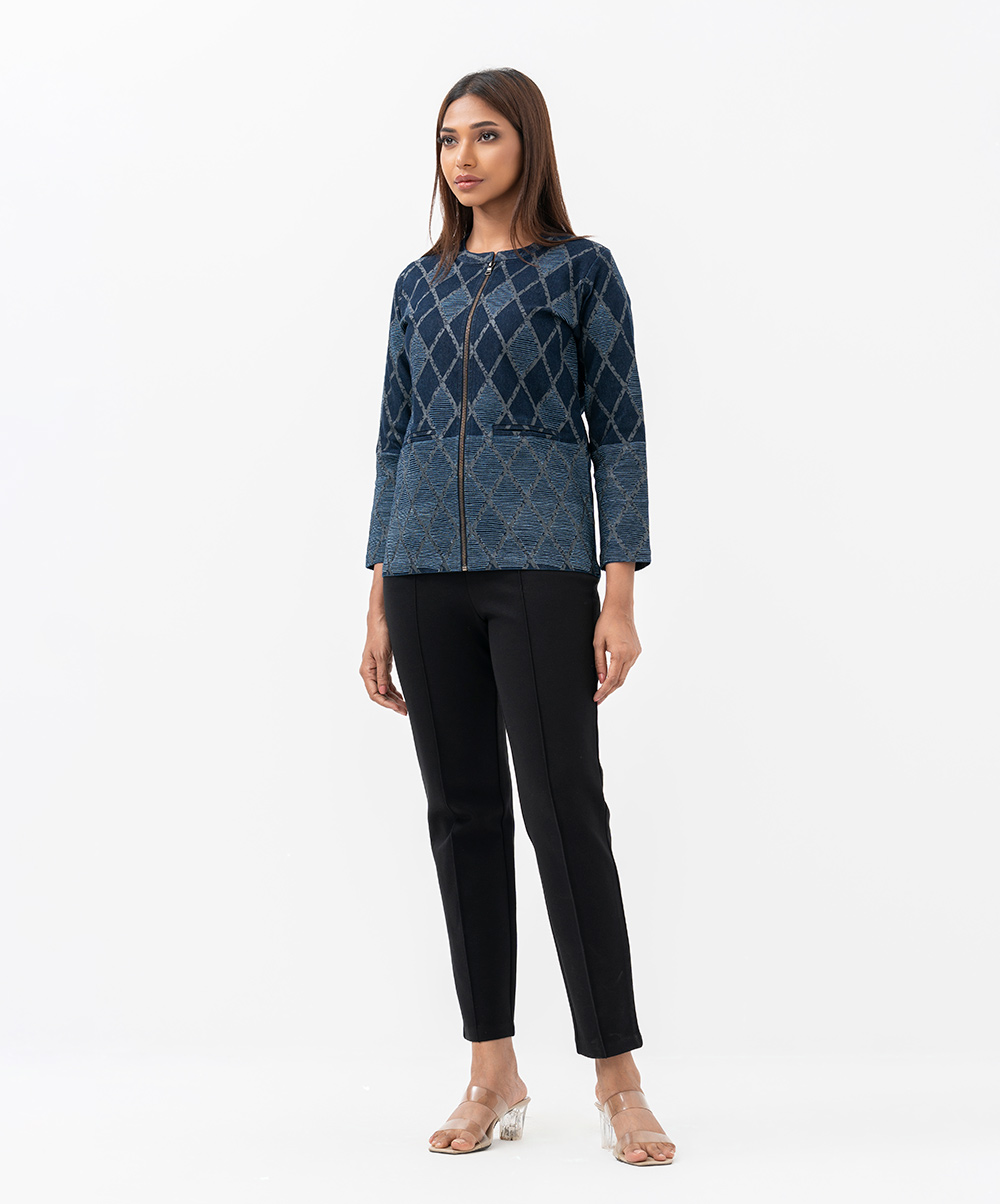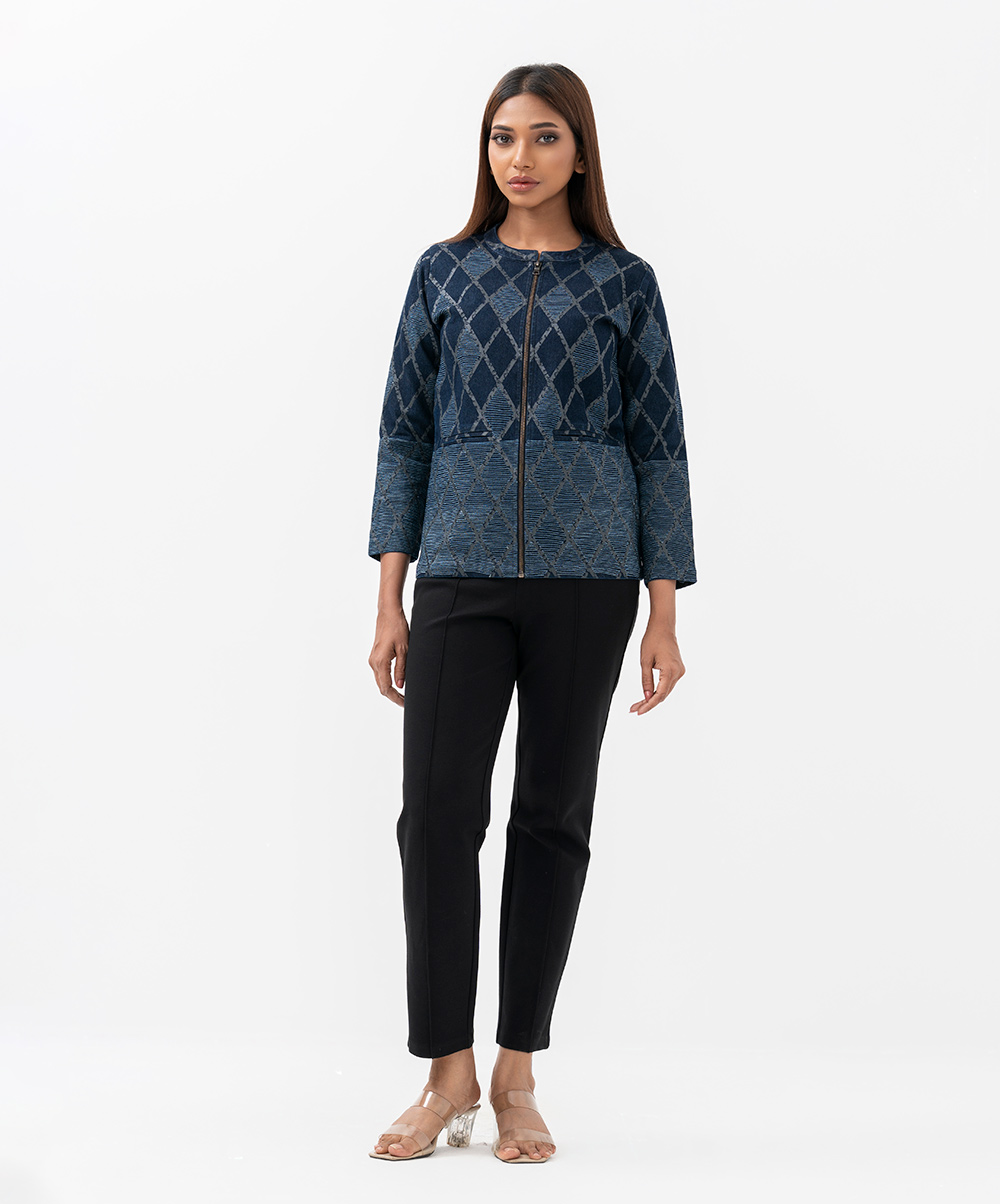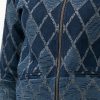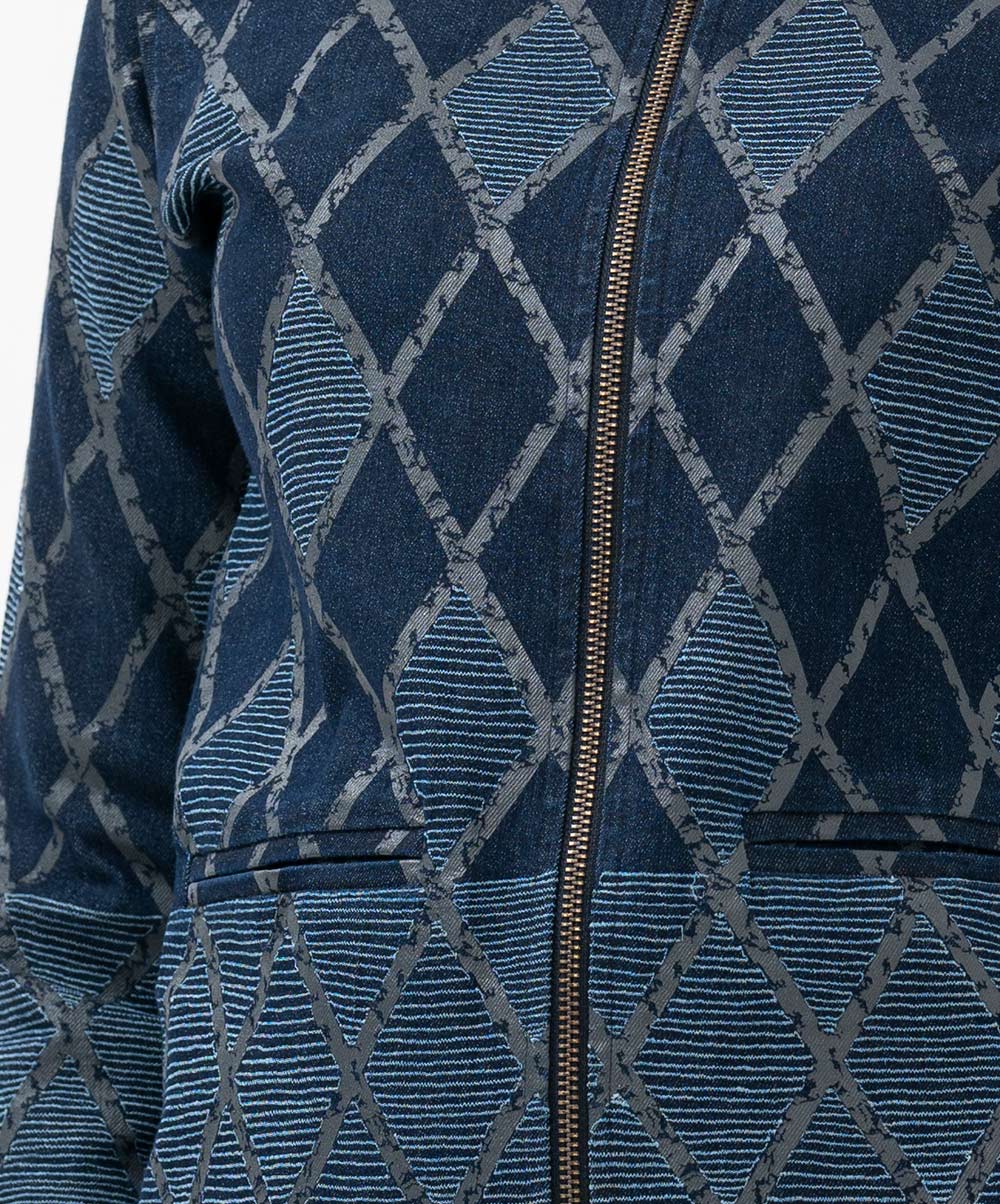 Women’s diamond pattern jacket in denim fabric. Full-sleeved and stand collar. Front zipper opening and two jetted pockets. All over embroidery detail.