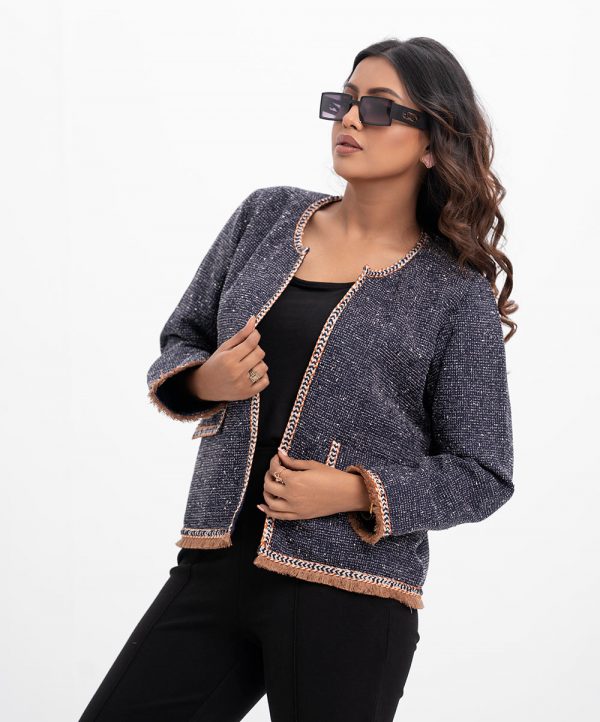 Open front jacket in cotton slub knit fabric. Woven border and fringe trims on the edge. Round neck, double flap pockets at the front. Full taffeta lining inside.