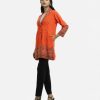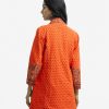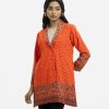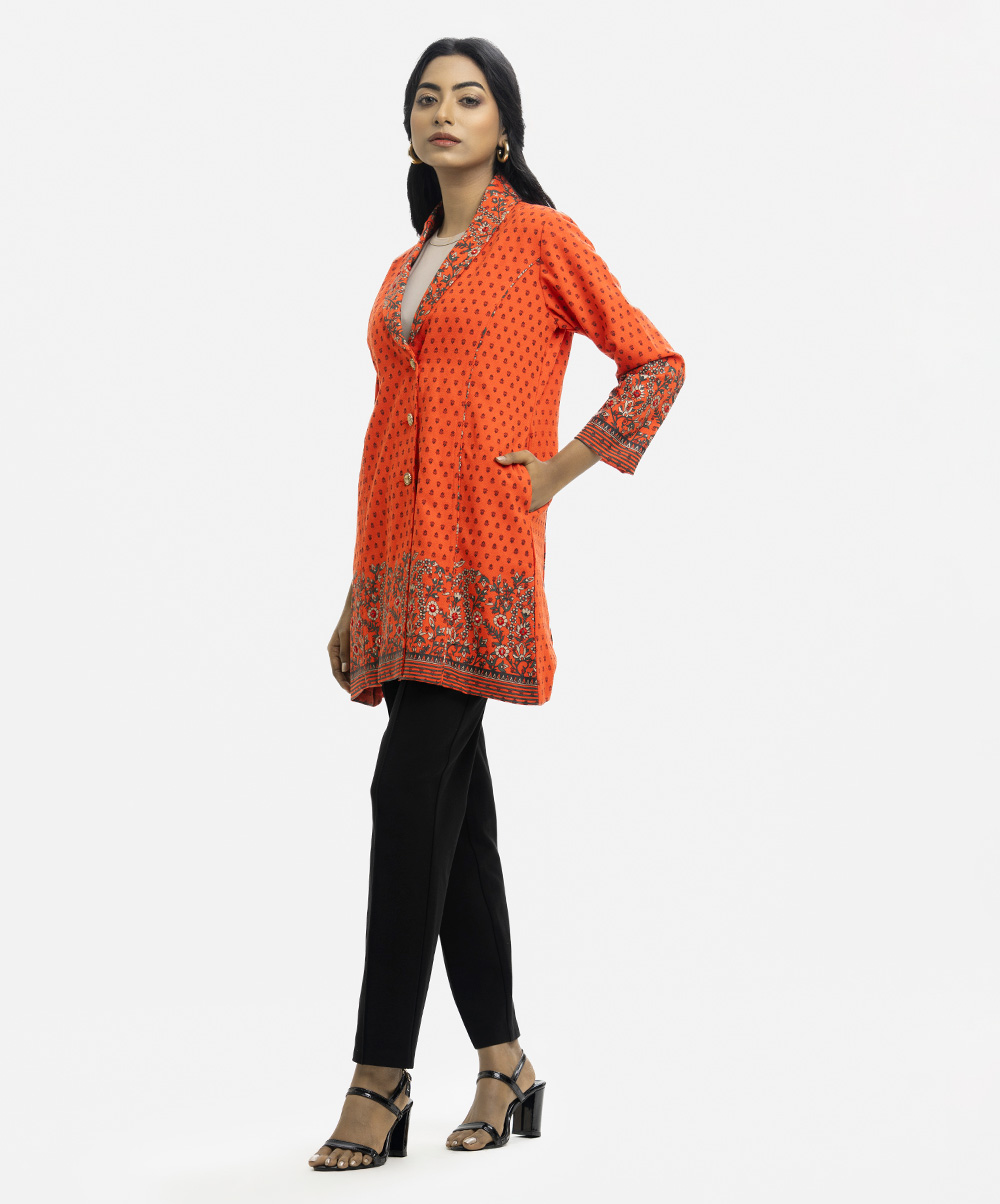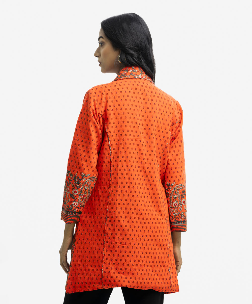 Women’s winter printed jacket in tencel & rayon blended fabric with viscose lining. Floral print with karchupi detail at shawl collar, full sleeves cuff and hemline. Buttons open at front.