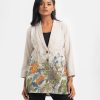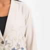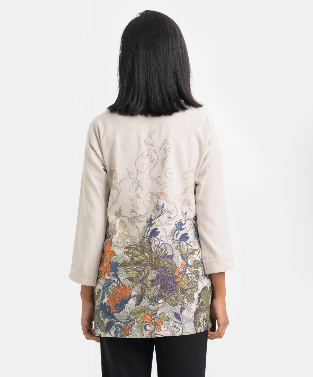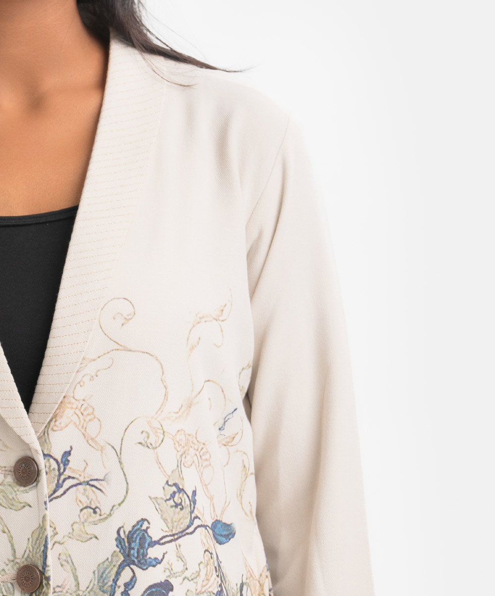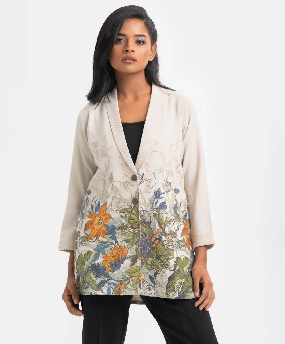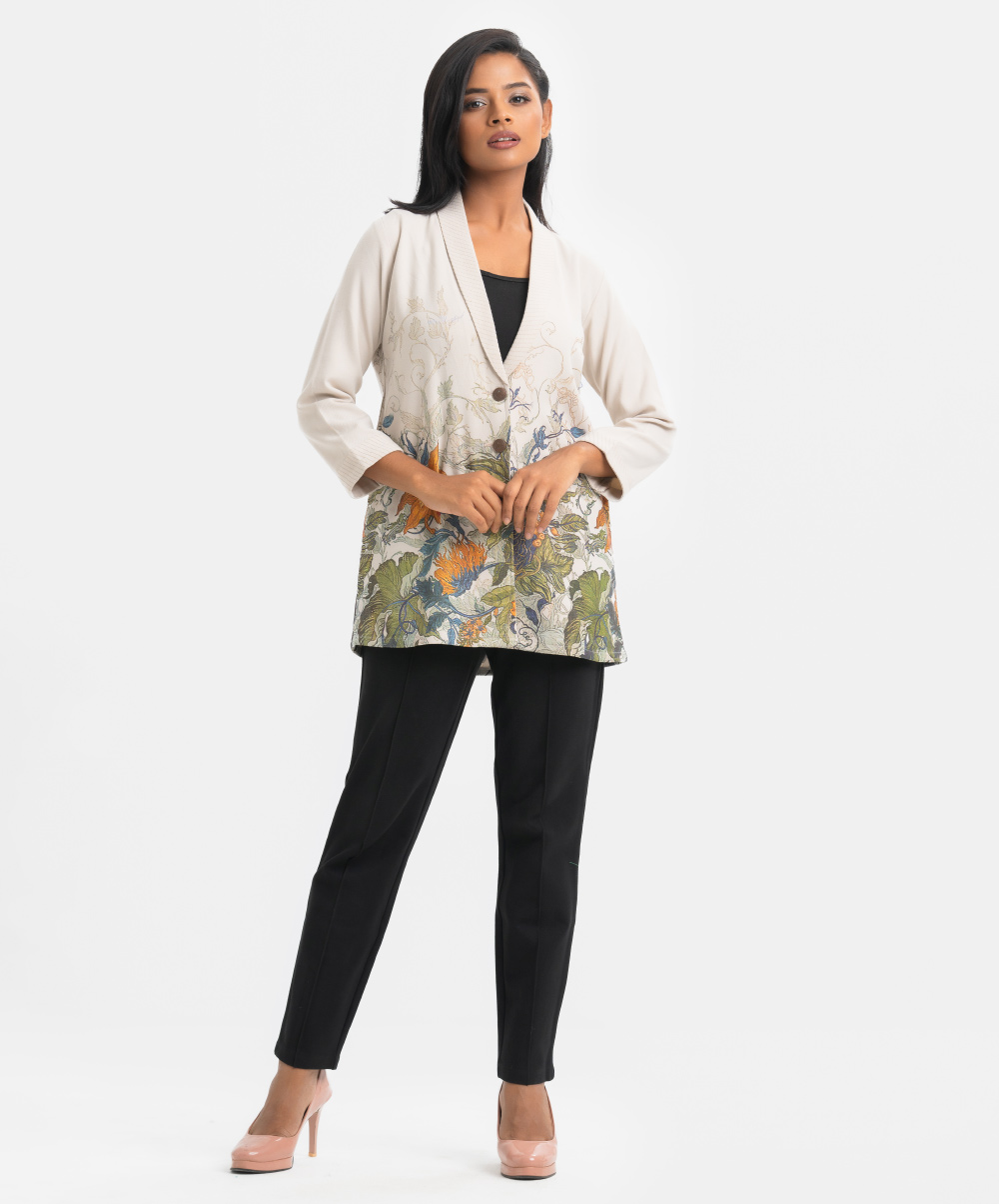 Women’s winter single-breasted printed jacket in twill fabric. Embroidery work on the shawl collar and full sleeves hem. Inseam side pockets.