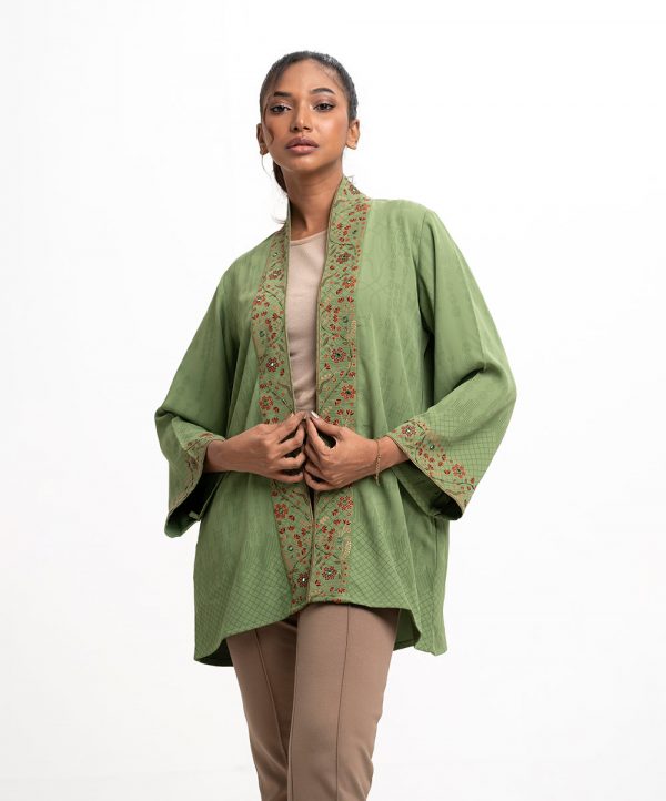 Women’s winter open front jacket in stretched tencel fabric. Full bell sleeves and inseam side pockets. Karchupi at front and sleeves.