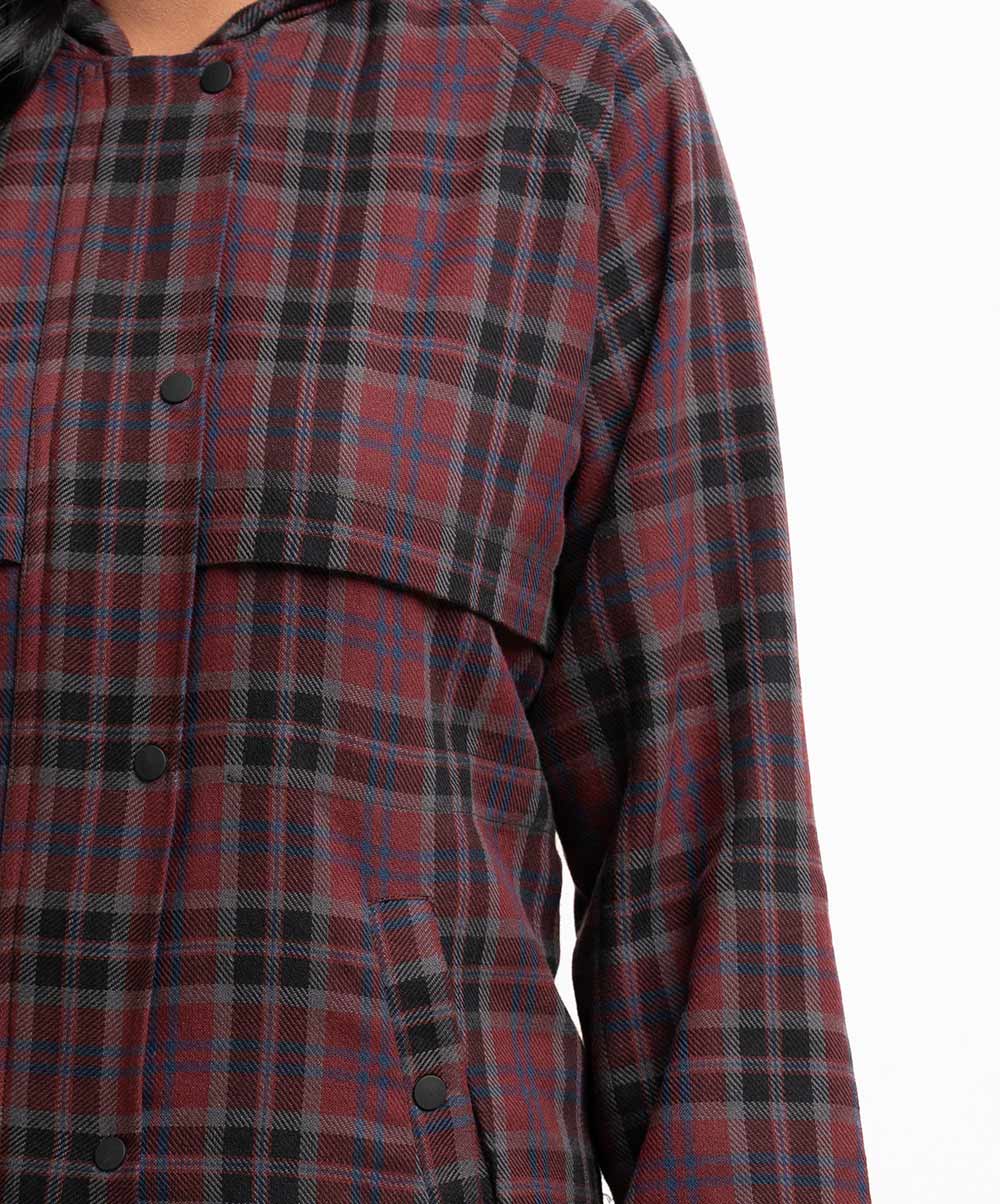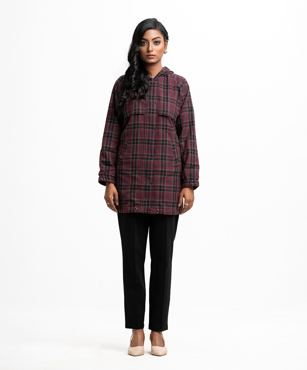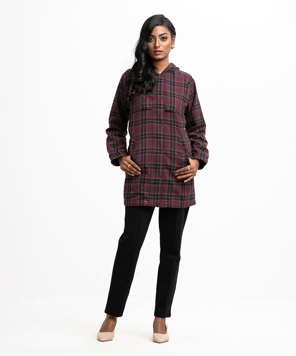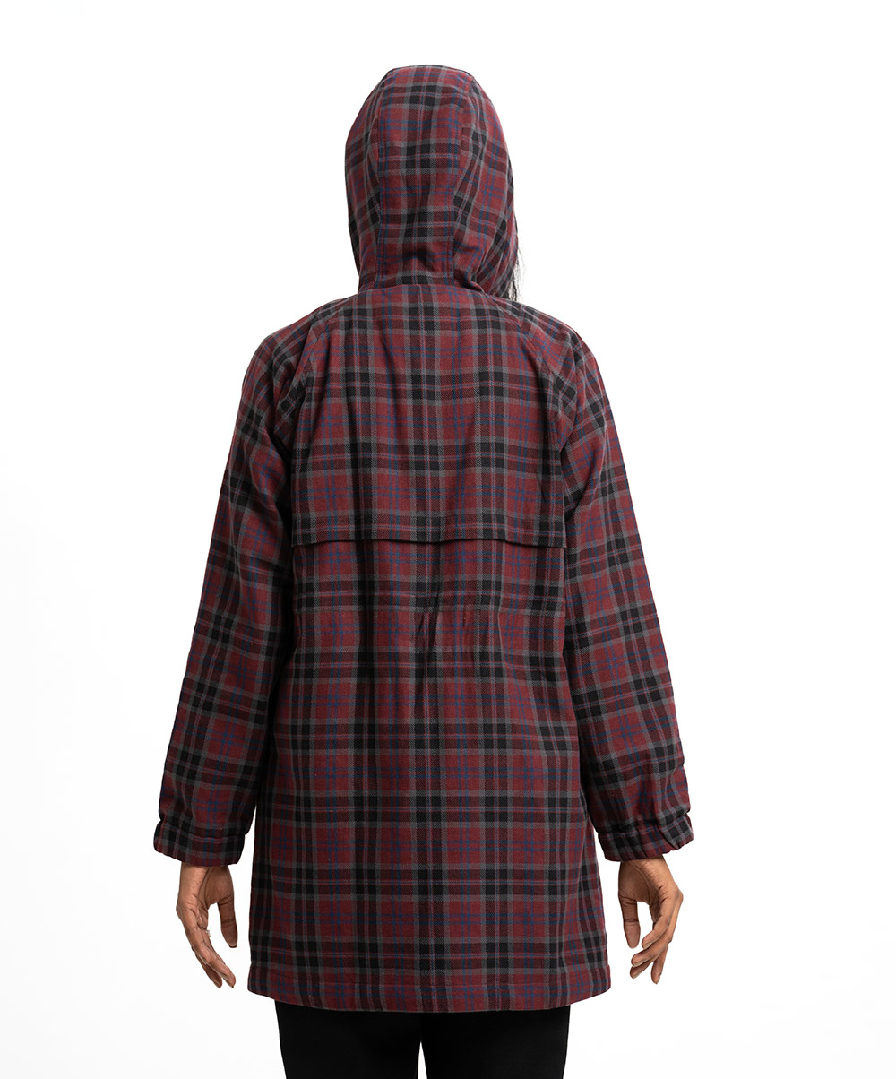 Women’s winter check hoodie Jacket in flannel fabric. Drawstring hood, full sleeves. Hidden zipper at front with show buttons & kangaroo pockets.