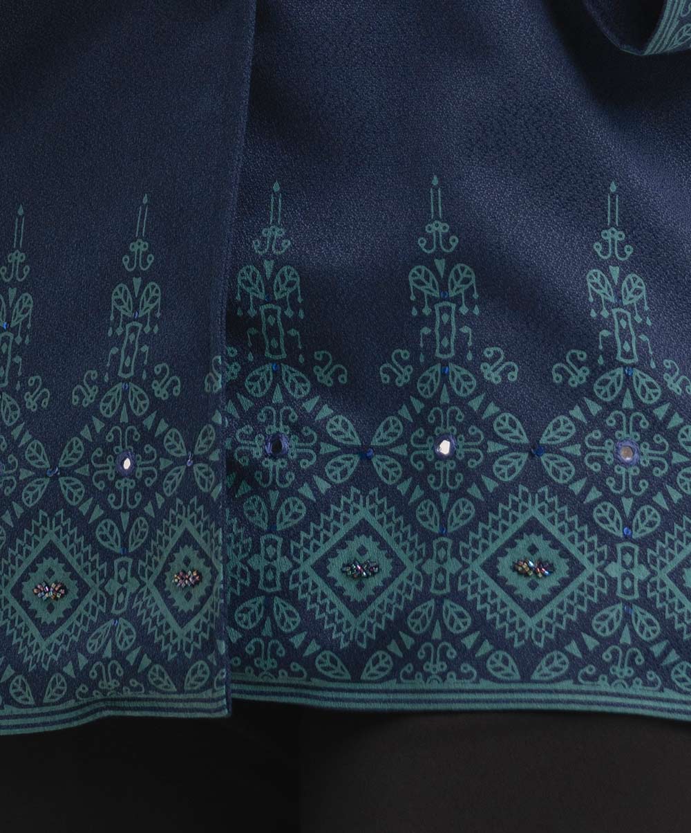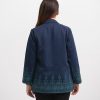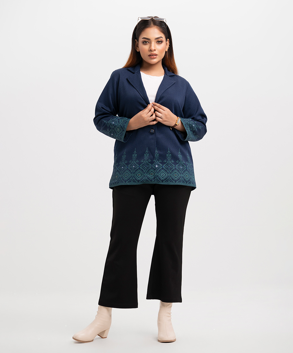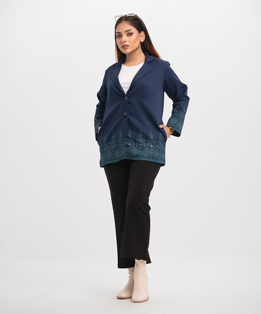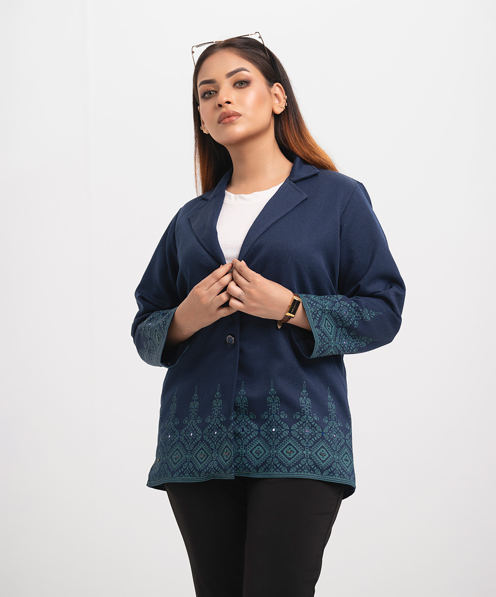 Exclusive women’s Jacket in rayon-blend fabric. Lapel collar, full sleeves. Single-breasted, inseam pockets. Karchupi at hemline.