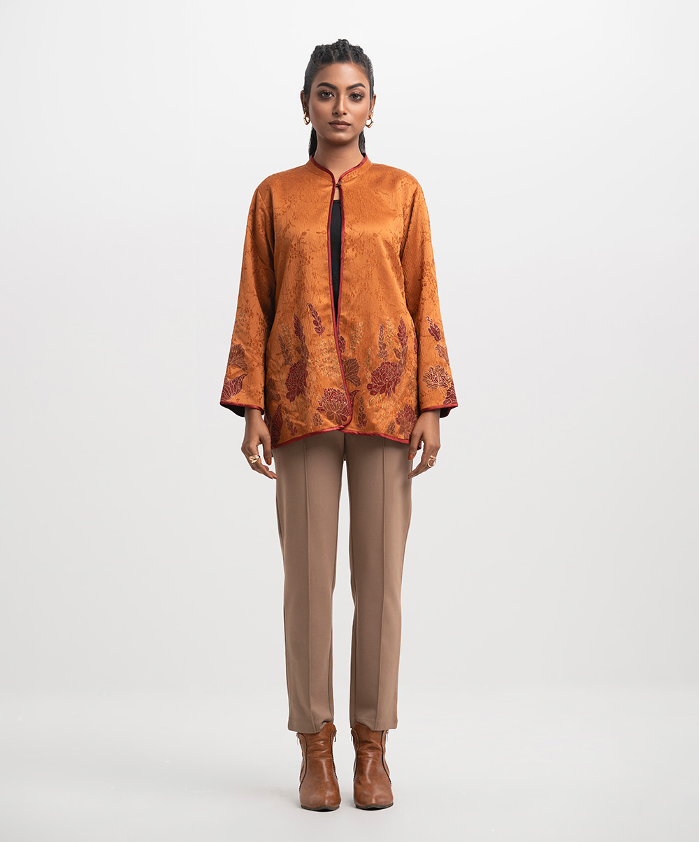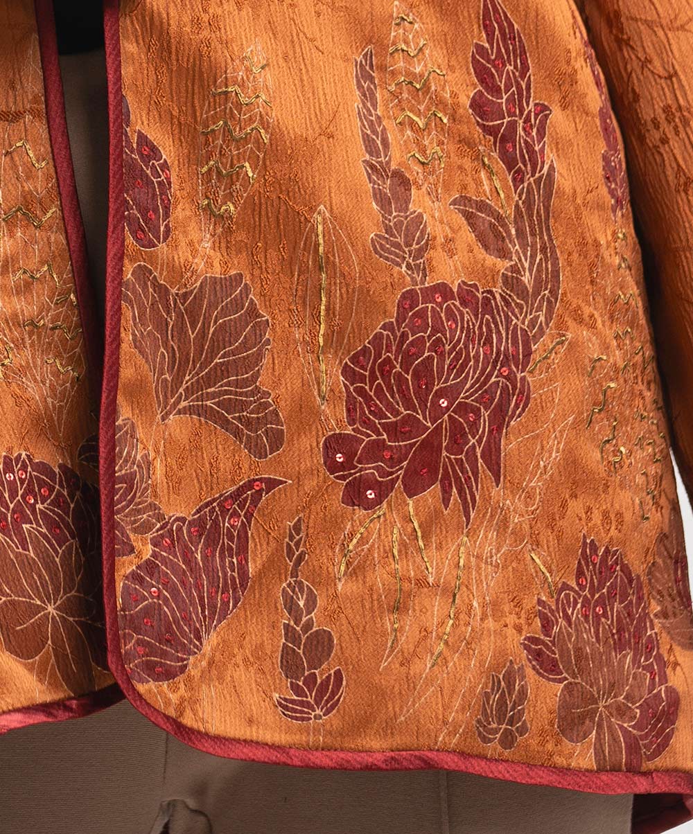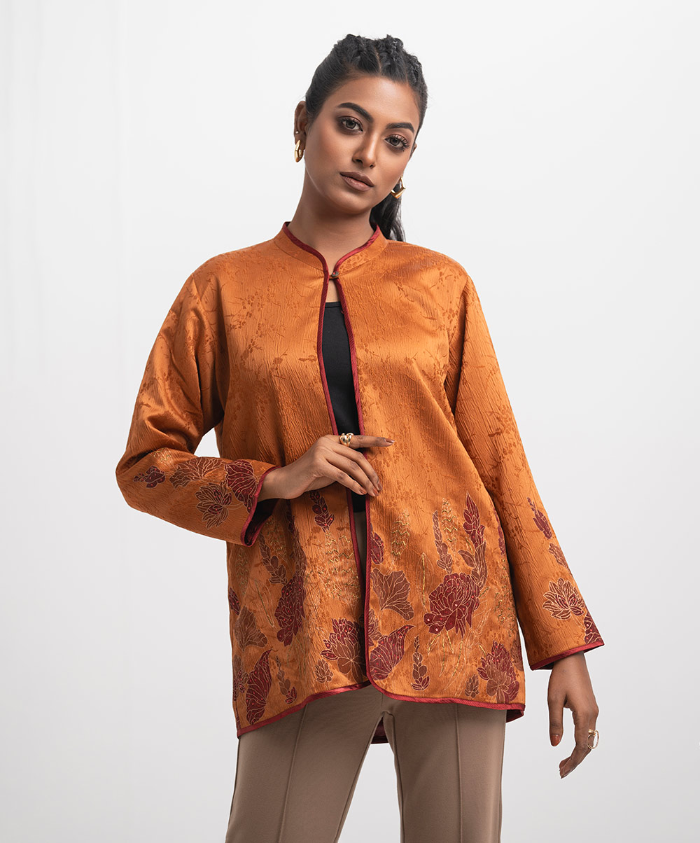 Single-button, open front jacket in jacquard satin fabric. Full crepe lining inside. Sequin details at the front and cuffs.