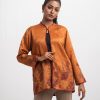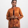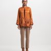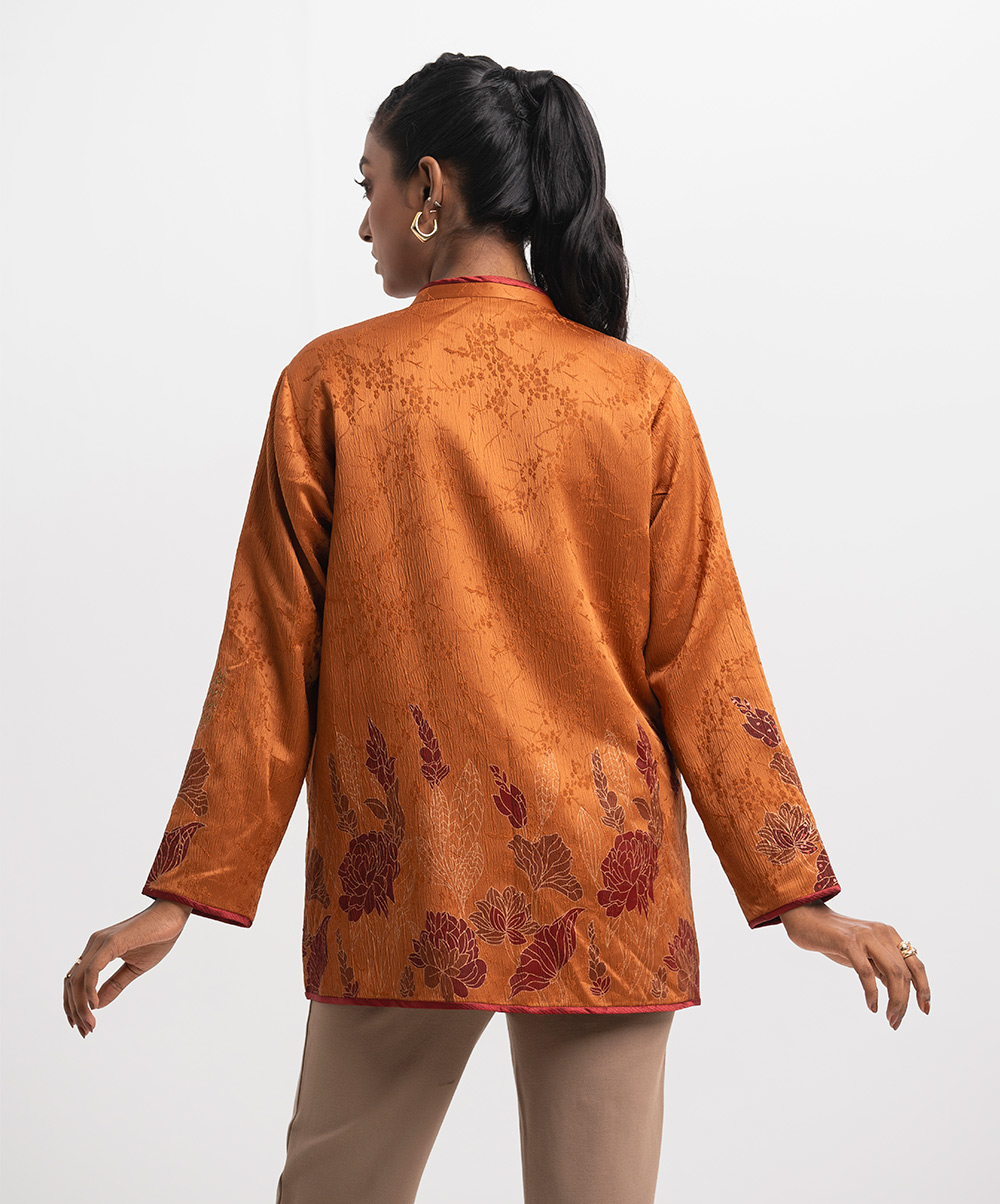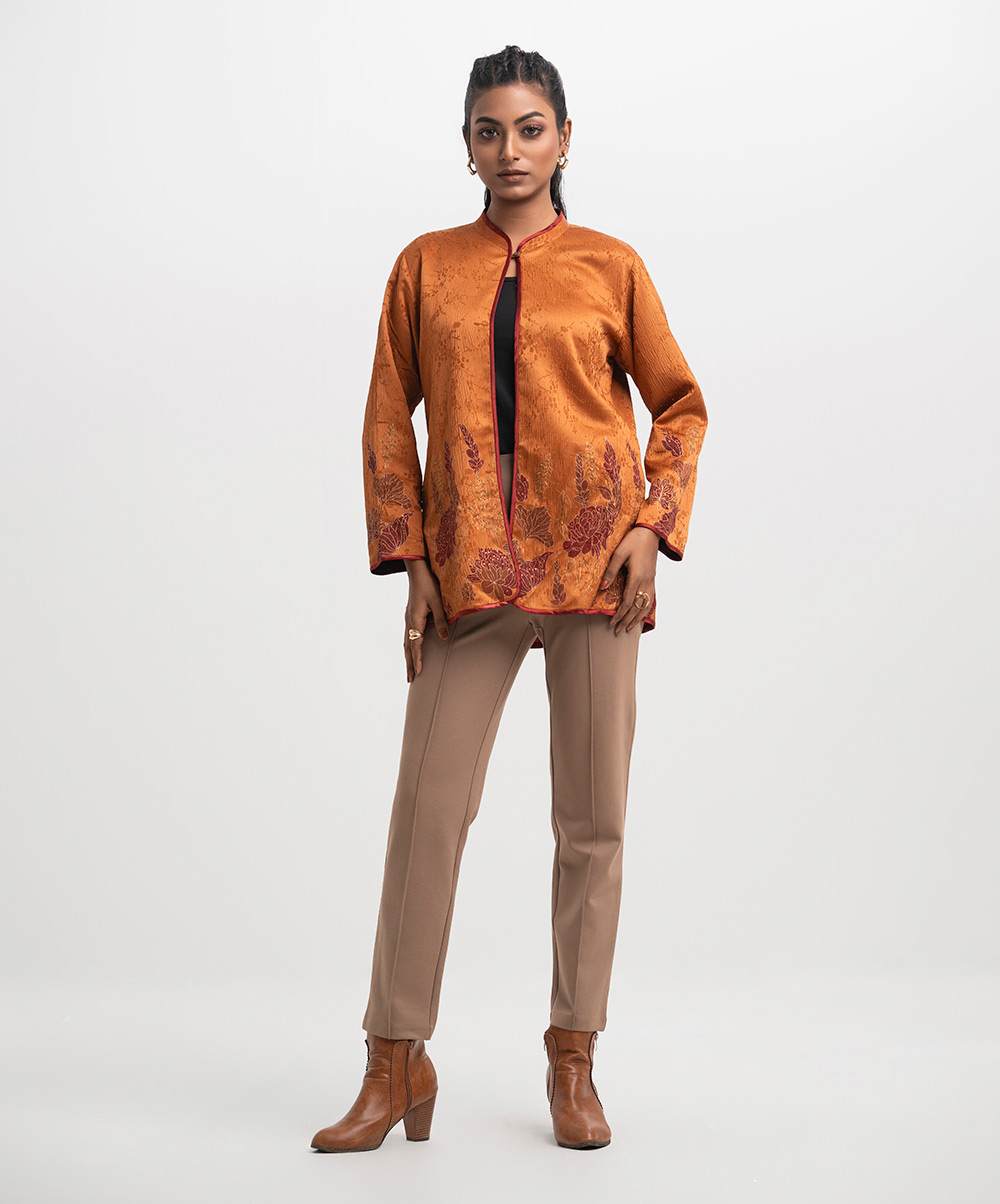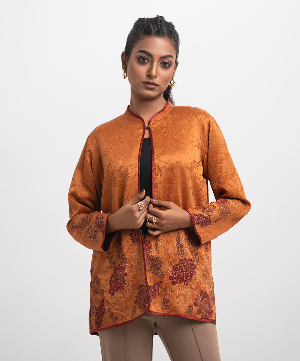 Single-button, open front jacket in jacquard satin fabric. Full crepe lining inside. Sequin details at the front and cuffs.