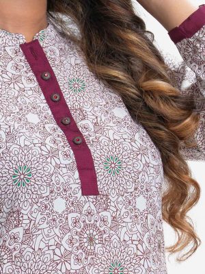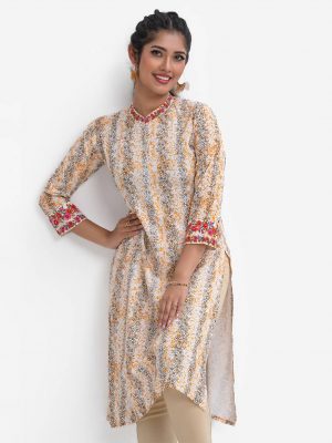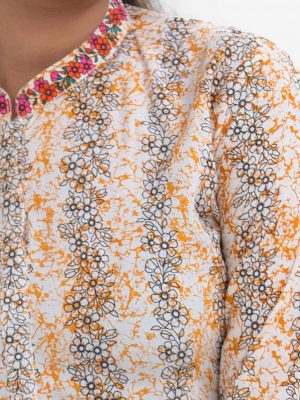 White straight-cut kameez on viscose fabric with allover floral print. Comes with matching yellow piping on the hems and 3/4-length sleeves.