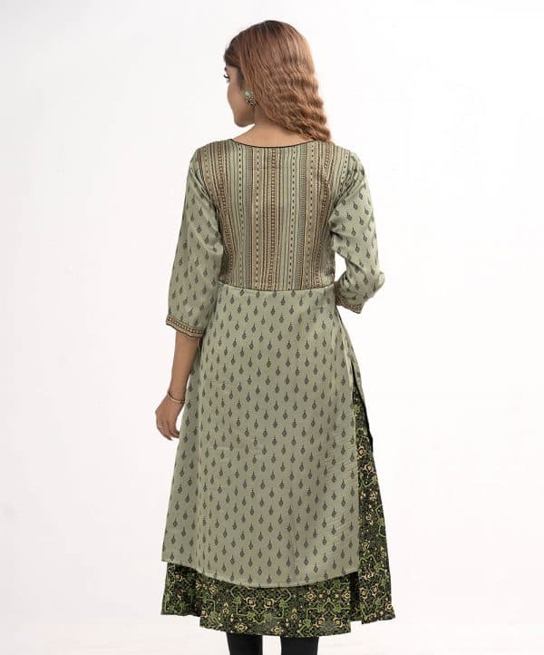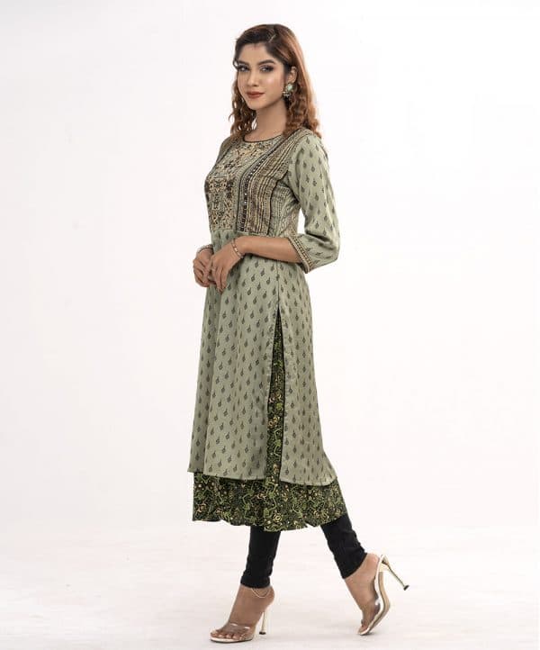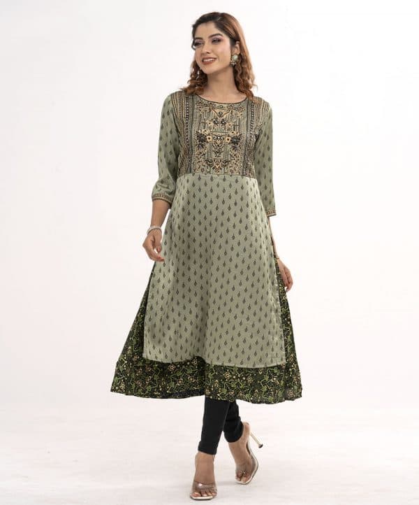 Boat neck and two-layer dress with all over screen print, karchupi on the front part