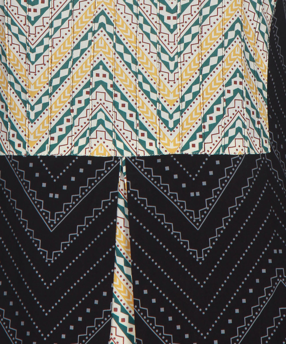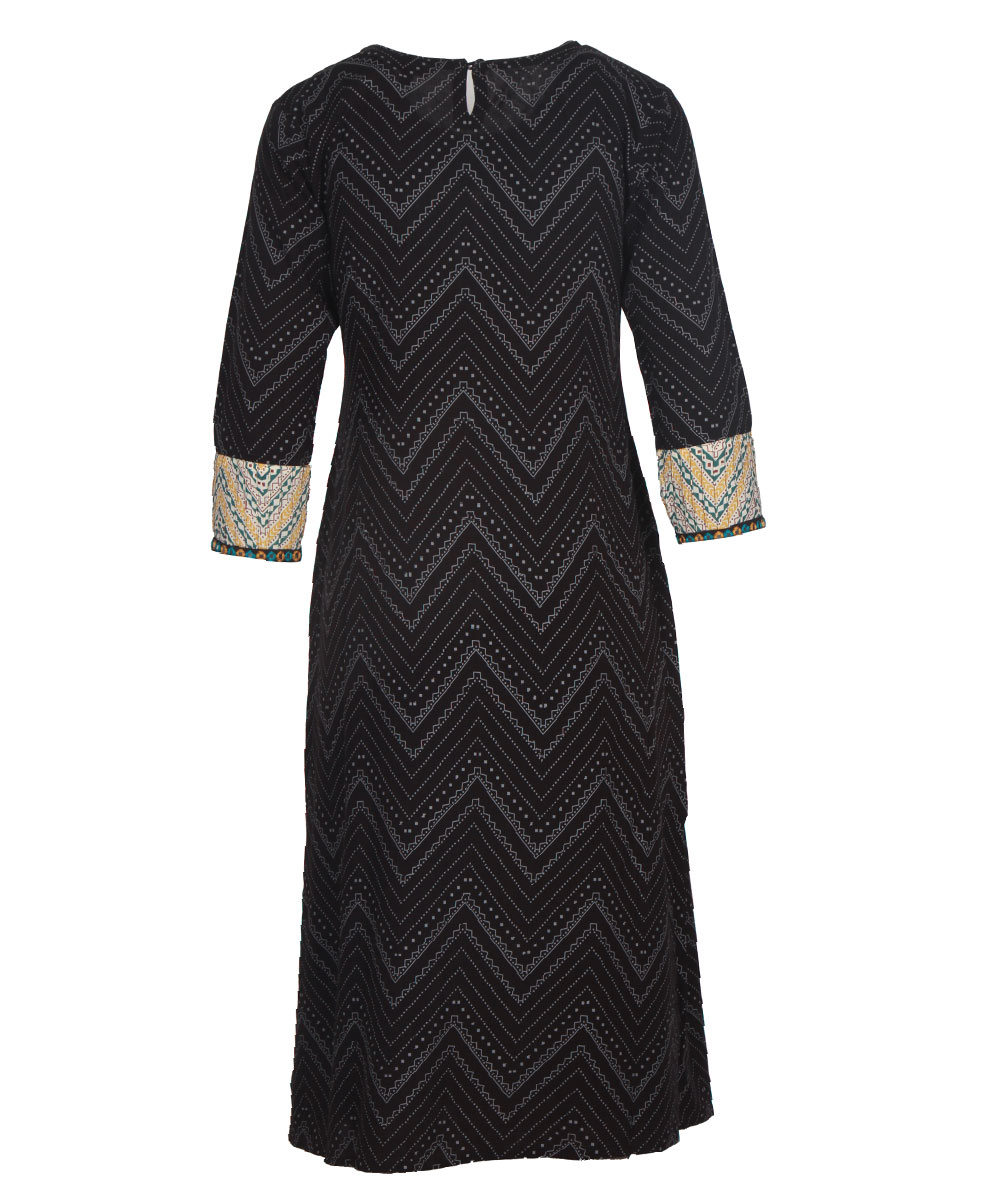 Black viscose patterned kameez with allover print and panel from waistline. Designed with contrast pleated yoke in front and embroidery on sleeves opening.
