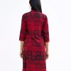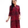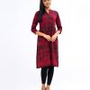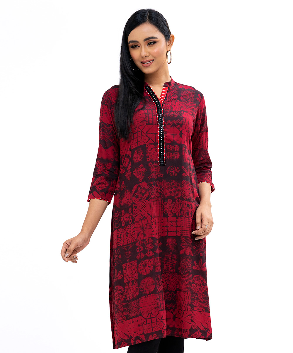 Red all-over printed straight cut kameez in viscose fabric. Three-quarter sleeved with a standing V neck and karchupi on placket.