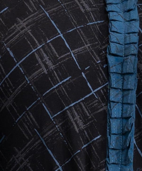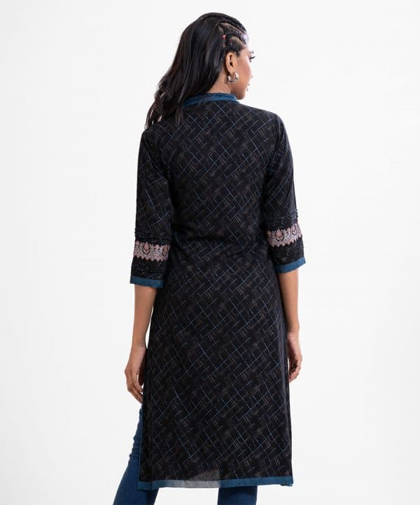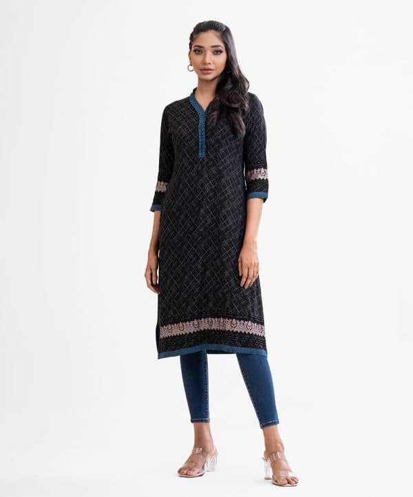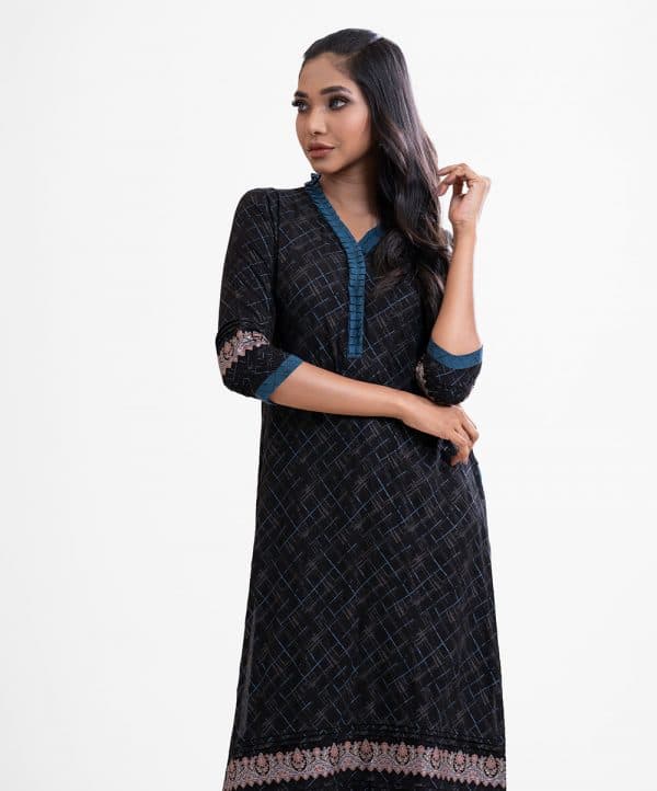 Printed straight kameez in viscose fabric. Ruffle V-neck, three-quarter sleeves. Pin tuck and patch attach at sleeves and bottom line.