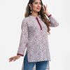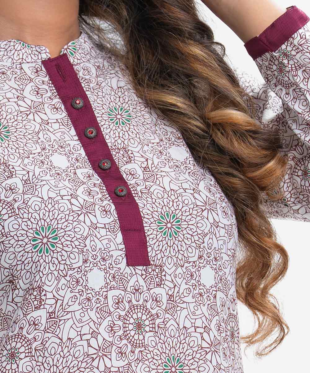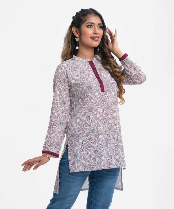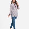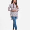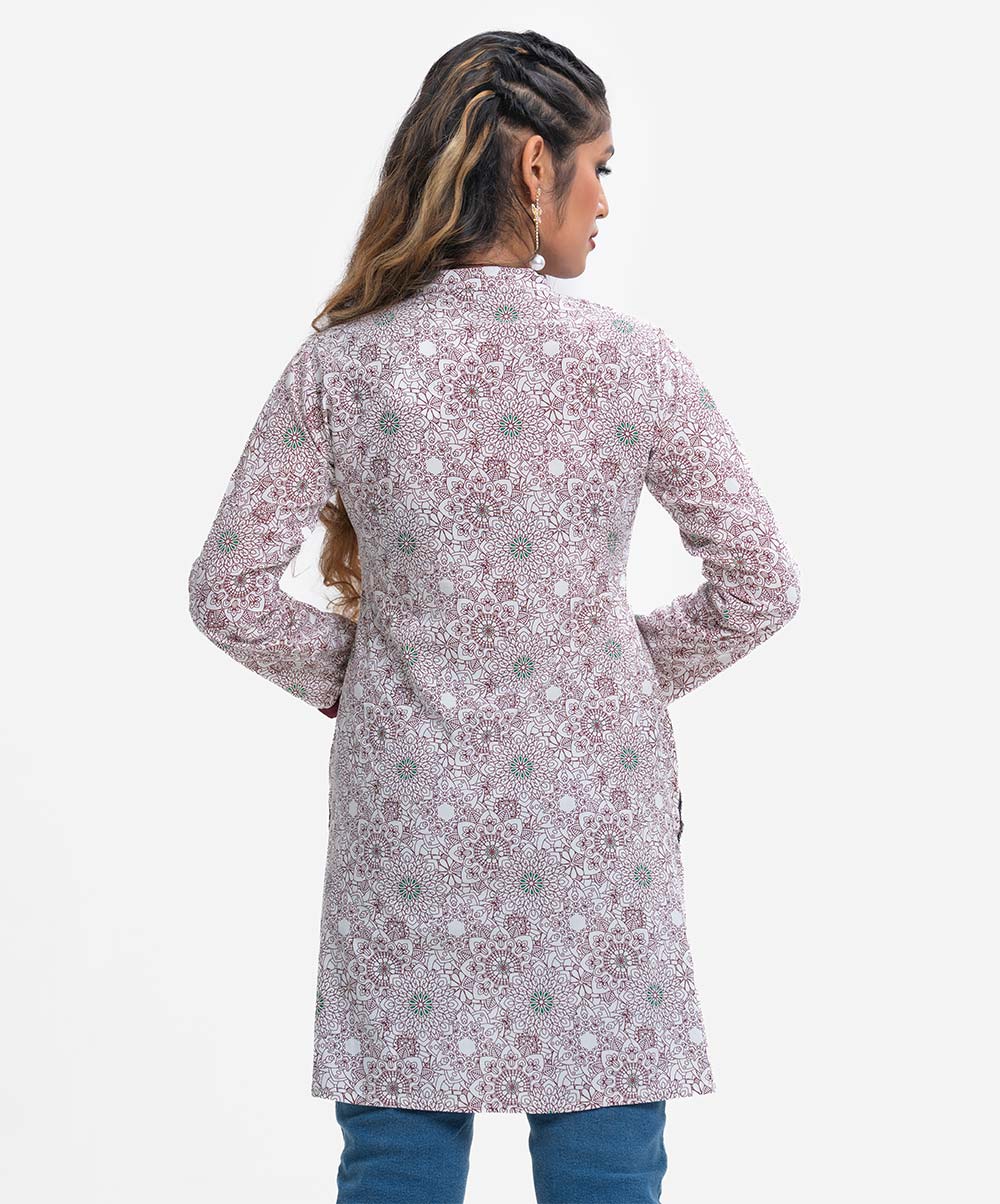 Women’s printed straight kameez in viscose fabric. Mandarin collar with buttons placket, full sleeves. High-low hem.