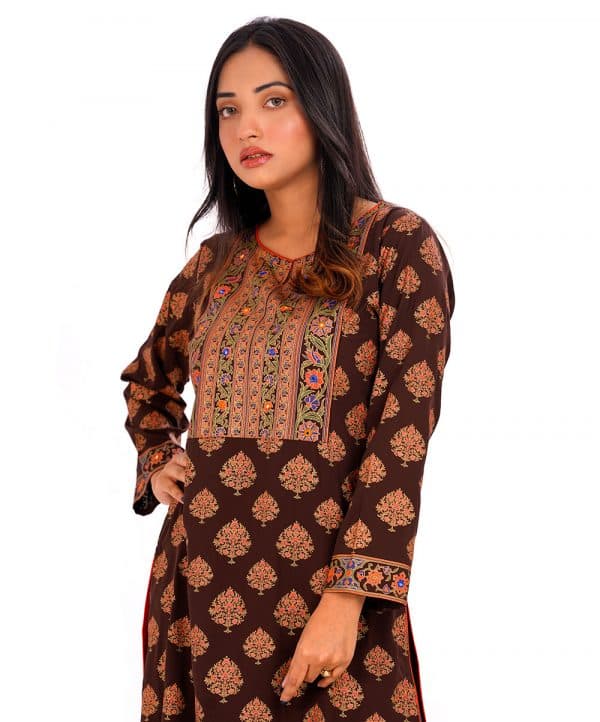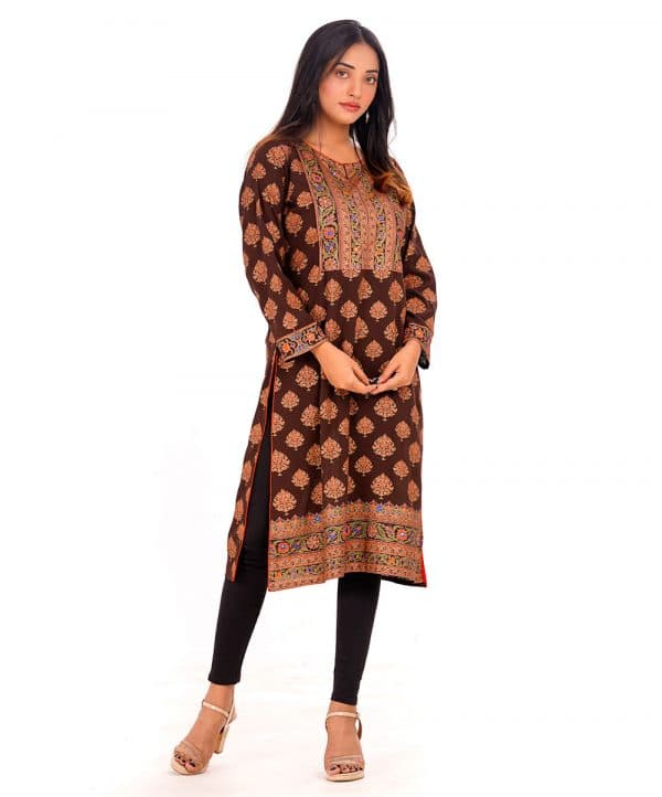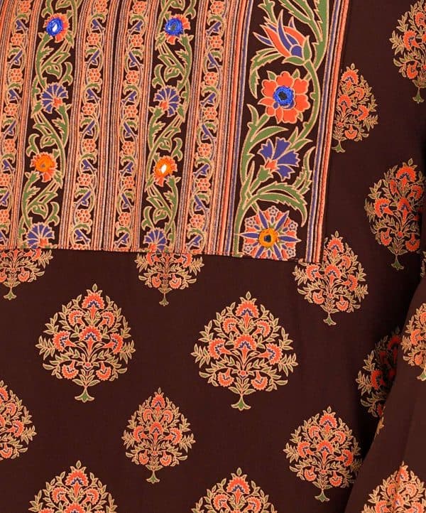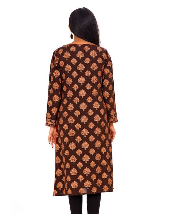 Brown all-over printed straight-cut Kameez in Georgette fabric. Designed with a round neck and full sleeves. Embellished with karchupi at the front. Unlined.