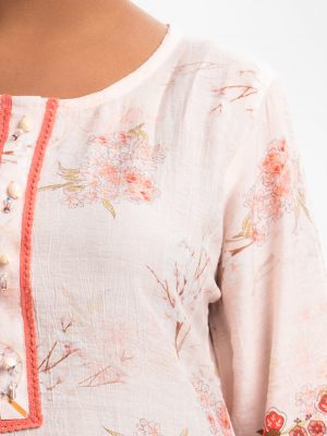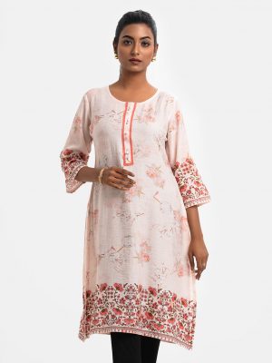 Women’s printed straight kameez in viscose fabric. High neck, full sleeves. Karchupi at the front and sleeves.