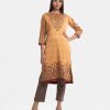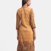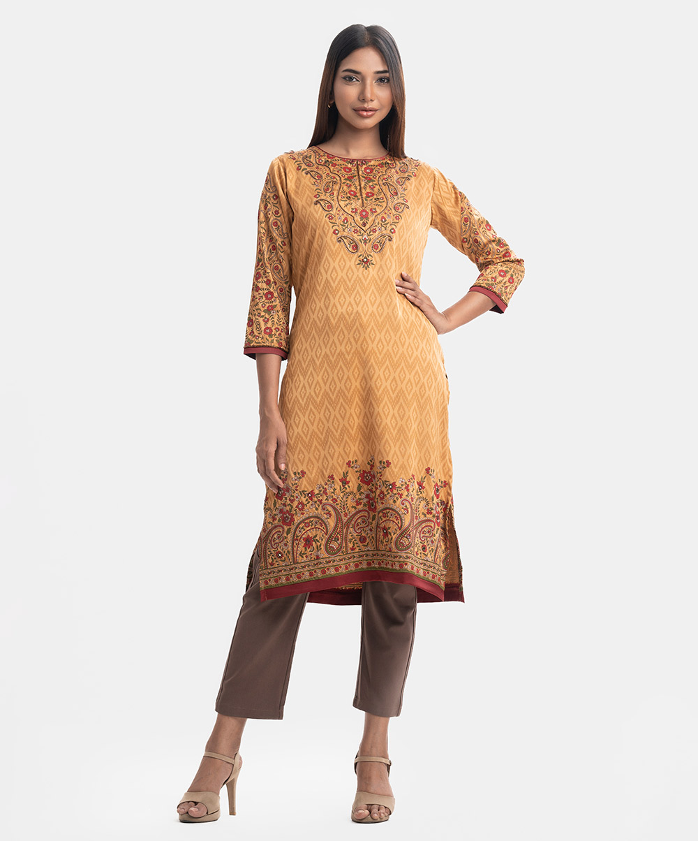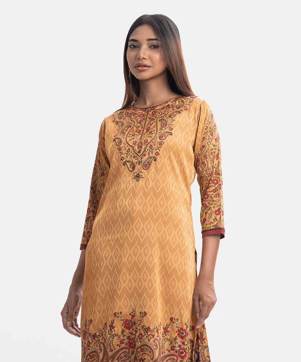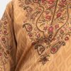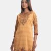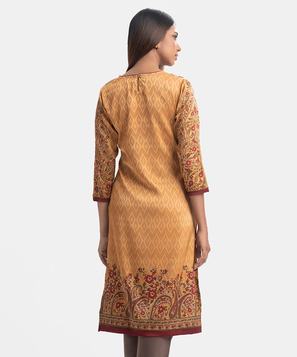 Round-neck A-line kameez in satin-georgette fabric. Three-quarter sleeves. Karchupi detailed.