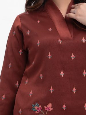 Printed straight kameez in crepe fabric. Round neck, full-sleeved with embroidery work. karchupi at the front and line stitching at the hemline.