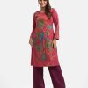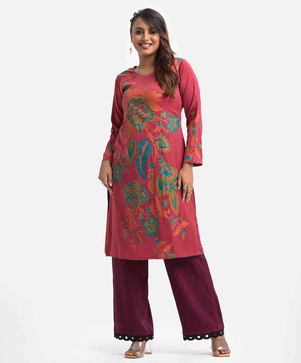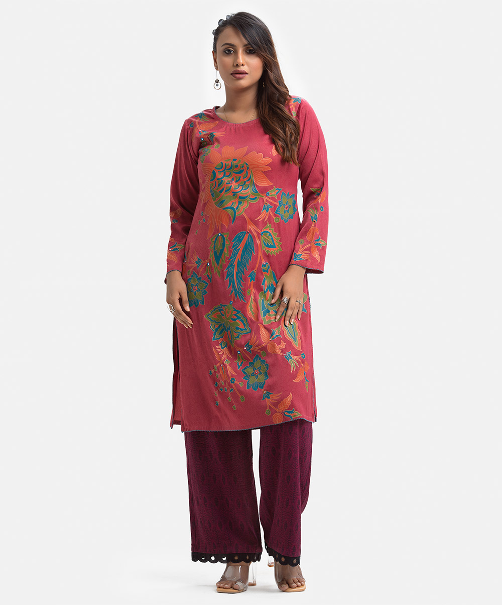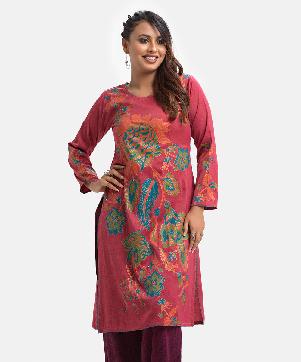 Women’s floral printed straight kameez in joom fabric. Full sleeves, round neck. Karchupi at the front and sleeves.