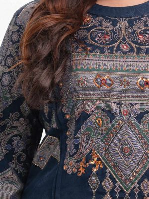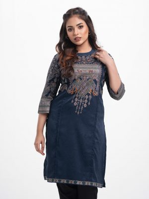 Women’s straight kameez in crepe fabric. Round neck , scallops at front and three-quarter sleeves hemline. Karchupi and print at the front.