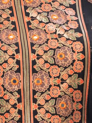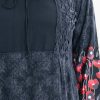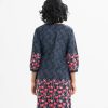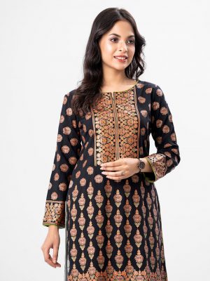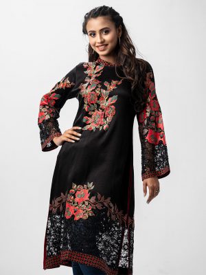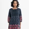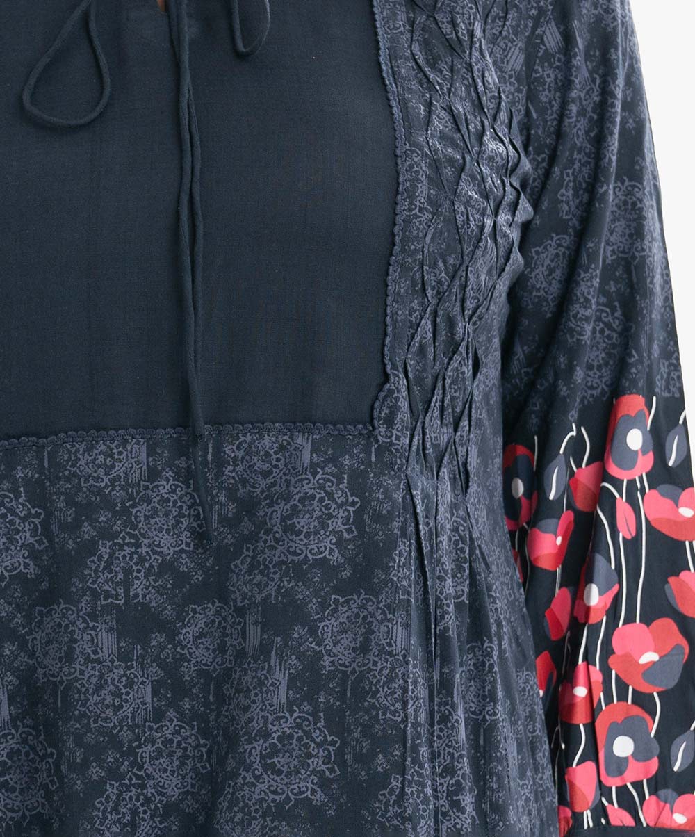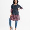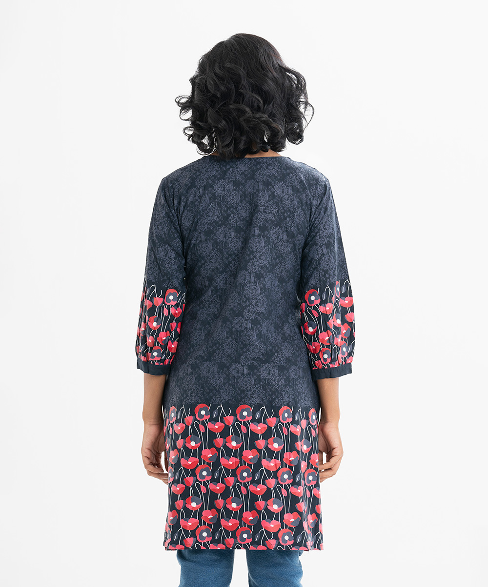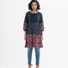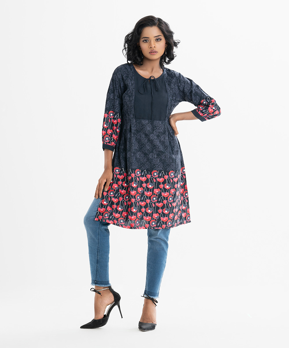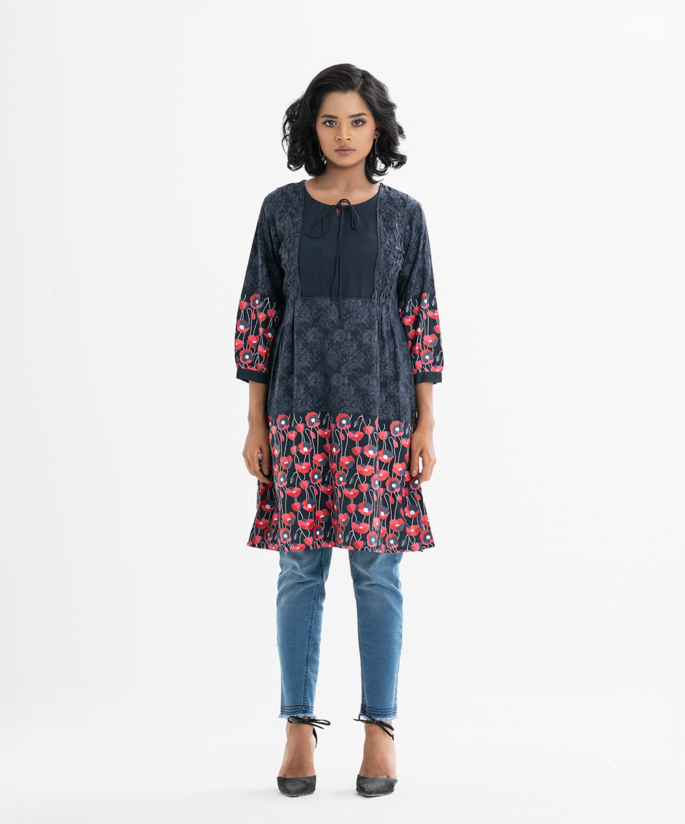 Women’s printed A-line kameez in cotton fabric. Round neckline with tie cord, three-quarter sleeves. Lace & diamond pintuck work at front.