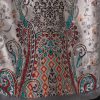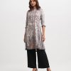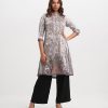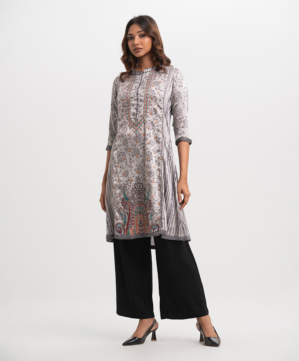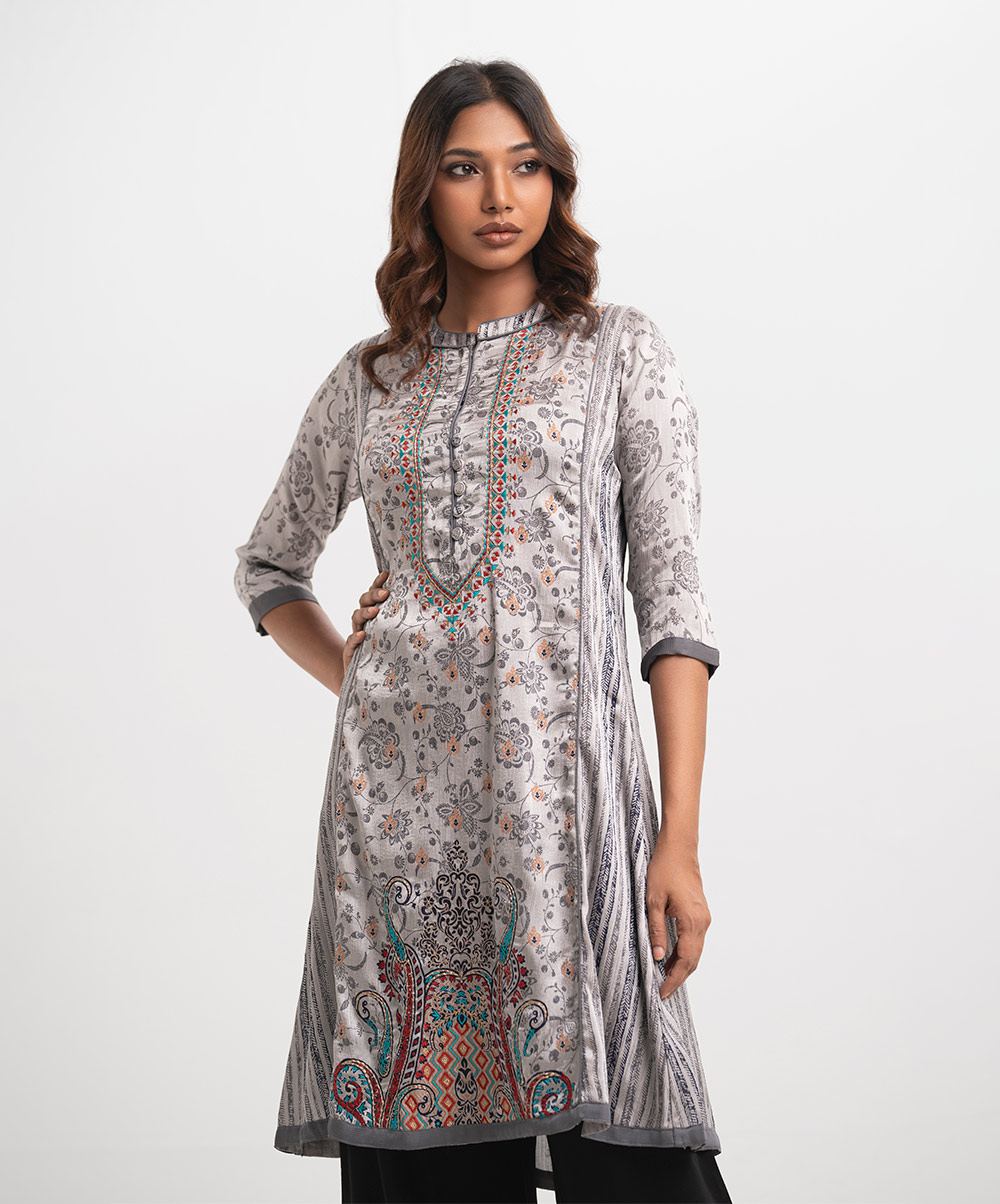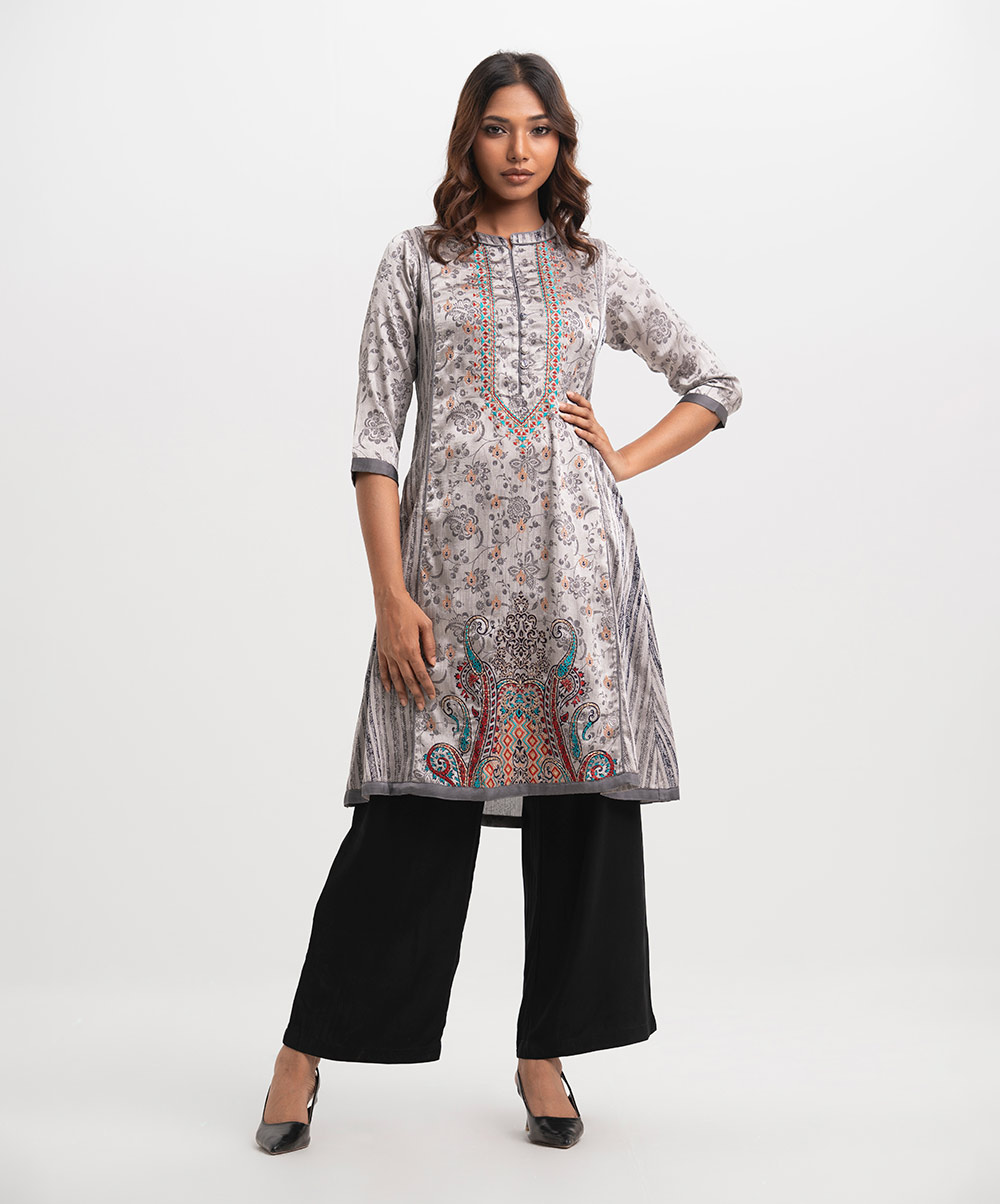 Women’s printed A-line kameez in textured georgette fabric. Mandarin collar with design buttons placket, three-quarter sleeves. Embroidery at front.