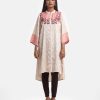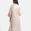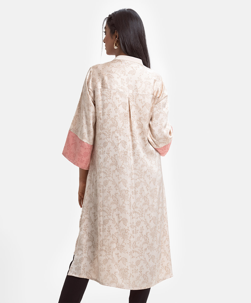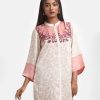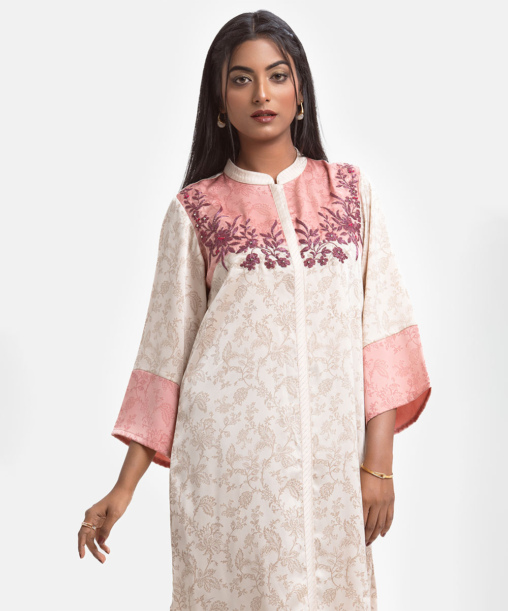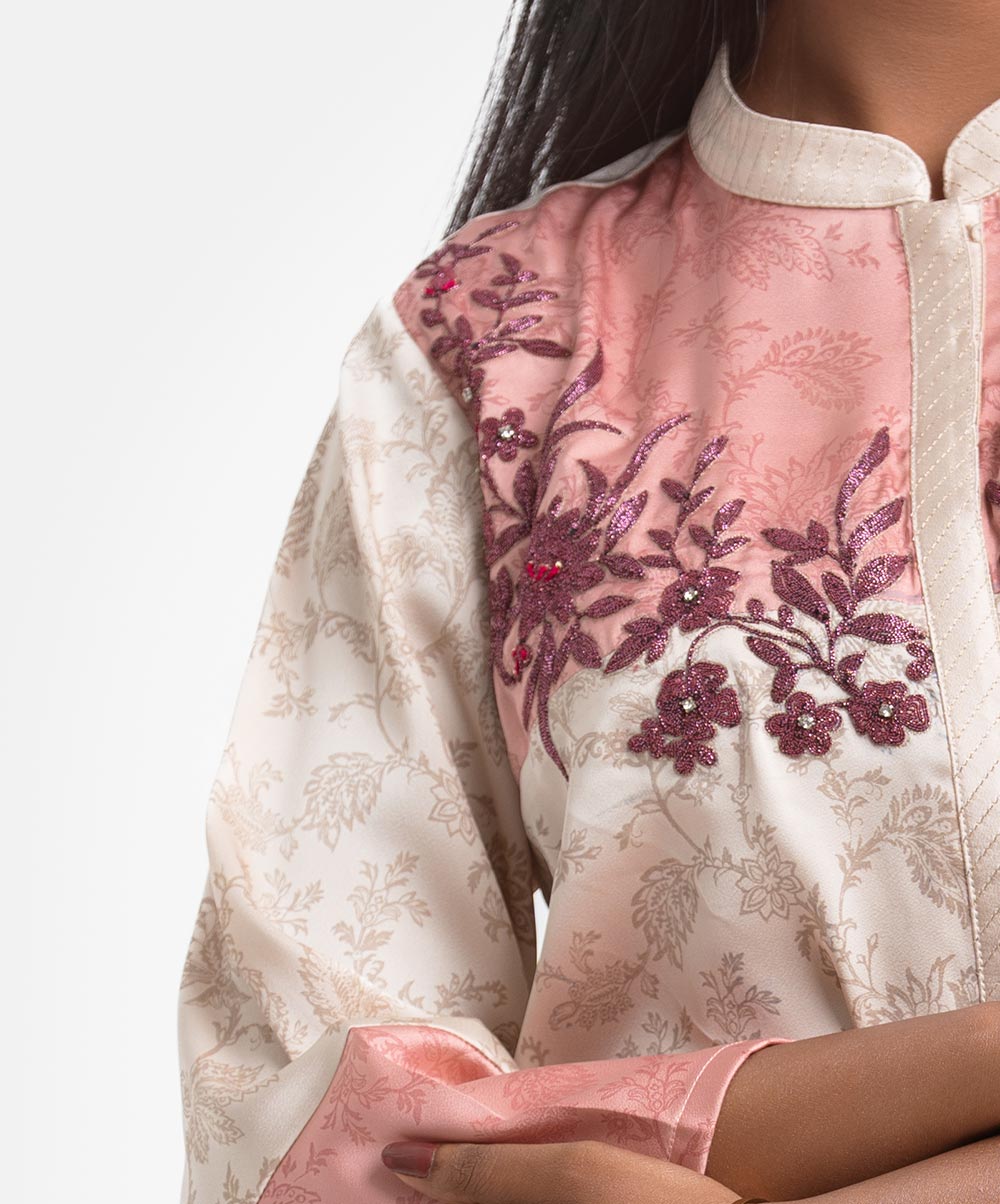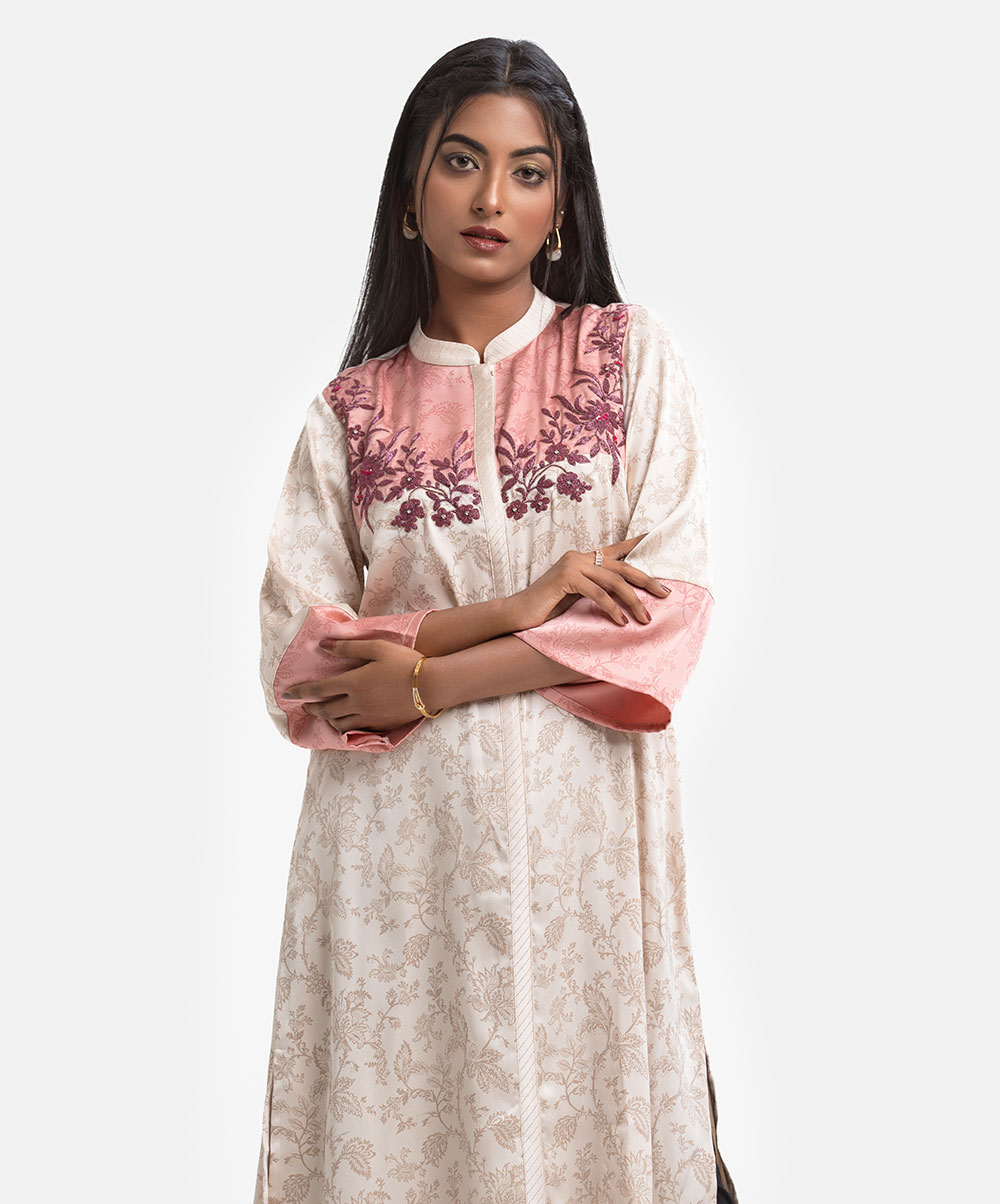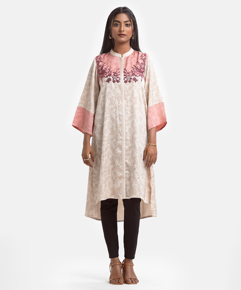 Women’s floral printed high-low hem kameez in georgette fabric. Bell sleeves, mandarin collar. Embroidery & karchupi at the front and sleeves.