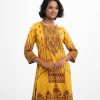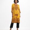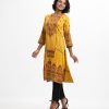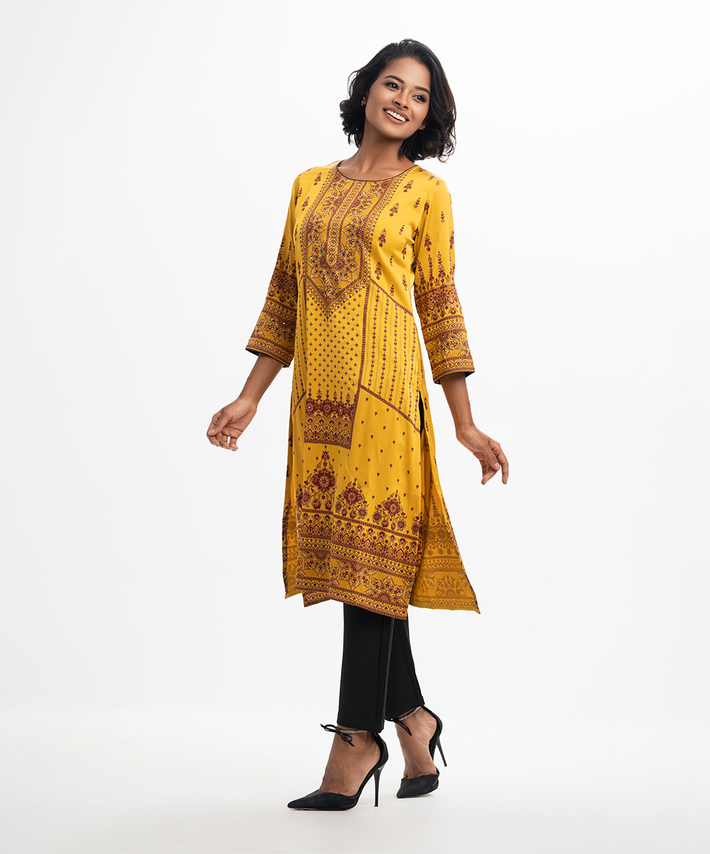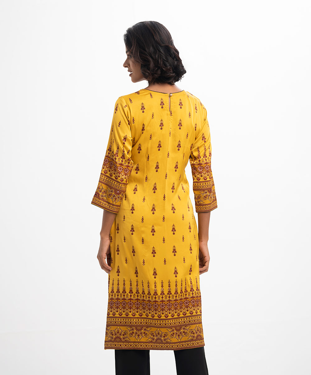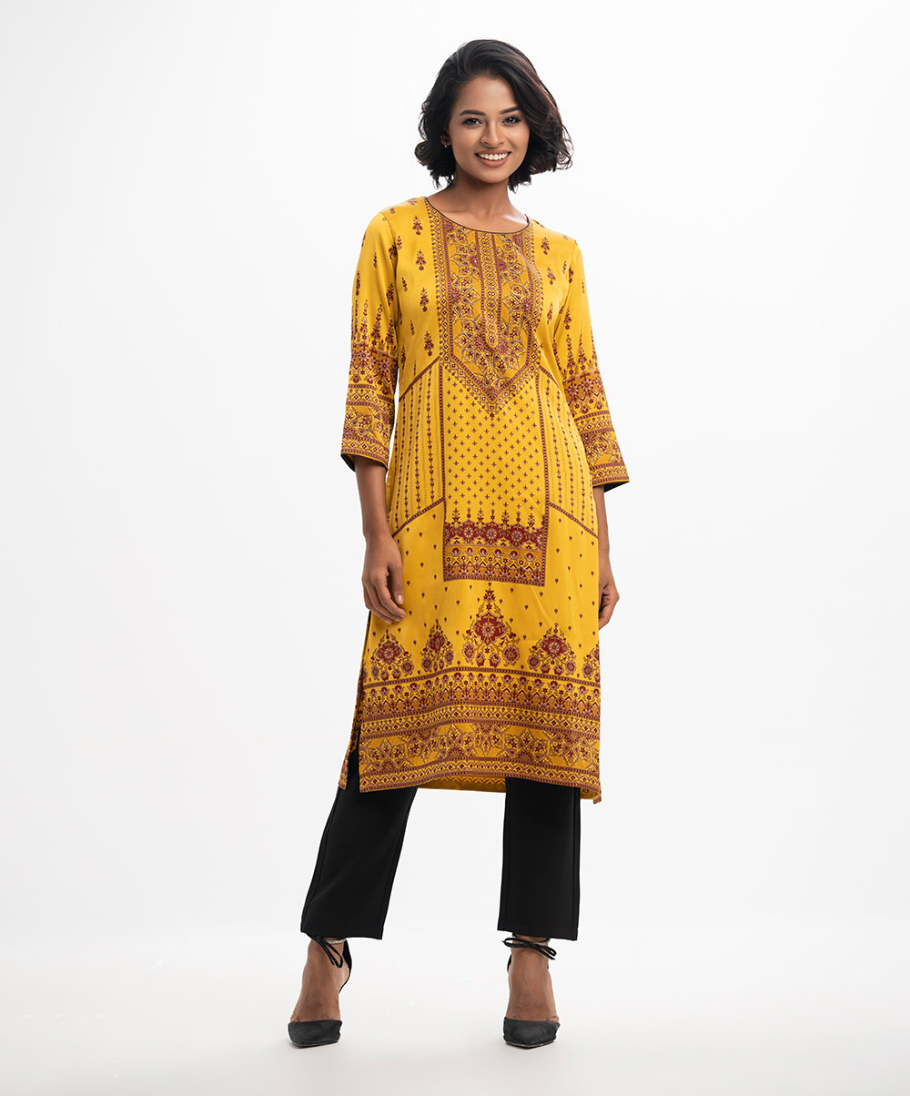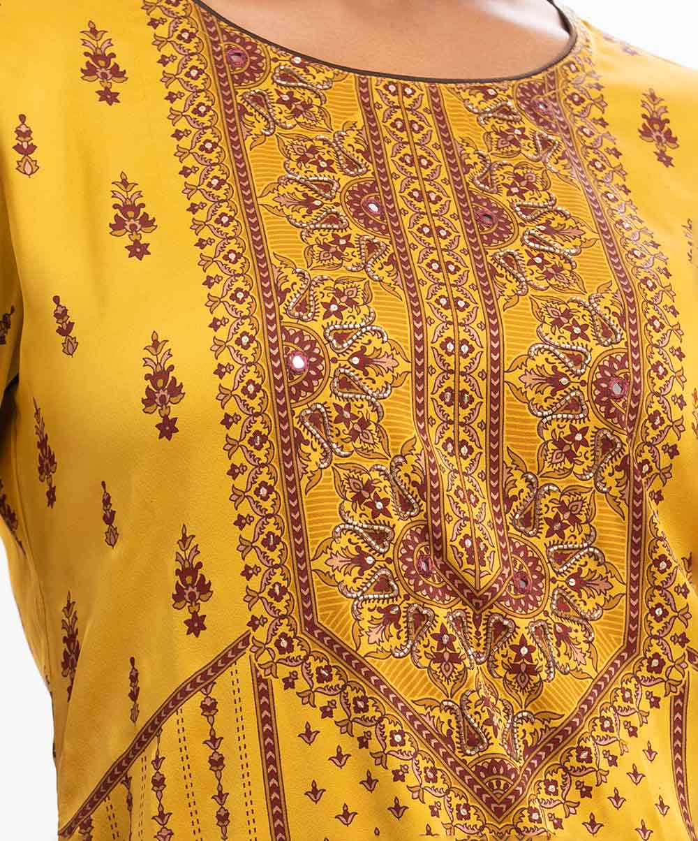 Round-neck kameez in amino satin fabric. Three-quarter sleeves, karchupi at the front and cuffs.