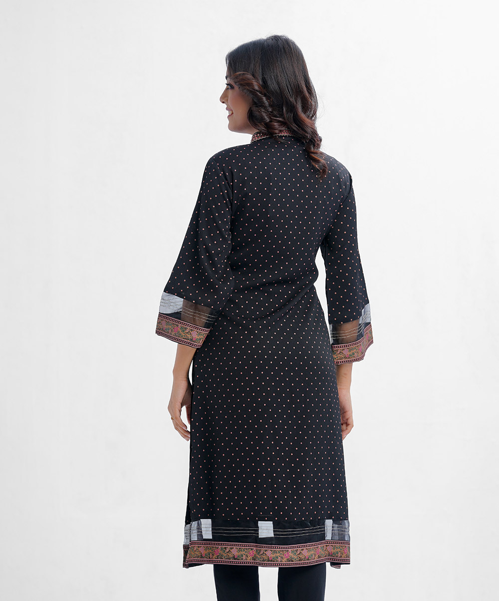 Women’s printed straight kameez in georgette fabric. three-quarter with bell sleeved and karchupi at the front.