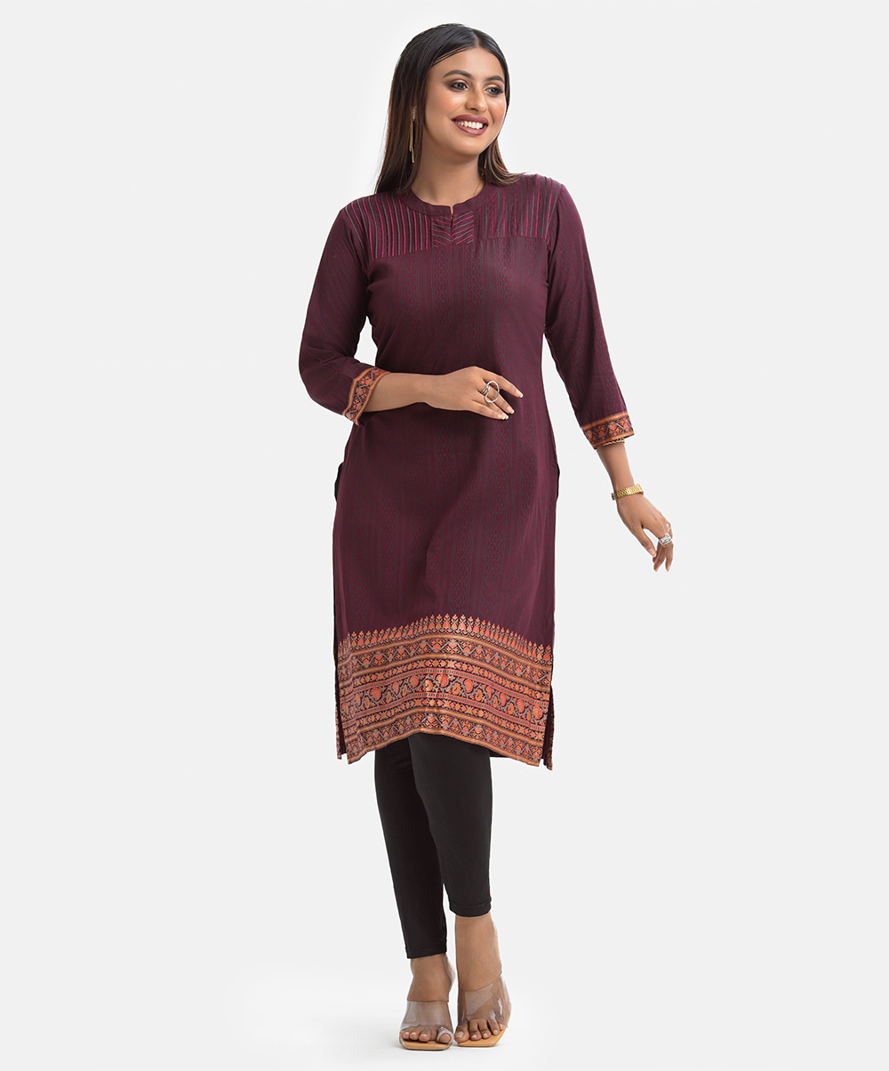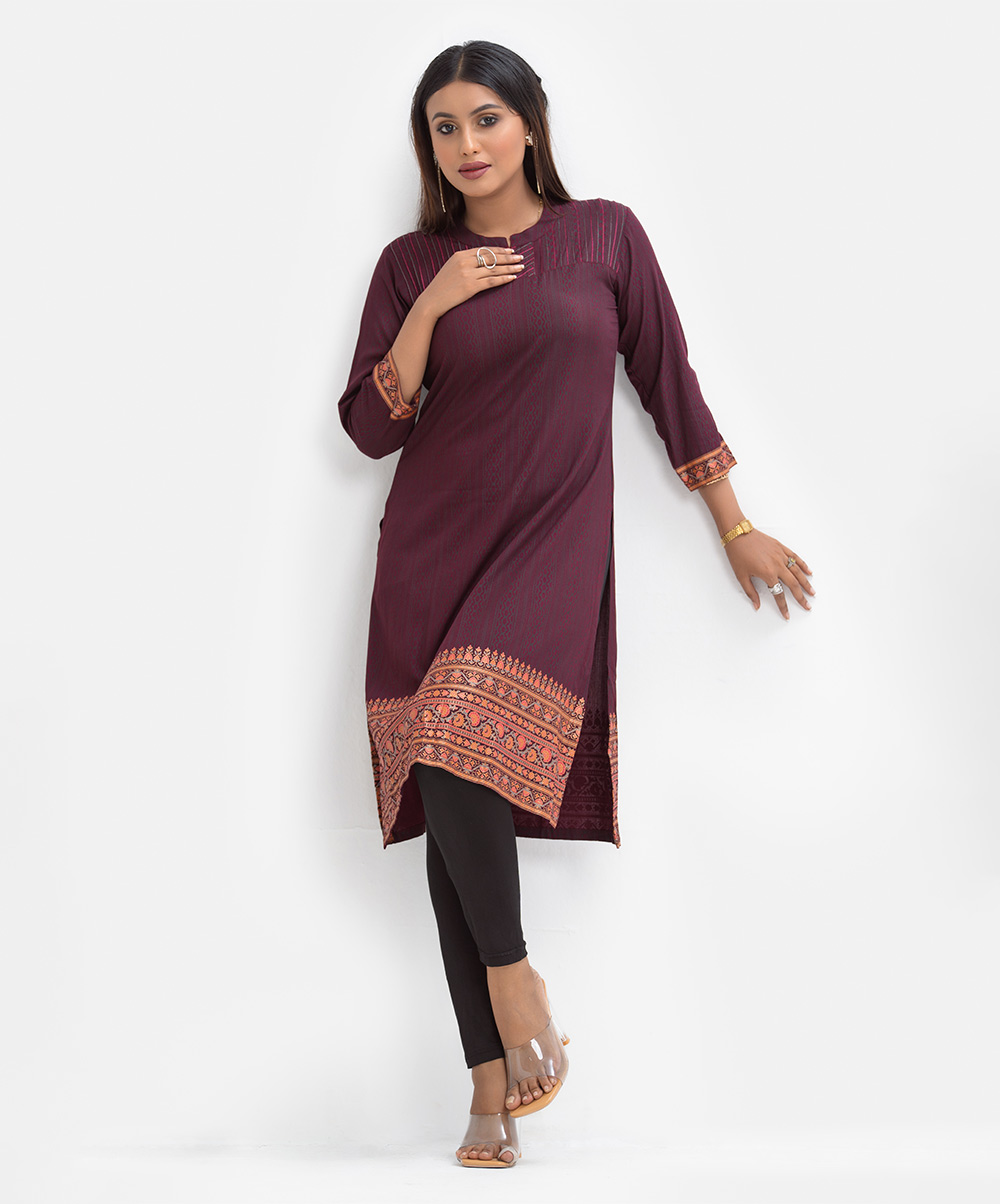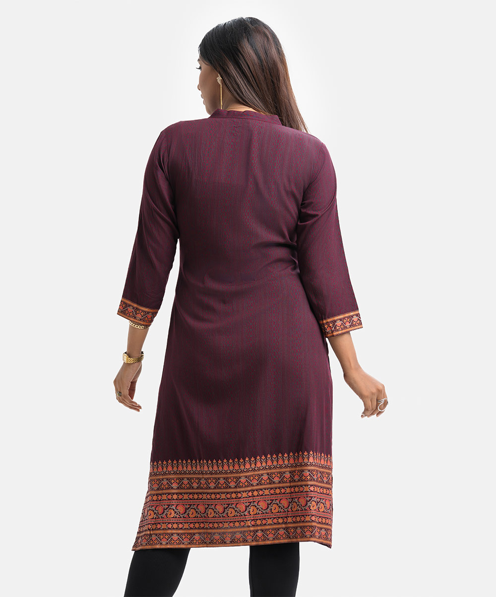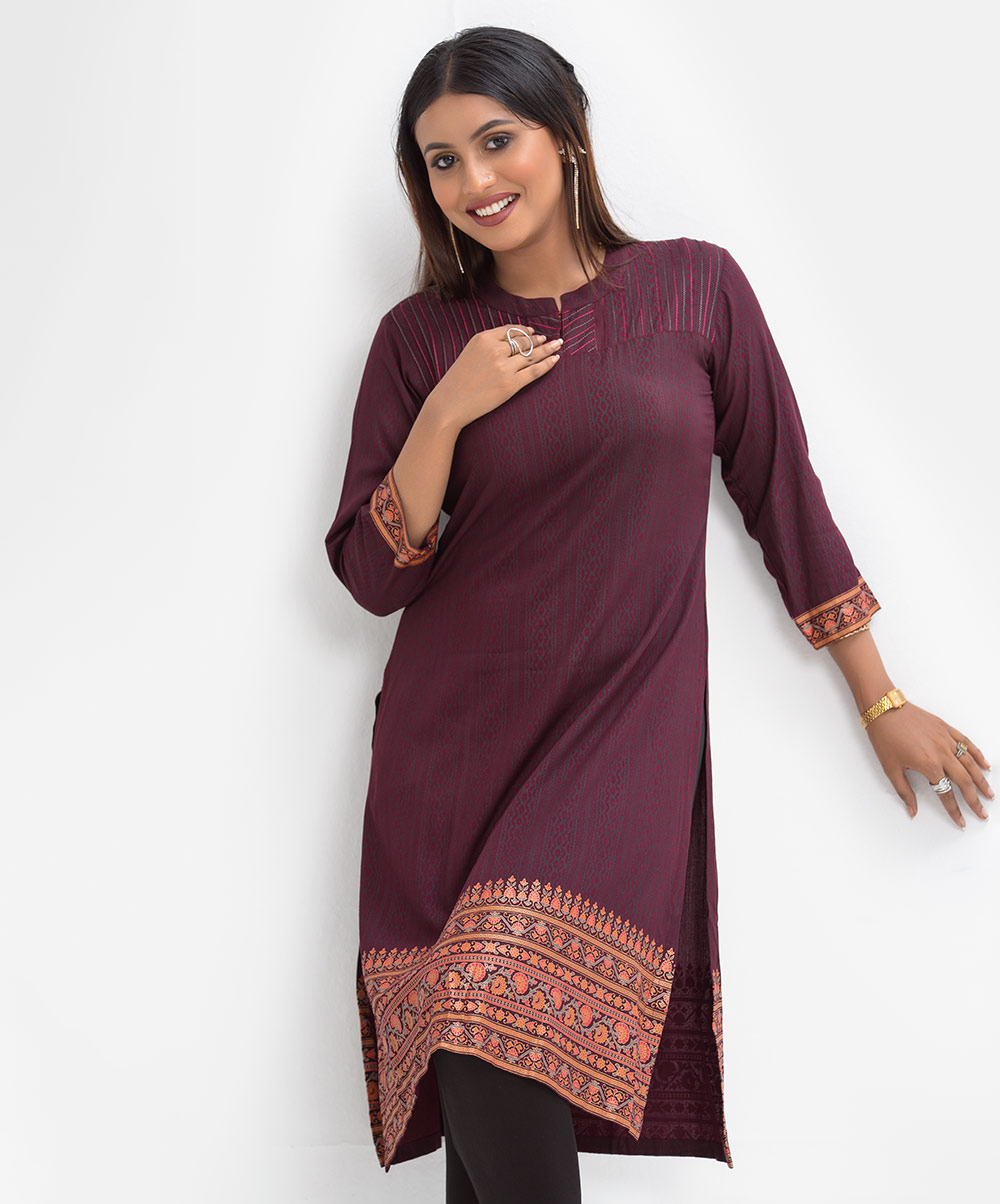 Women’s printed A-line kameez in viscose fabric. Stand collar, three-quarter sleeves. Pintuck with line stitching at front.