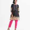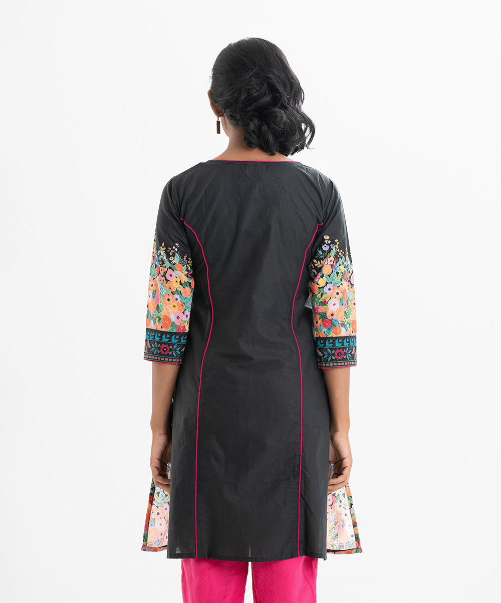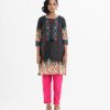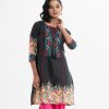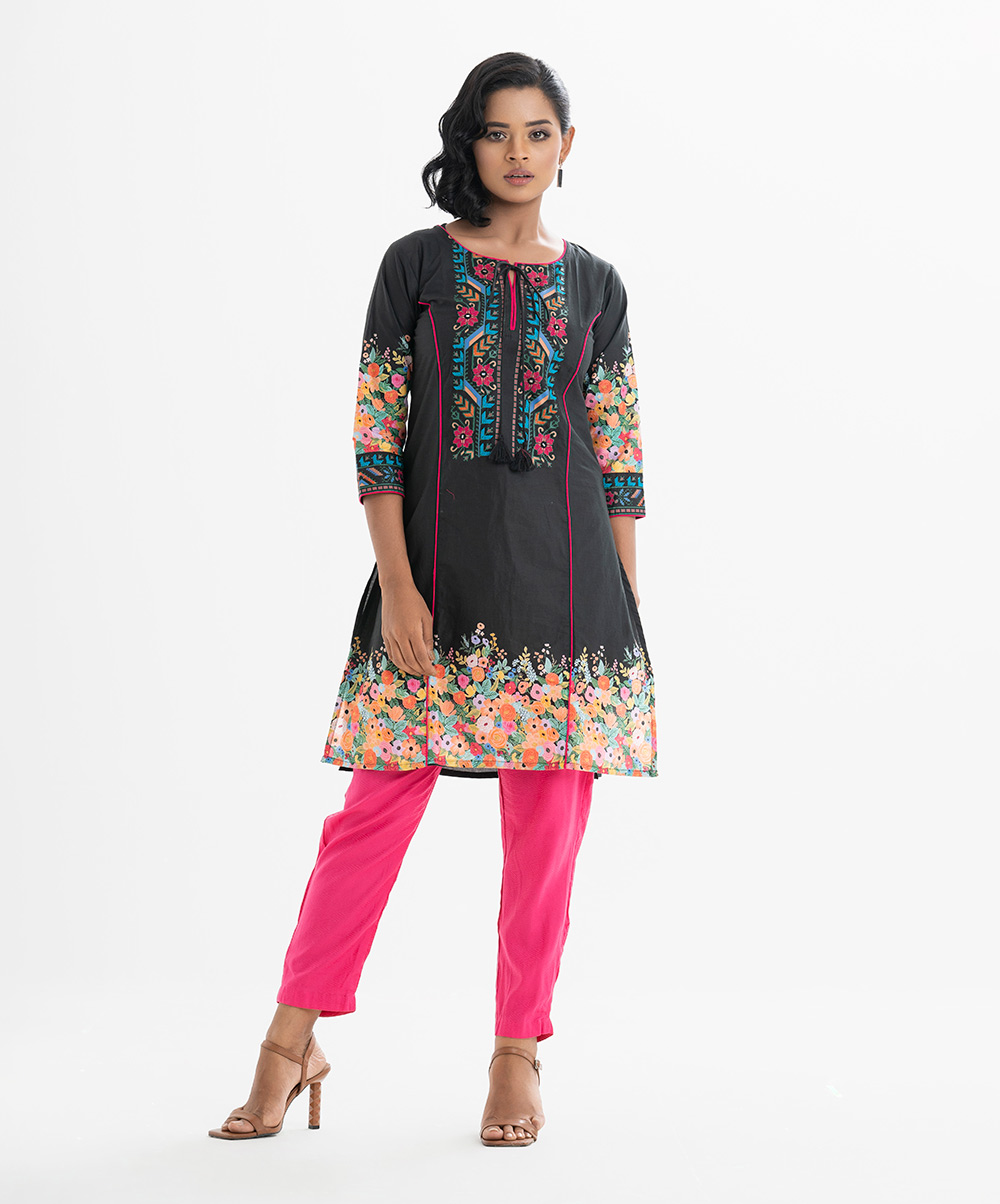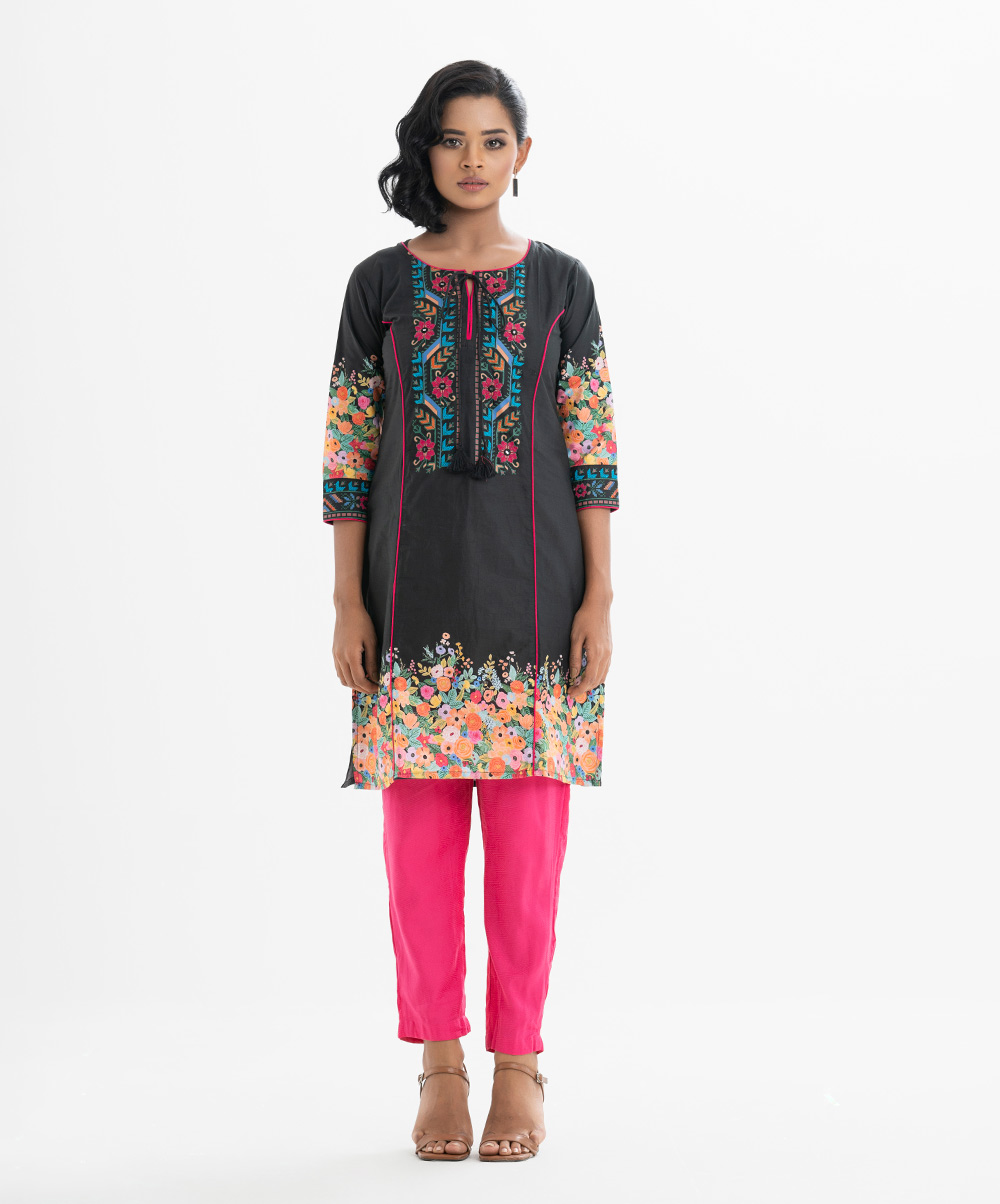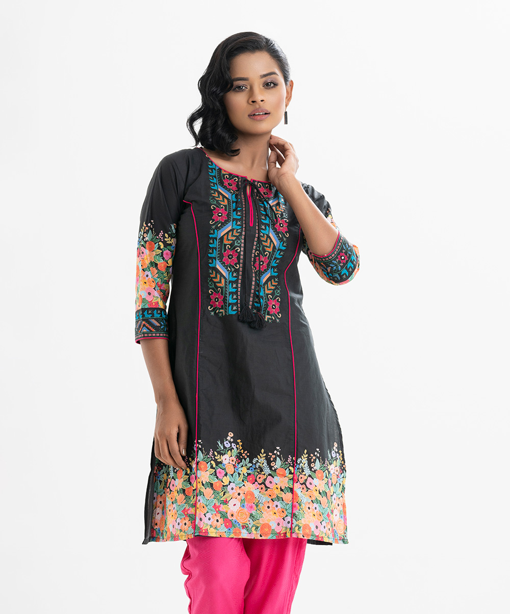 Women’s printed straight kameez in crepe fabric. Round neck, three-quarter sleeves and embroidery at the front.