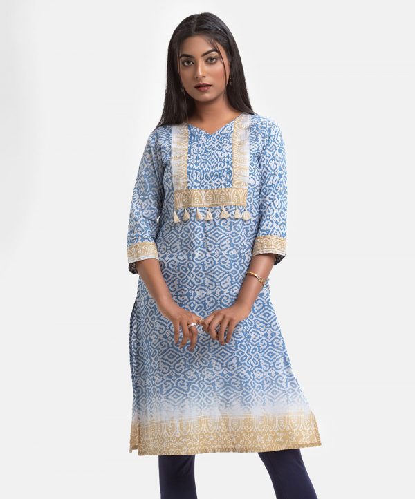 Women’s printed kameez in cotton fabric. V-neck and three-quarter sleeves. Patch, pintuck and tassels at the front.
