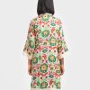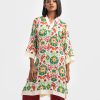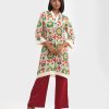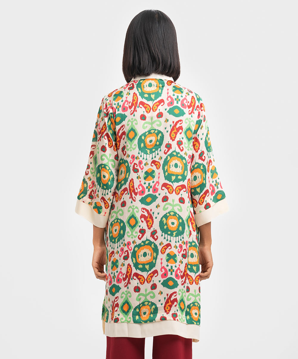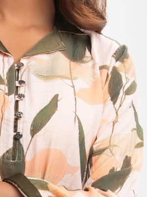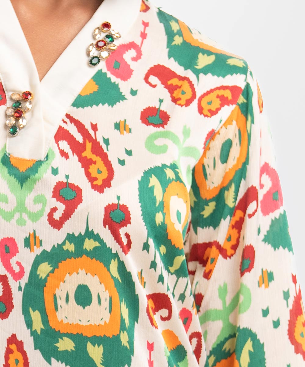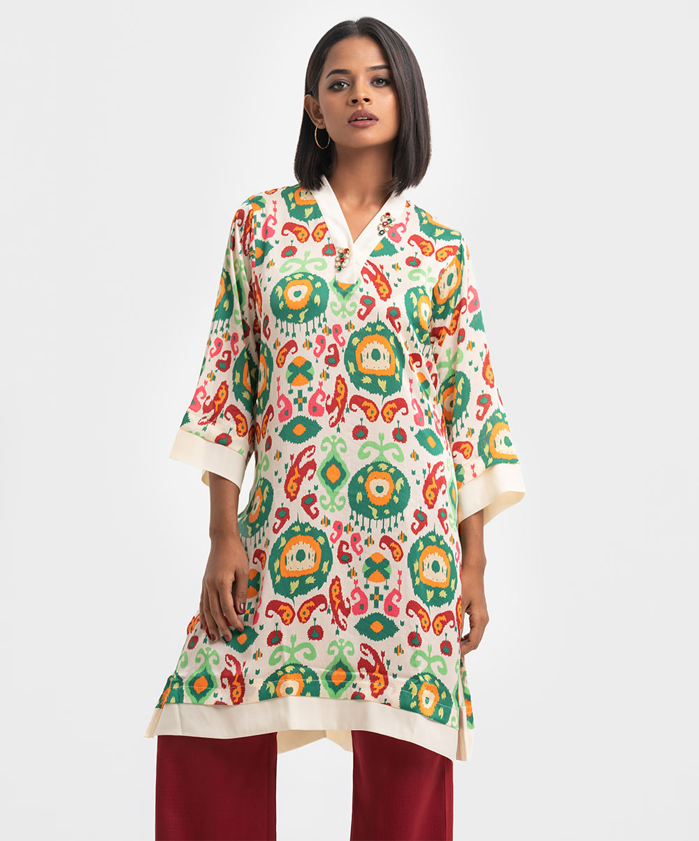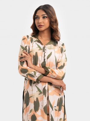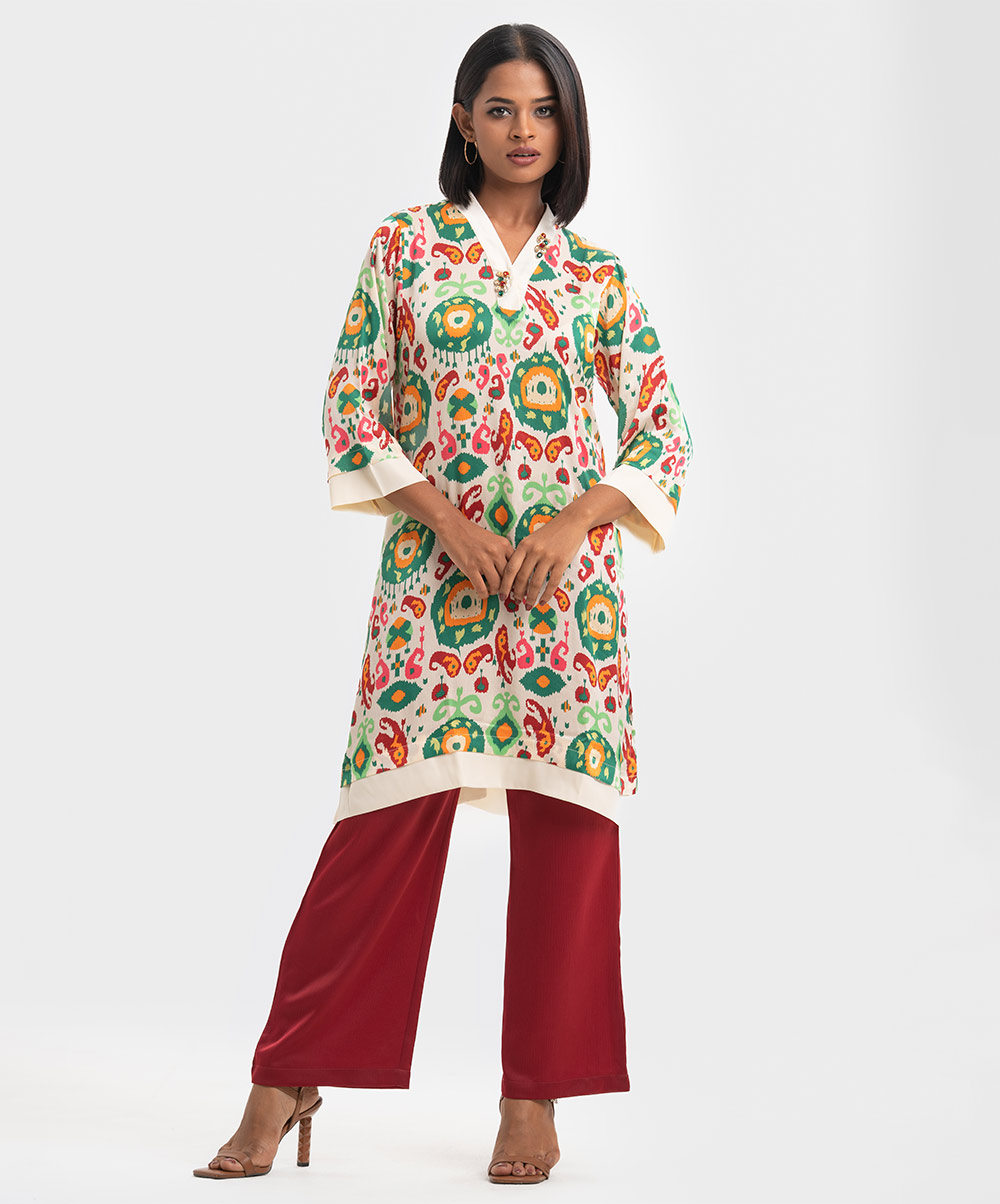 Women’s printed straight kameez in stretched satin fabric. V-neck, long sleeves and karchupi at the neckline.