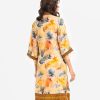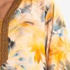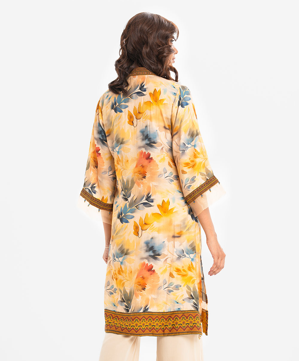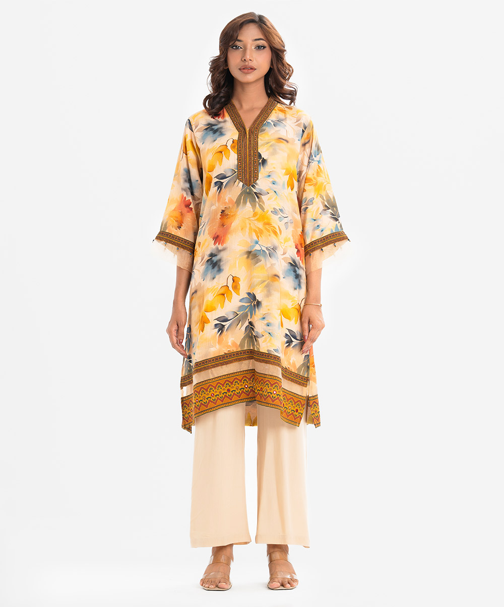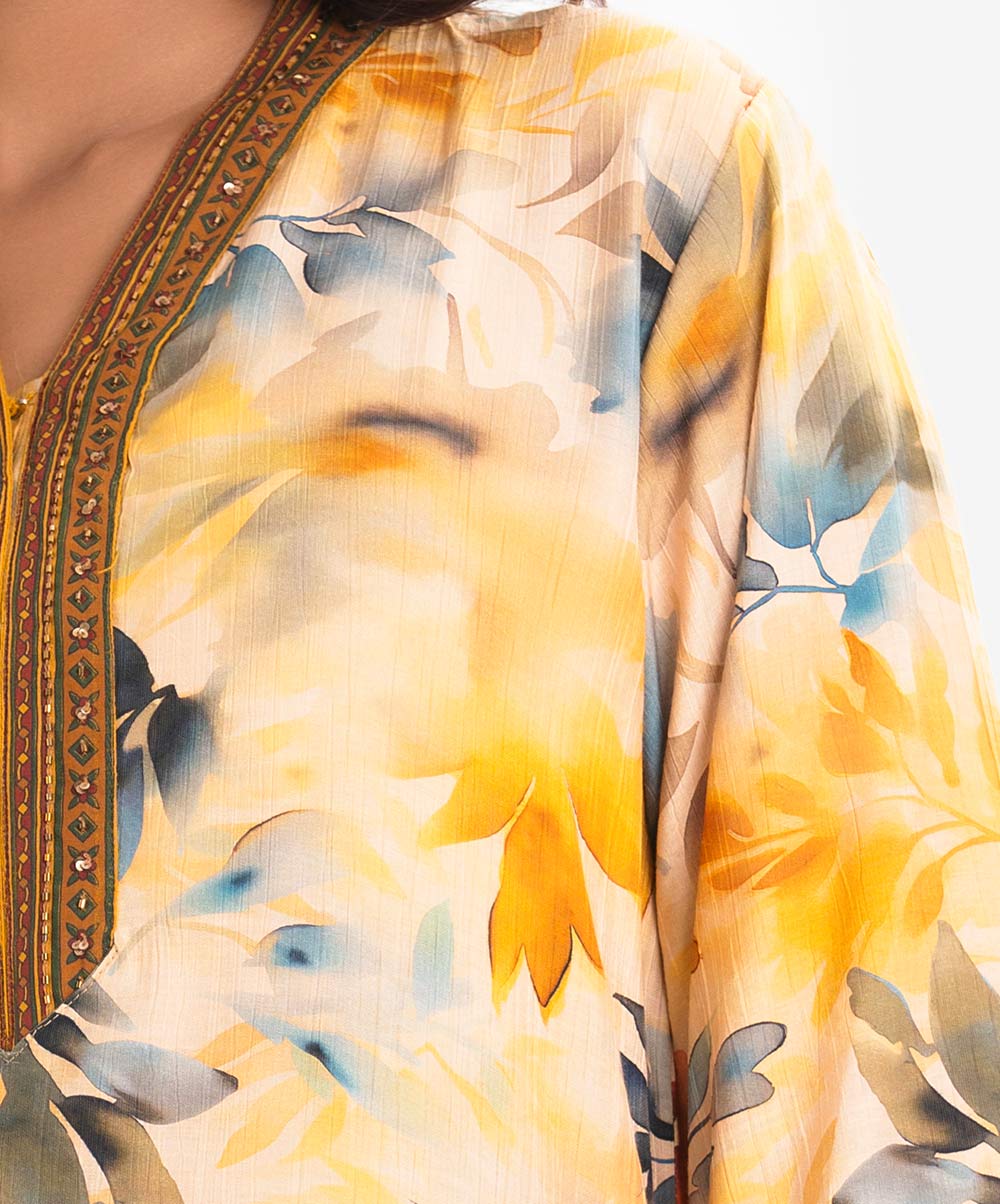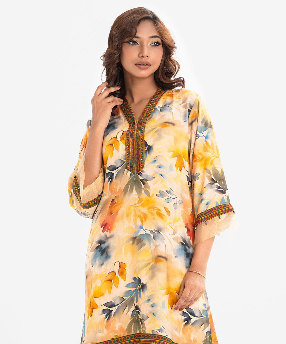 Women’s floral printed A-line kameez in blended cotton fabric. V-neck, three-quarter sleeves. Patch & karchupi work at coller, sleeves and hem.