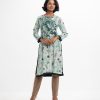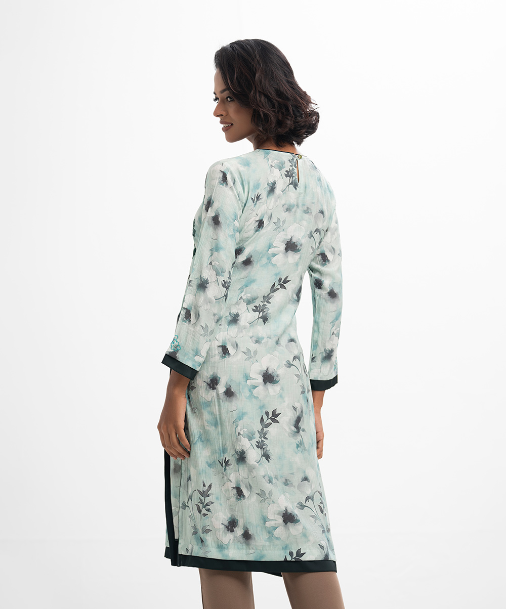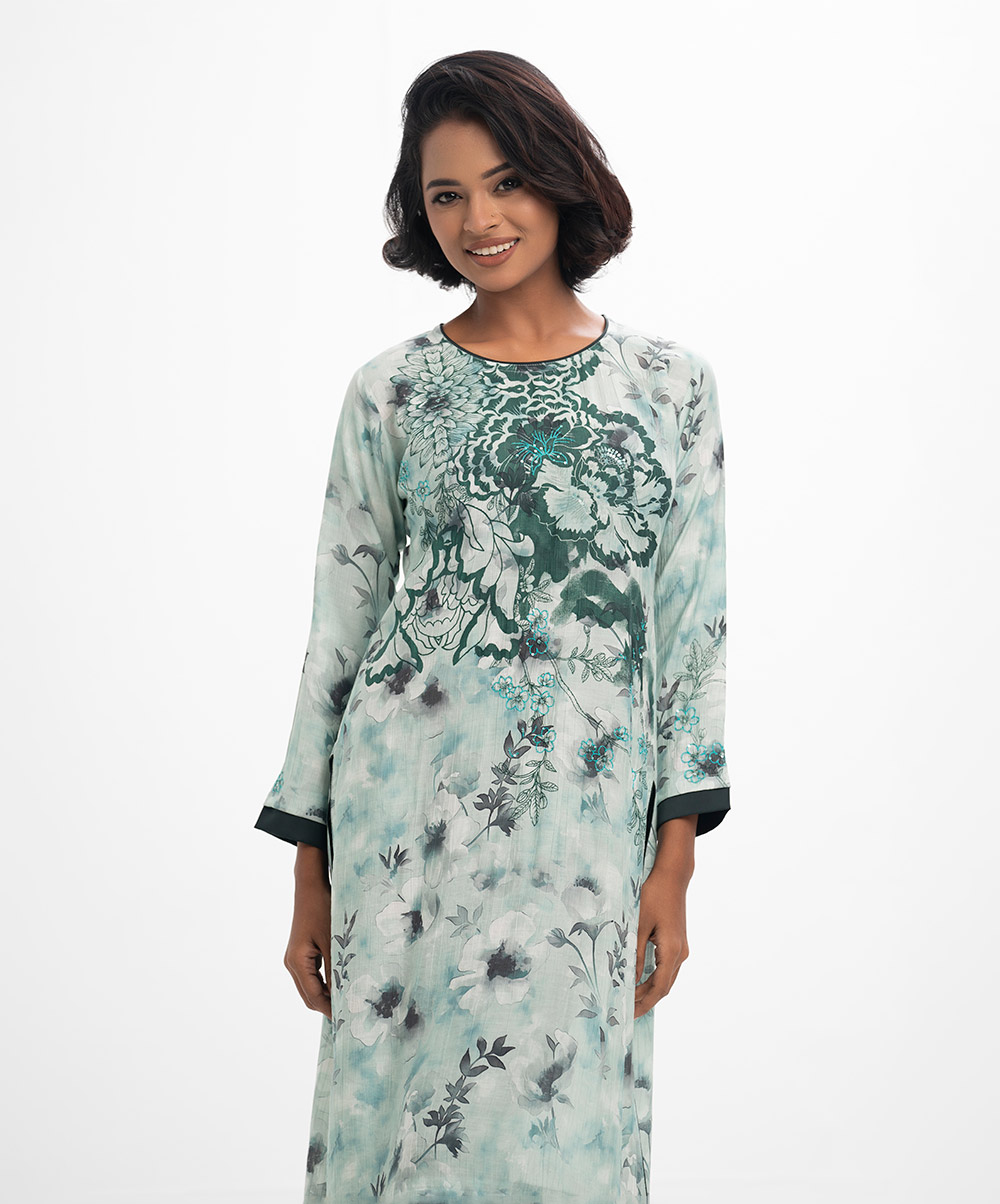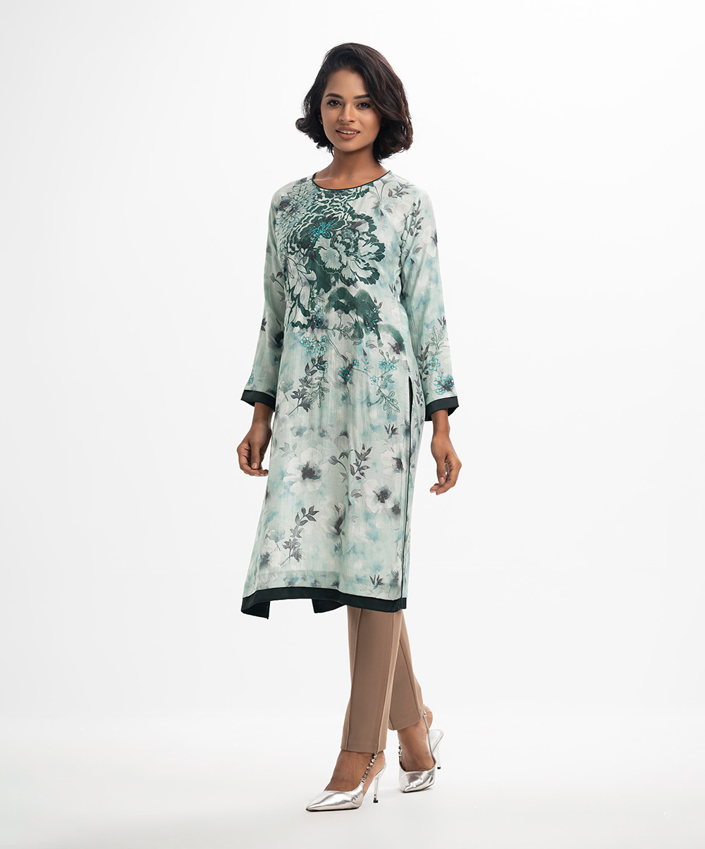 Round neck Kameez in cotton-blended fabric. Full sleeves, sequin details at the front.