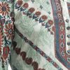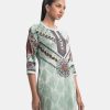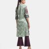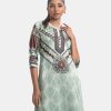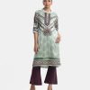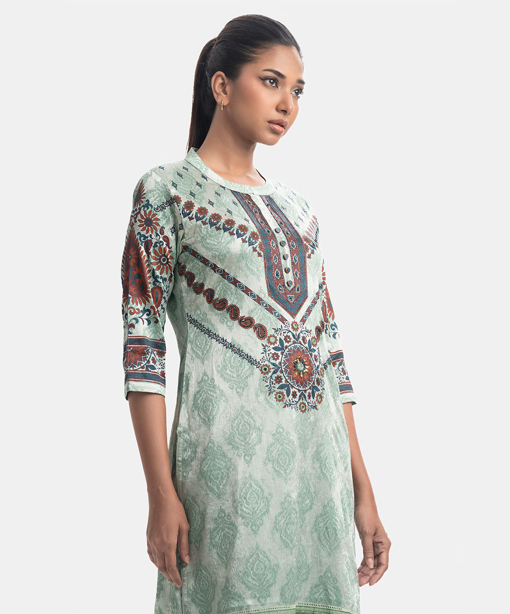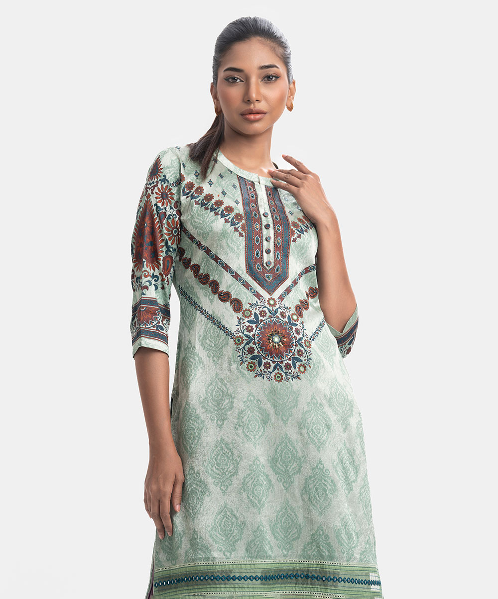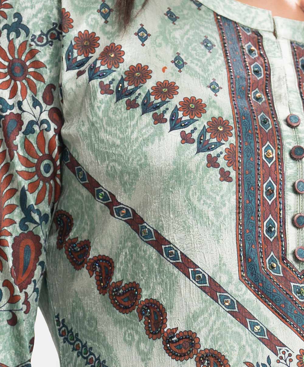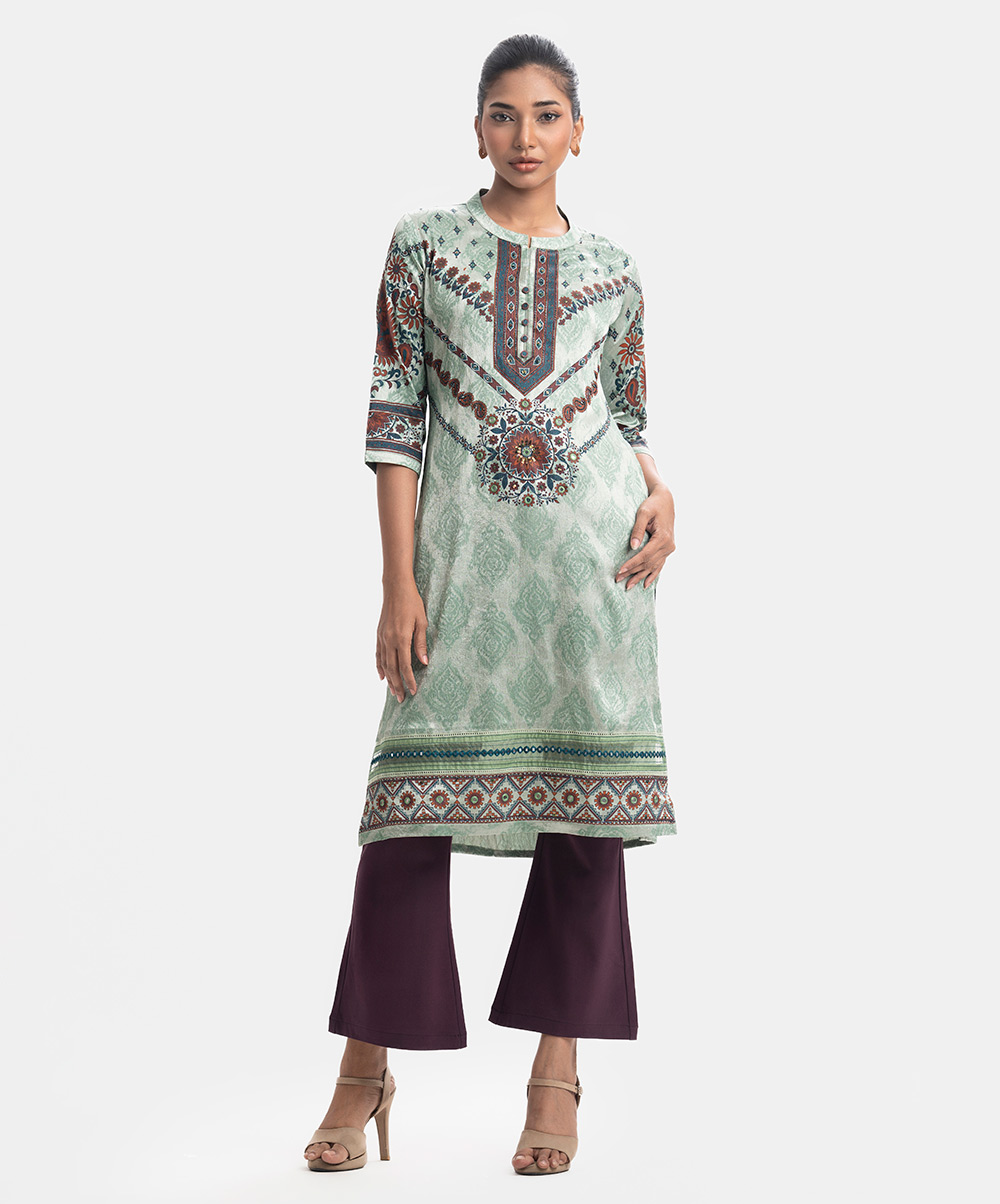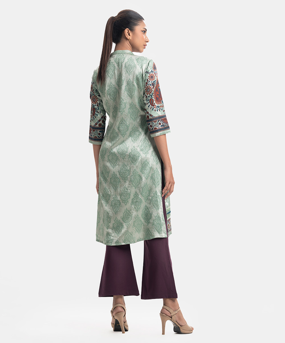 Band collar kameez in satin-georgette fabric. Three-quarter sleeves, karchupi at the front.