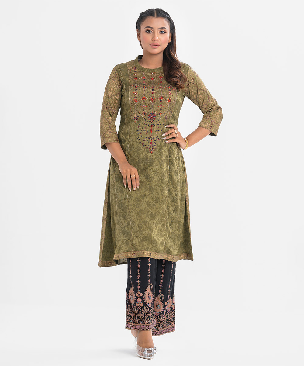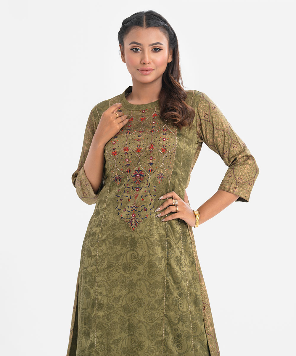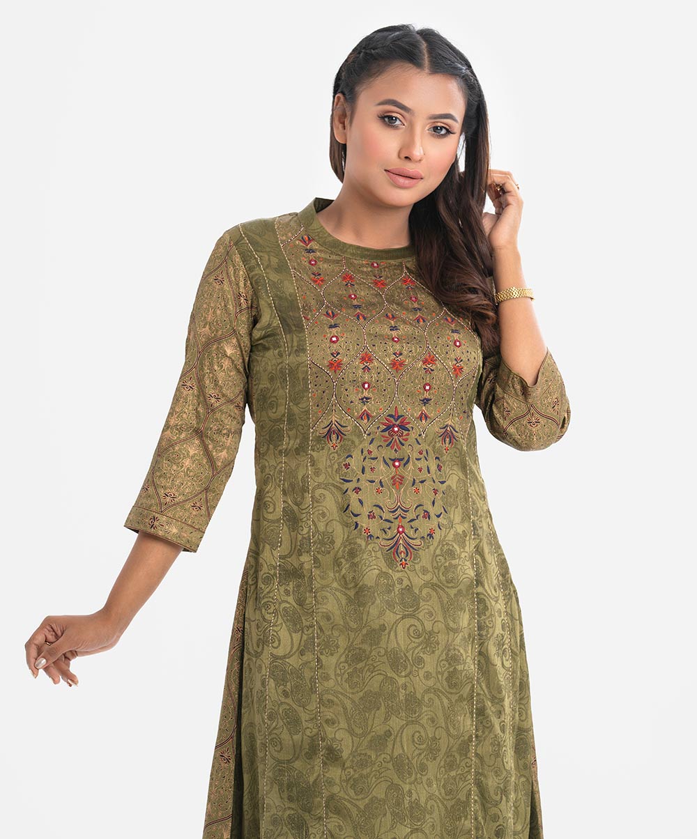 Women’s printed A-line kameez in textured georgette fabric. Three-quarter sleeves, mock neck. Embroidery at the front.