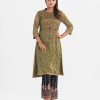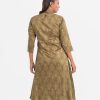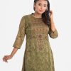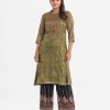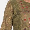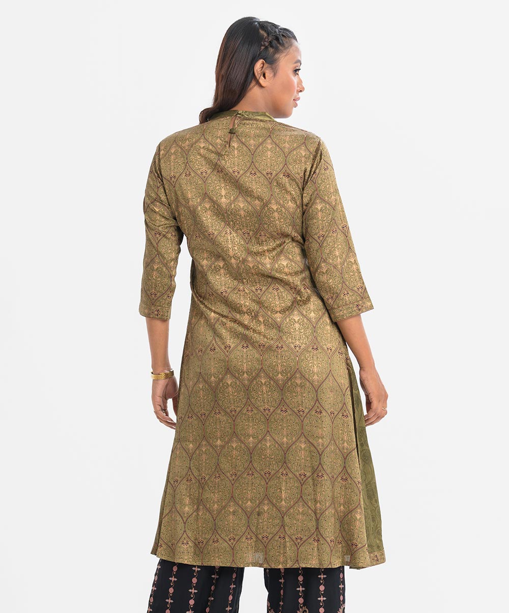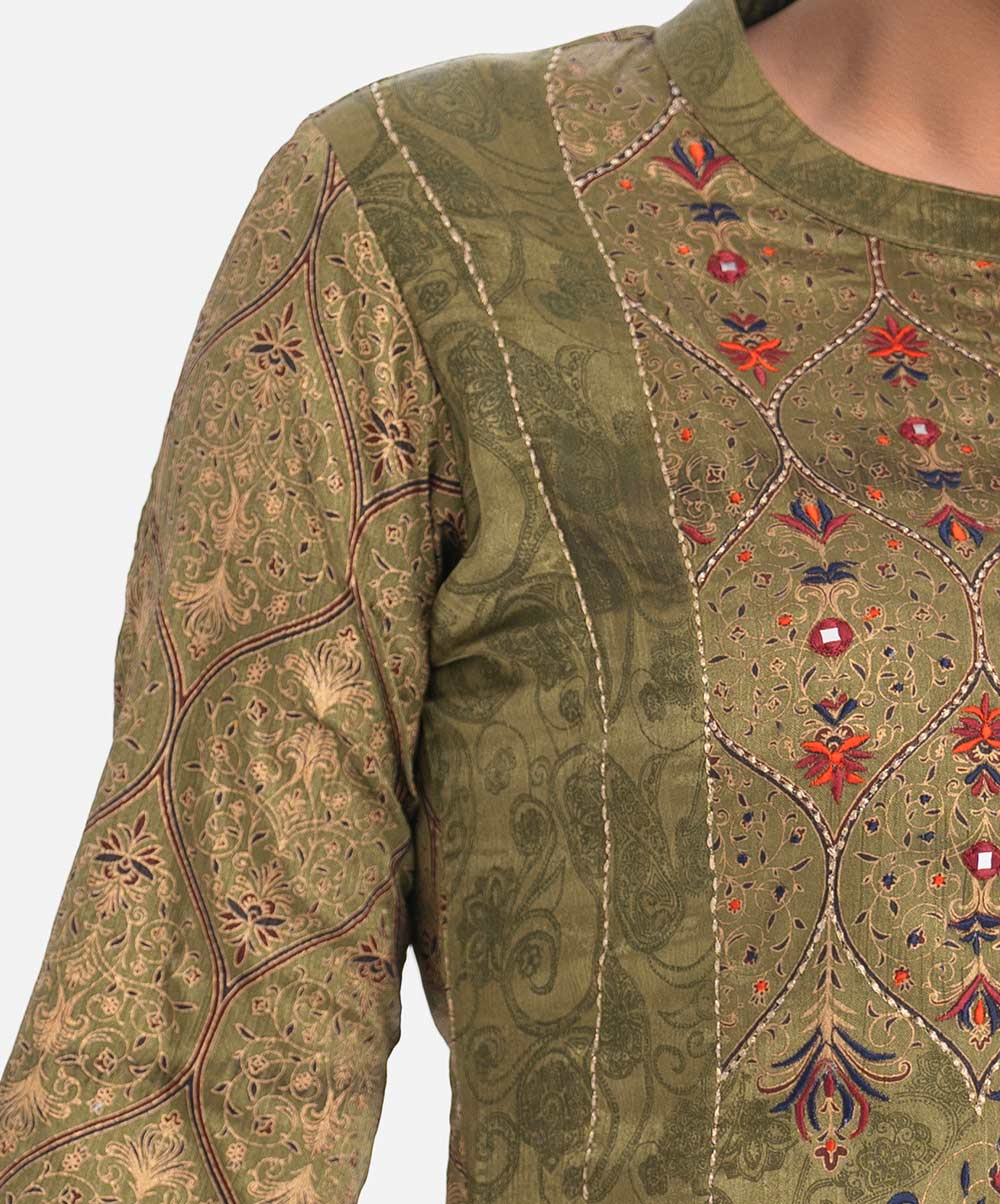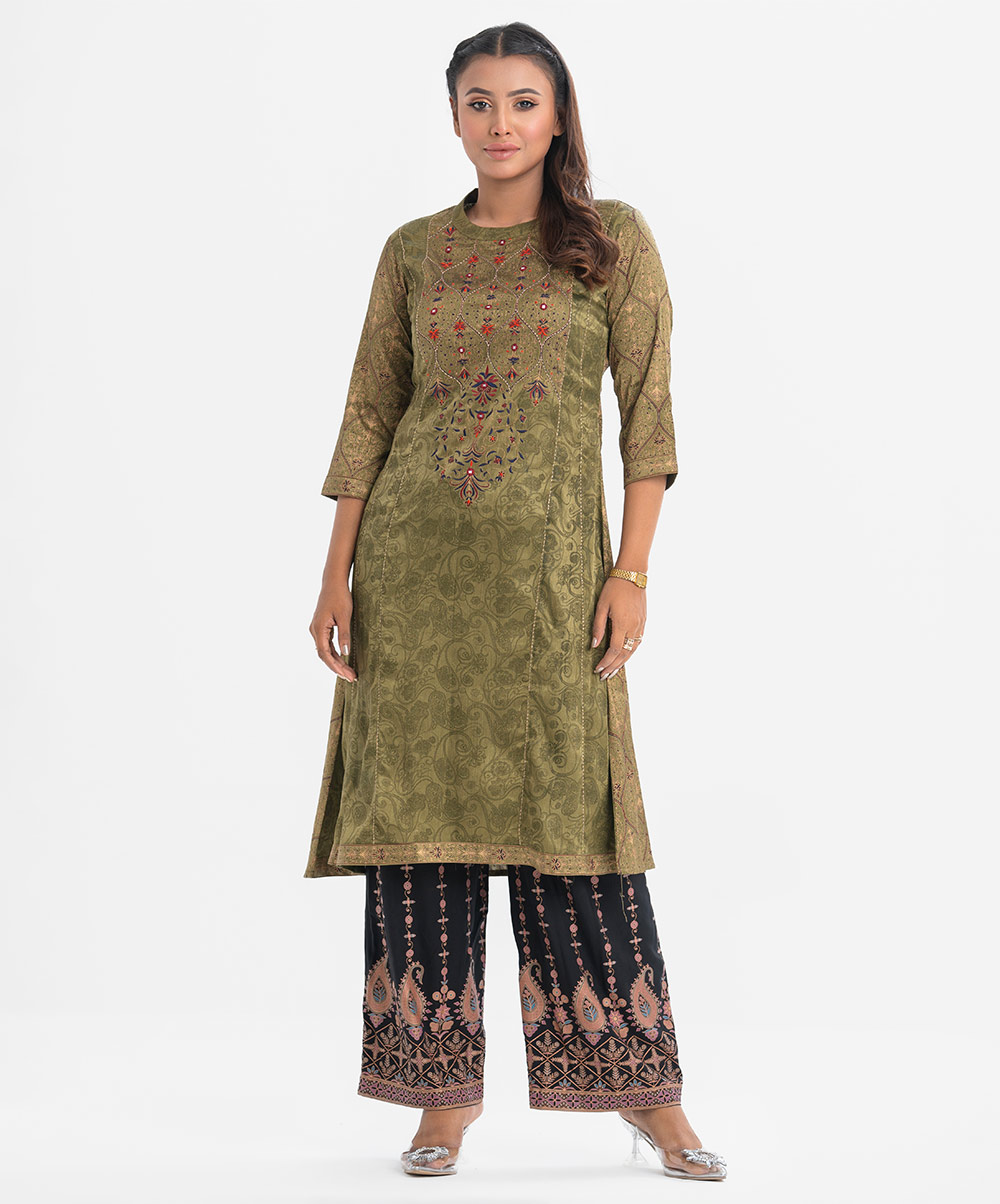 Women’s printed A-line kameez in textured georgette fabric. Three-quarter sleeves, mock neck. Embroidery at the front.