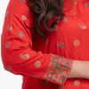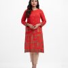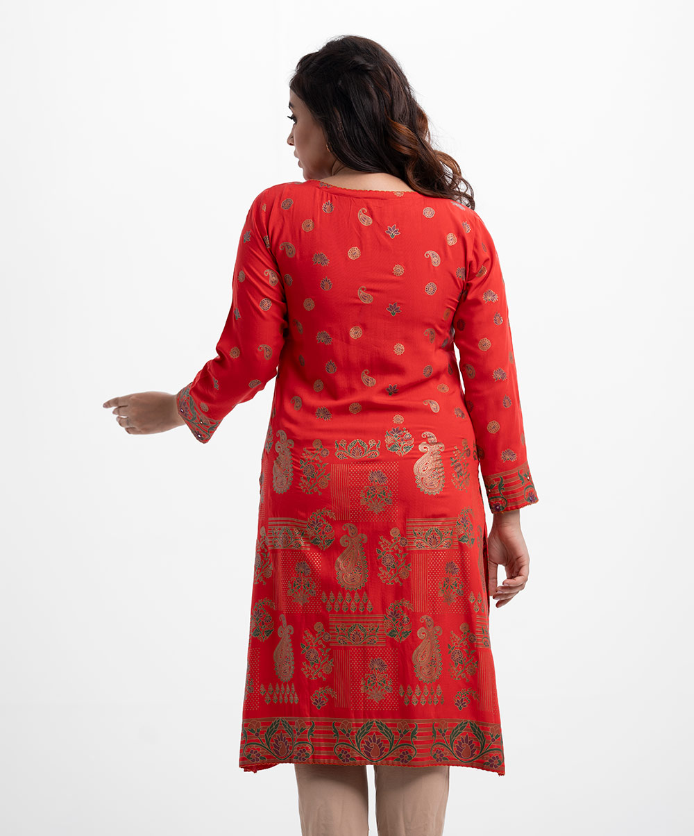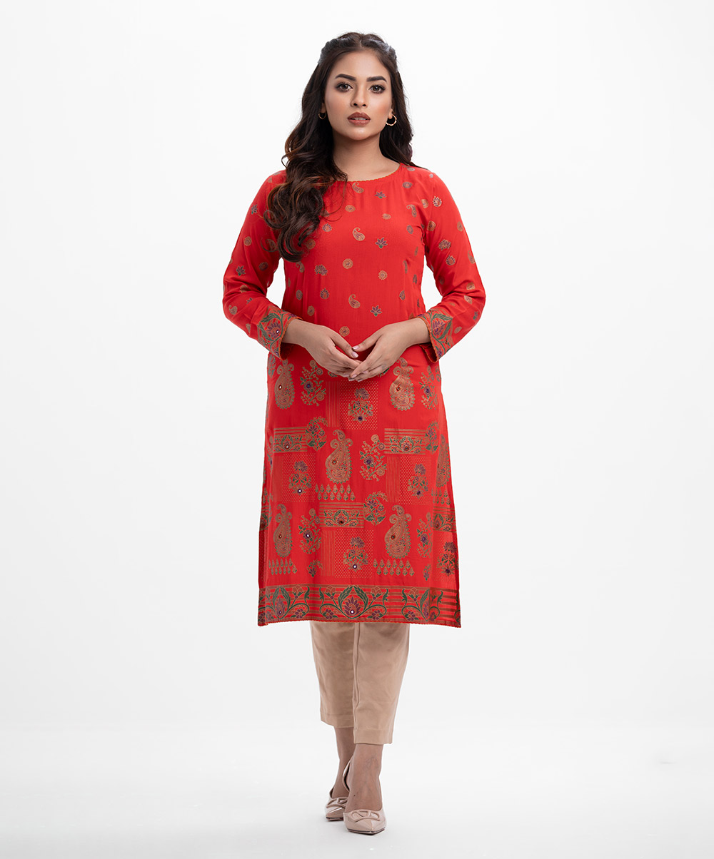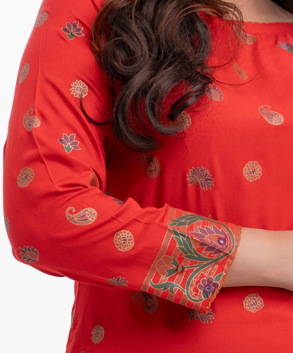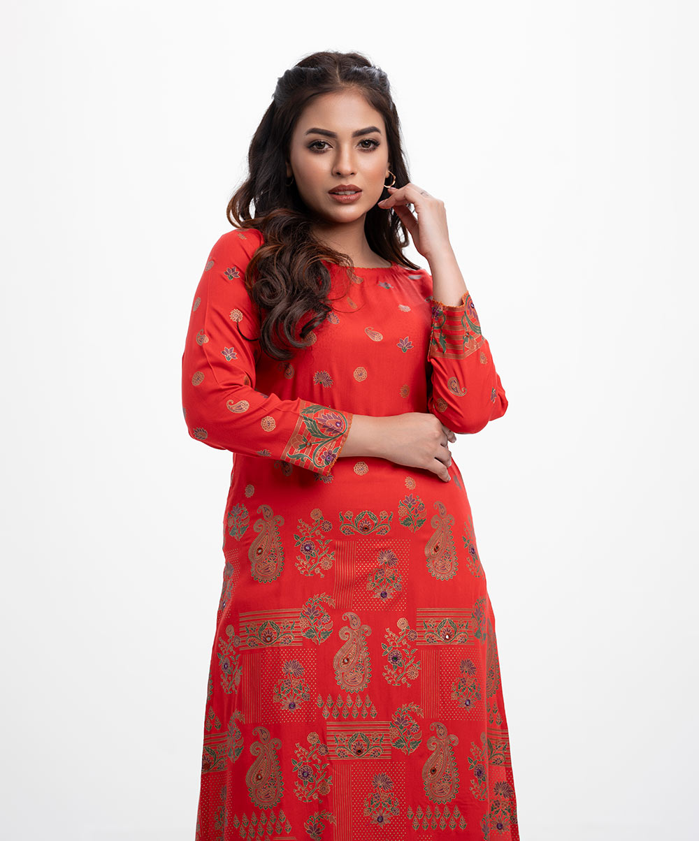 Straight kameez in viscose fabric.Boat neck, full sleeves with karchupi at the front and cuffs.