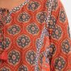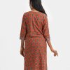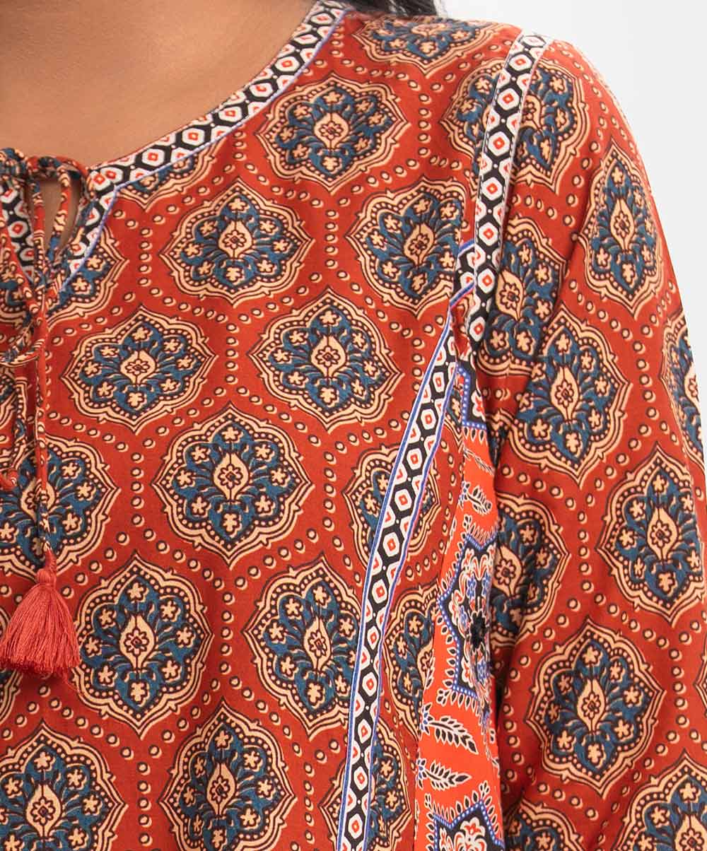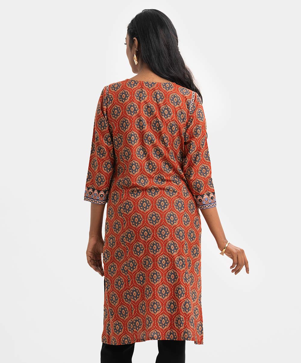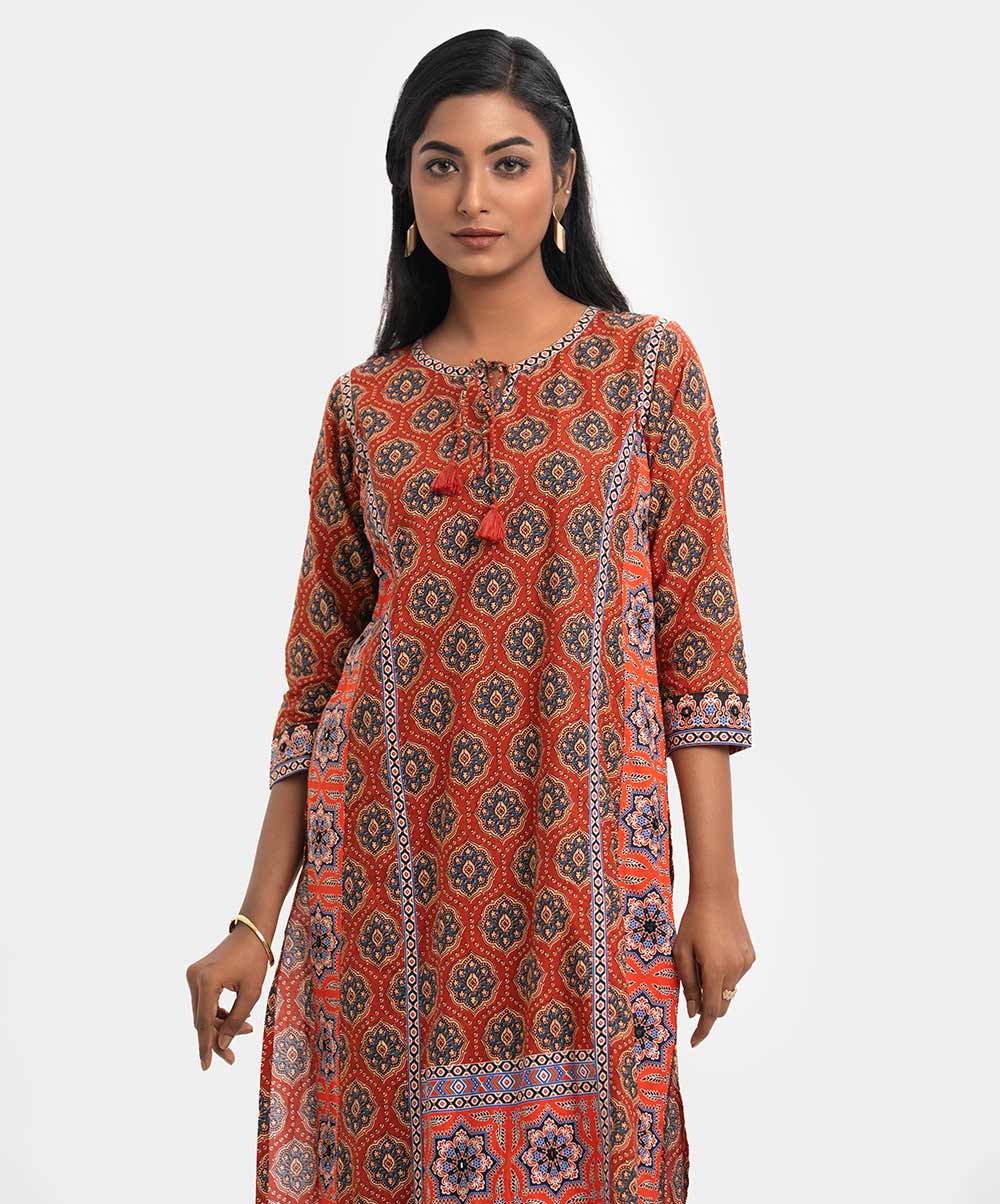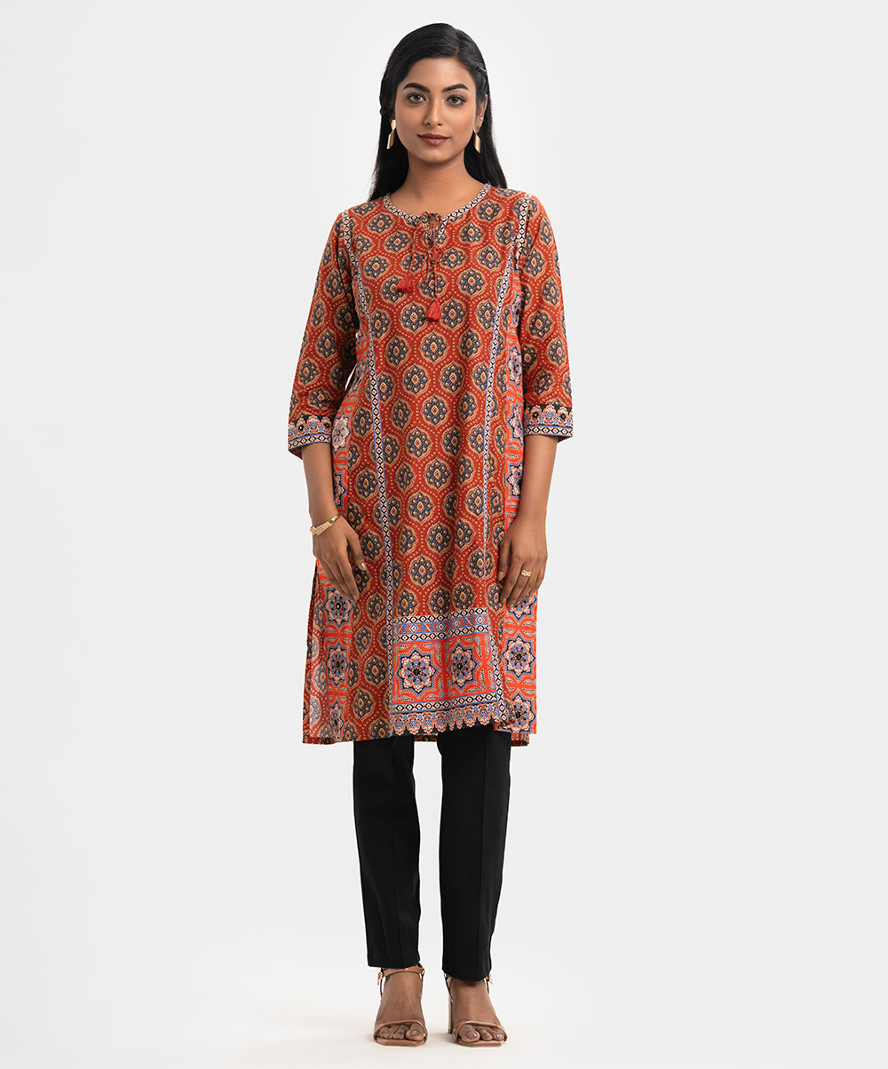 Women’s printed A-line kameez in cotton fabric. Round neck V-cut with tie-cord, three-quarter sleeves. Patch and karchupi at front & sleeves.