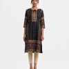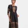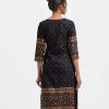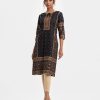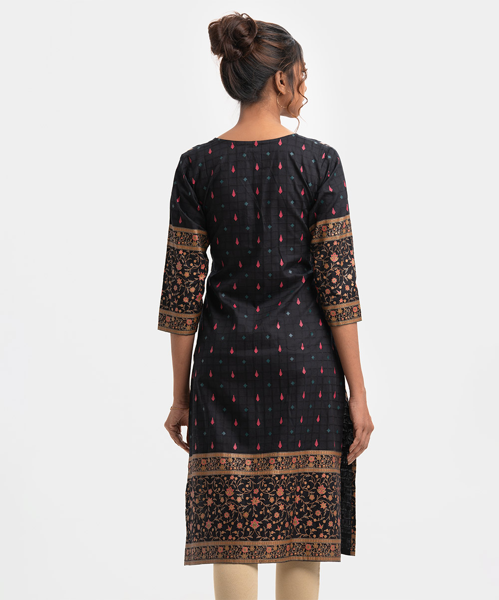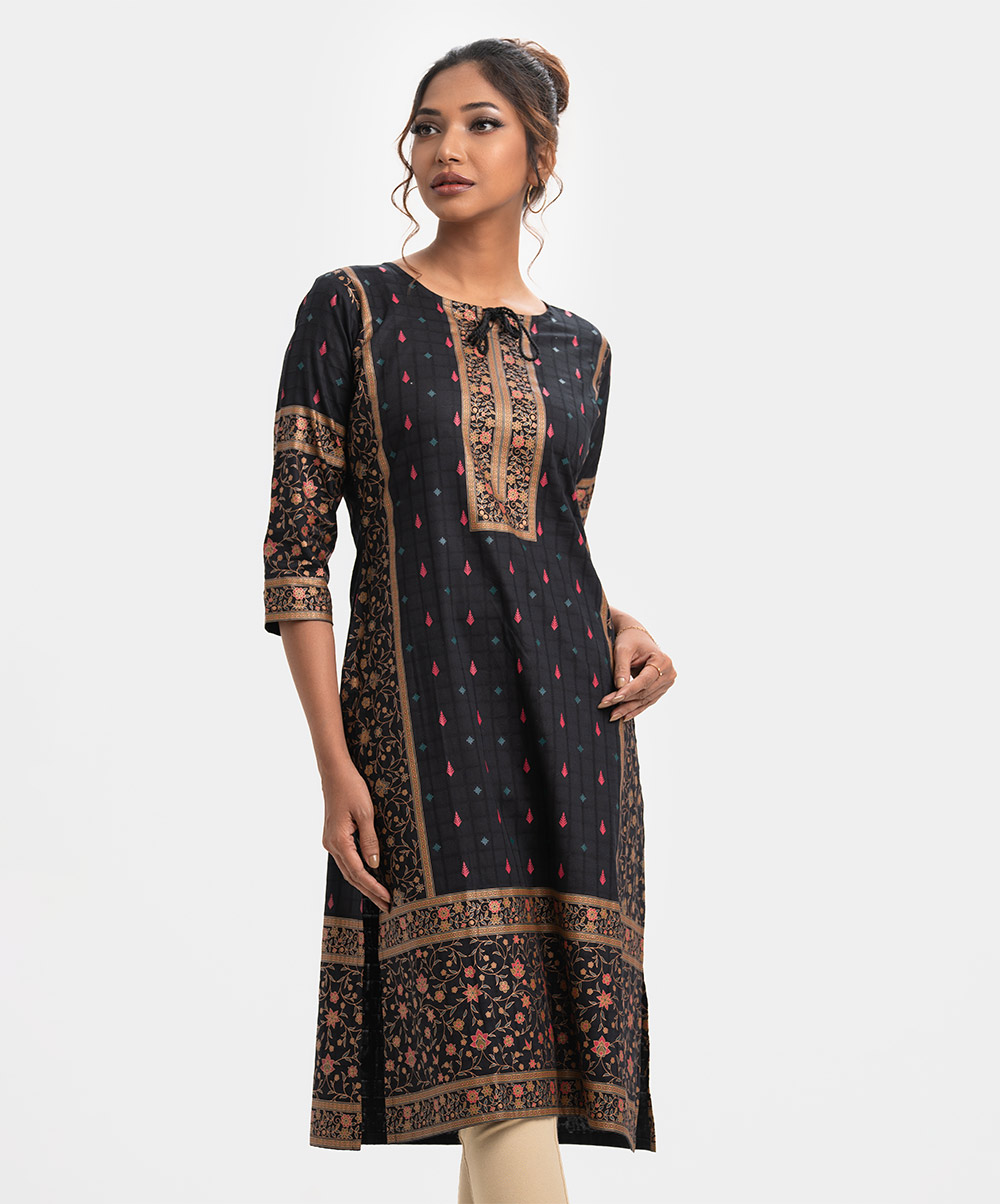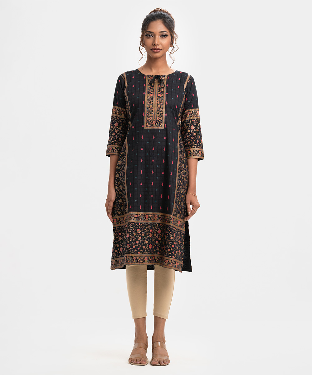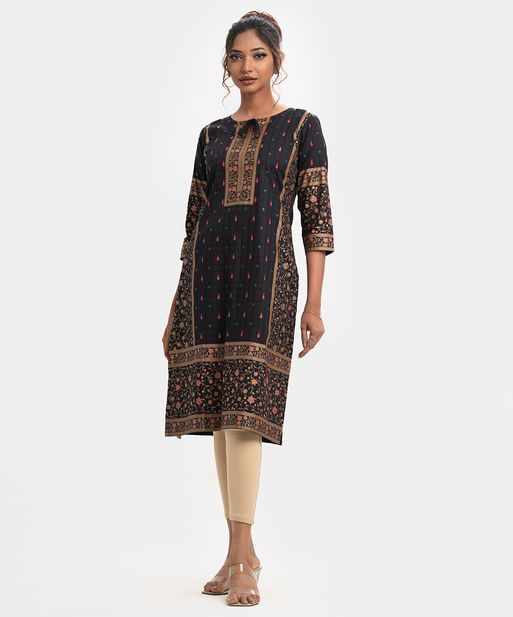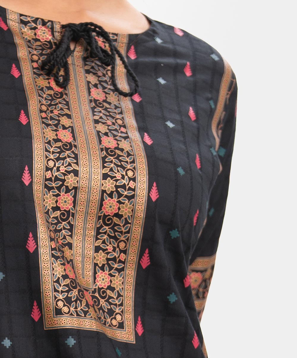 Women’s printed straight kameez in jacquard cotton fabric. Three-quarter sleeves, round neck with slit attached tassel tie.