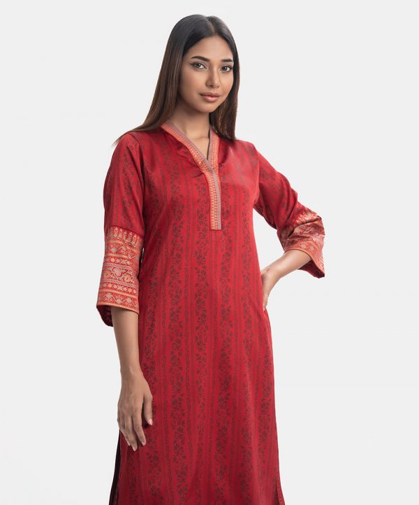 Women’s printed A-line kameez in georgette fabric. V-neck with placket, three-quarter sleeves. Line stitching at hemline.