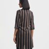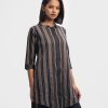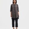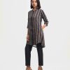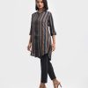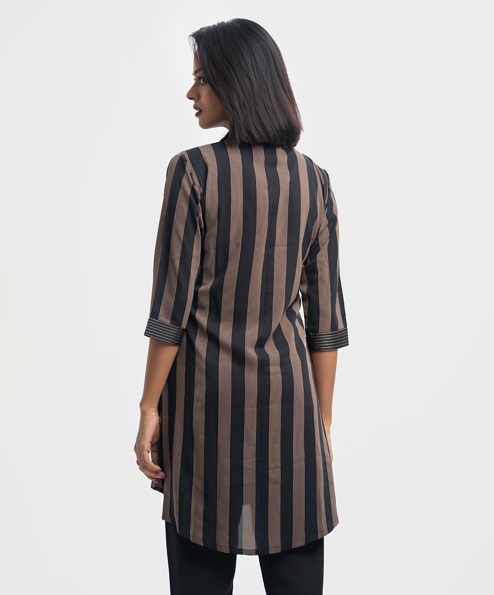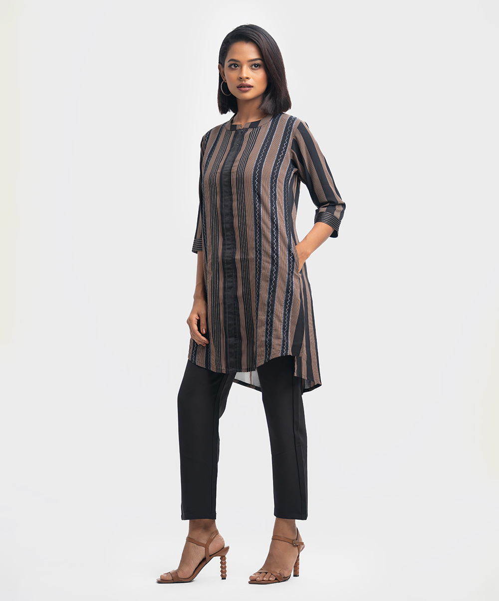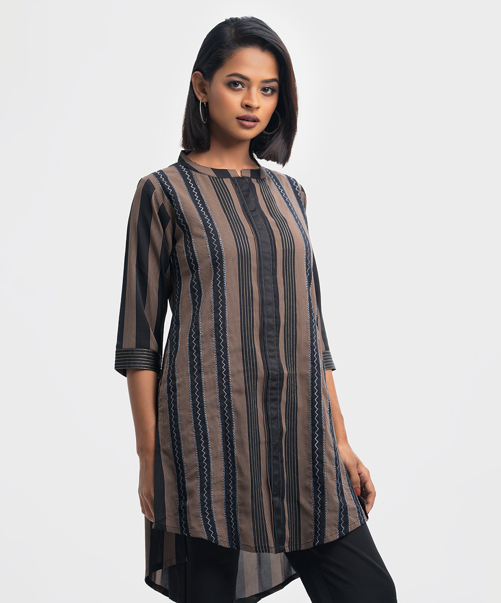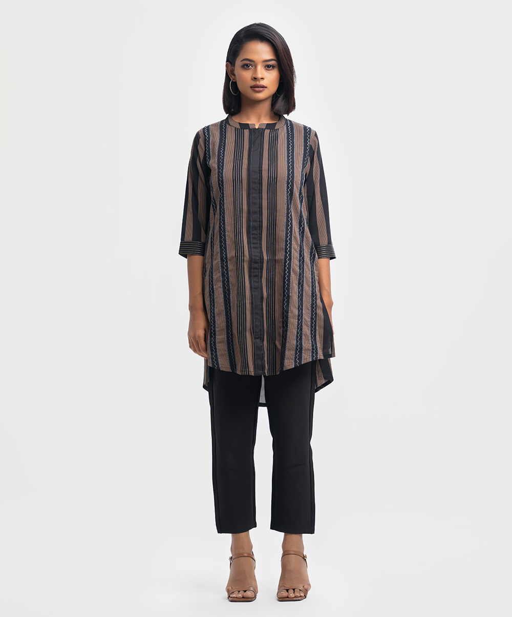 Band collar kameez in georgette fabric. Three-quarter sleeves with inseam side pockets. Embroidery at the front.