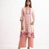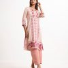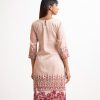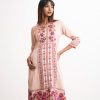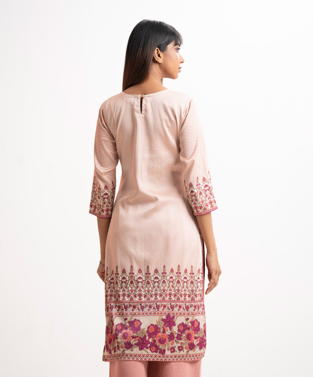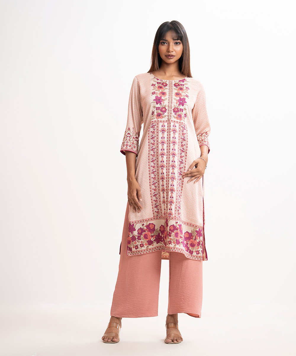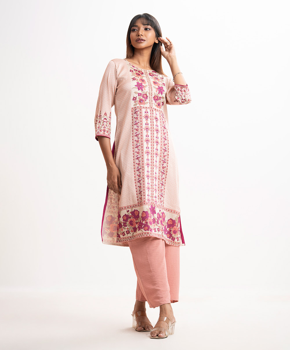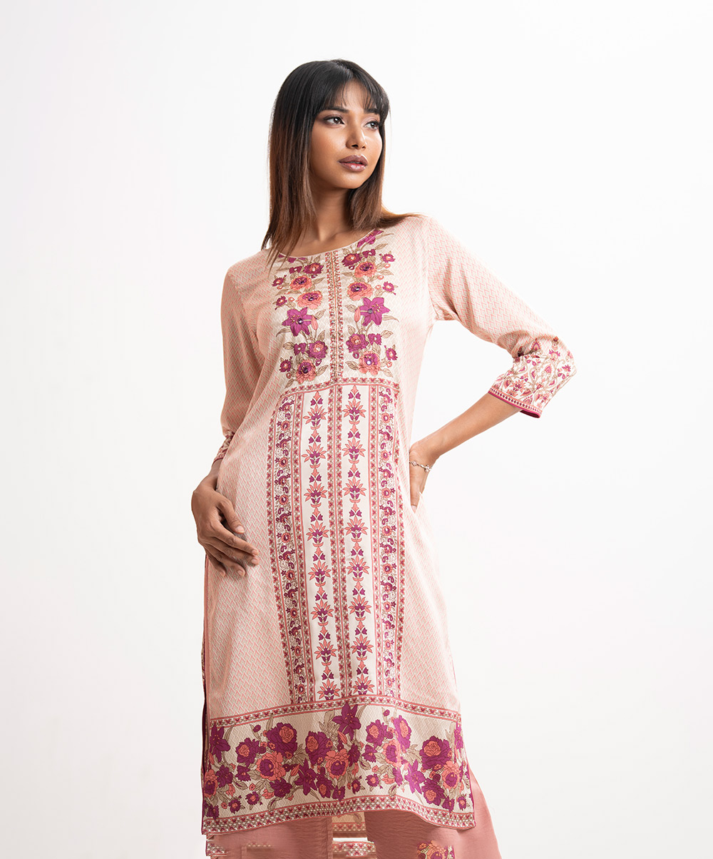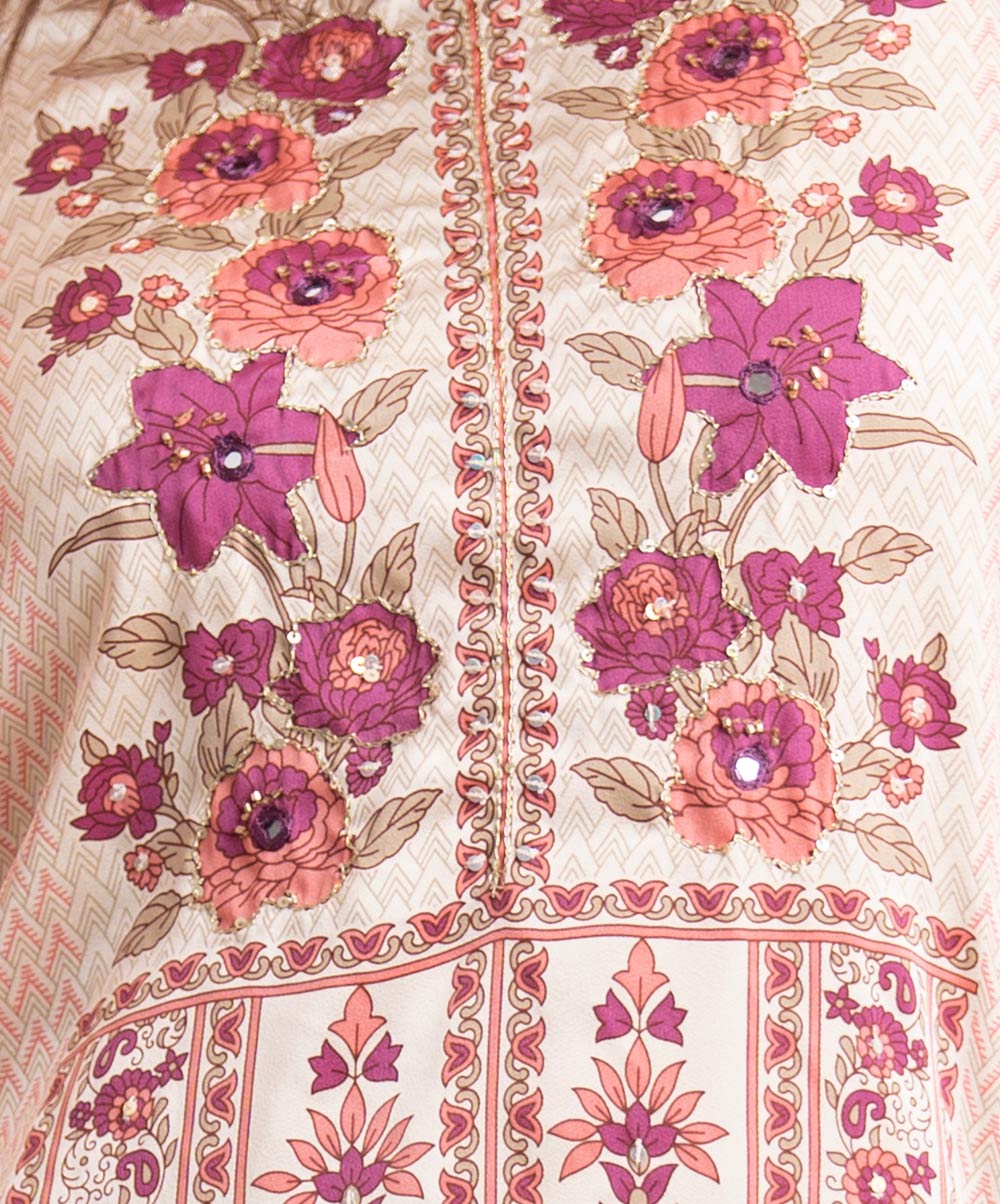 Women’s printed kameez in georgette fabric. Round neck, three-quarter sleeves. Karchupi at front.
