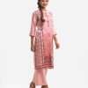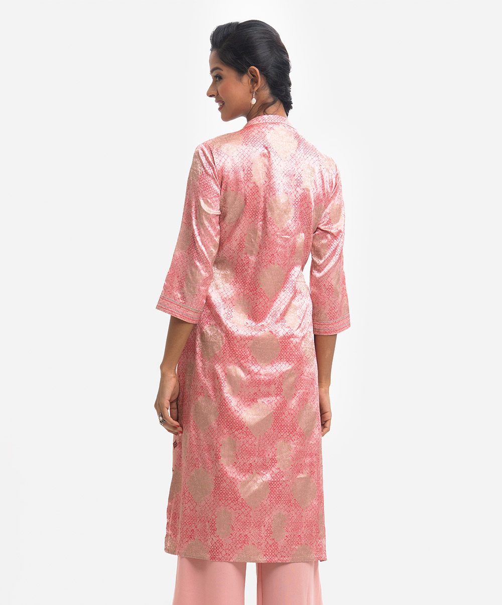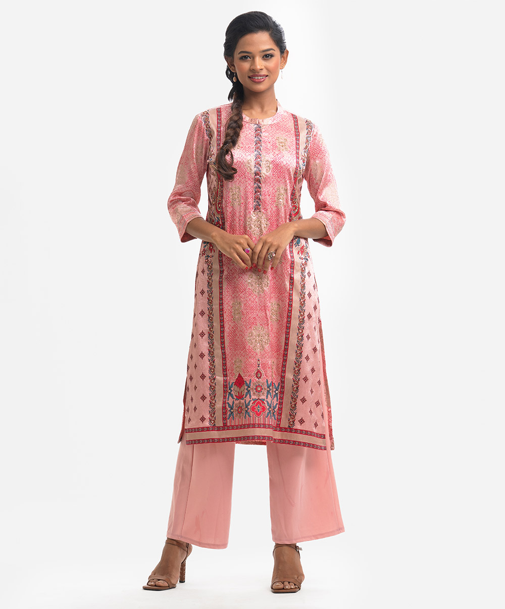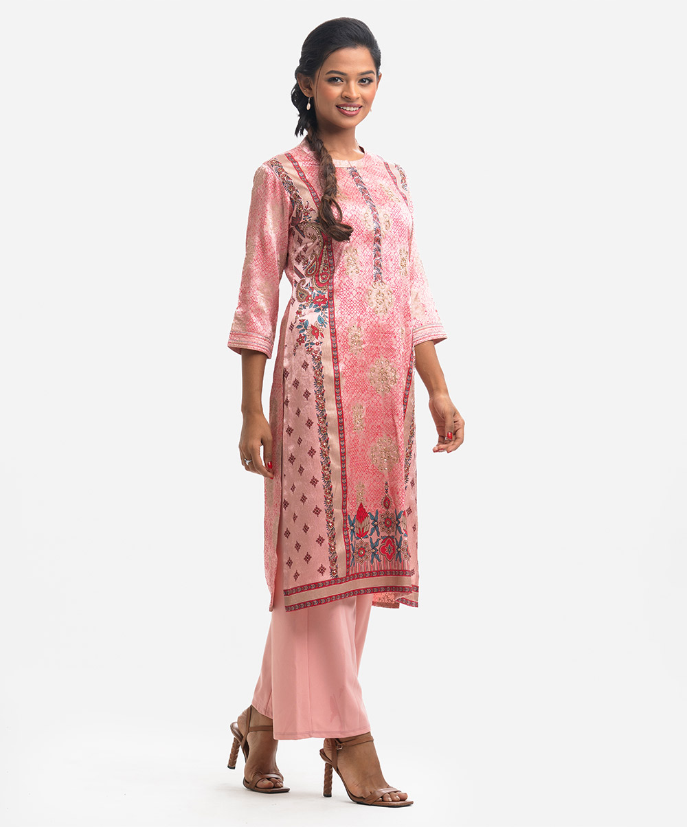 Band collar A-line kameez in satin-georgette fabric. Three-quarter sleeves, karchupi at the front.