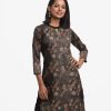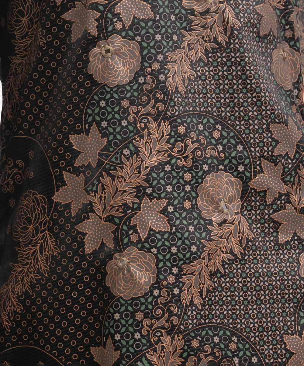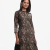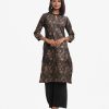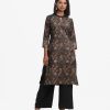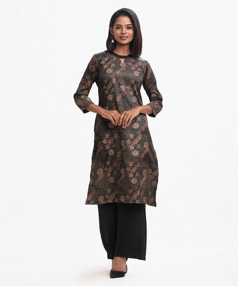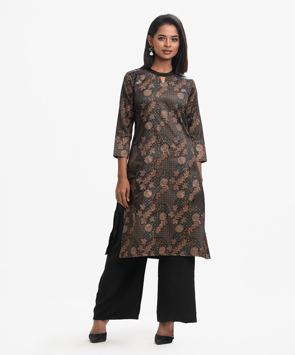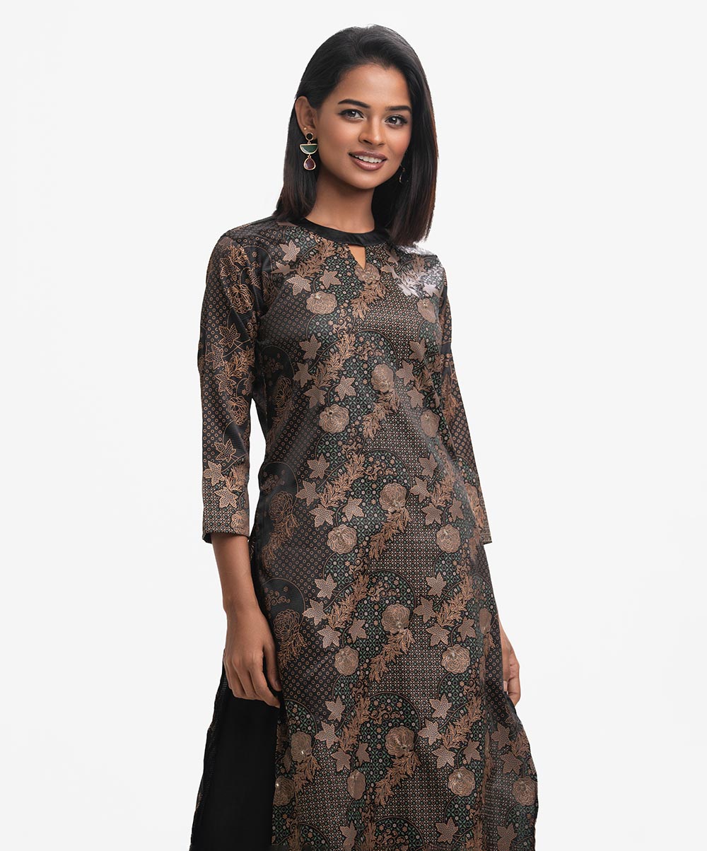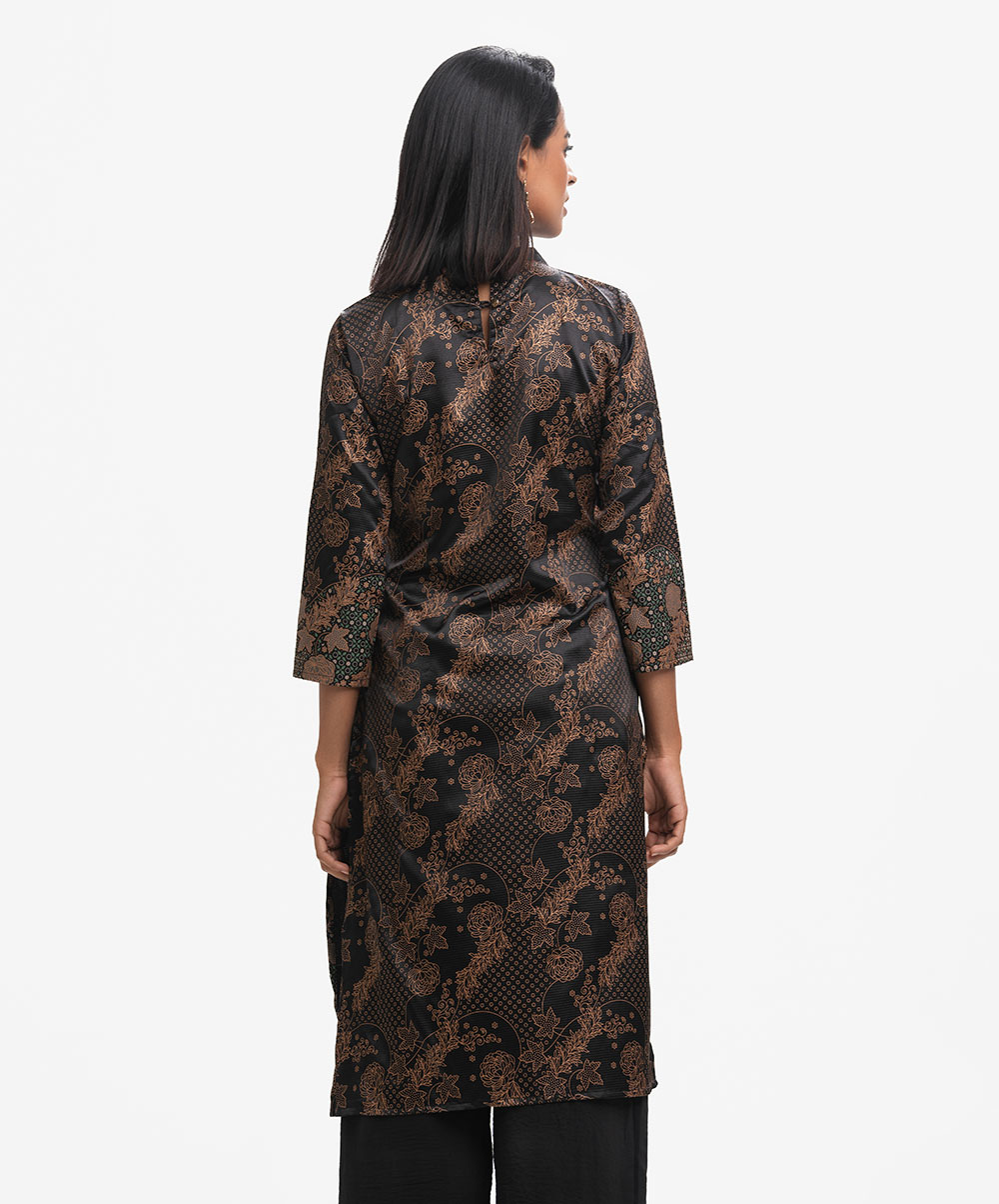 Women’s printed kameez in crepe fabric. Mock neck with v-slit, three-quarter sleeves. Karchupi at front.