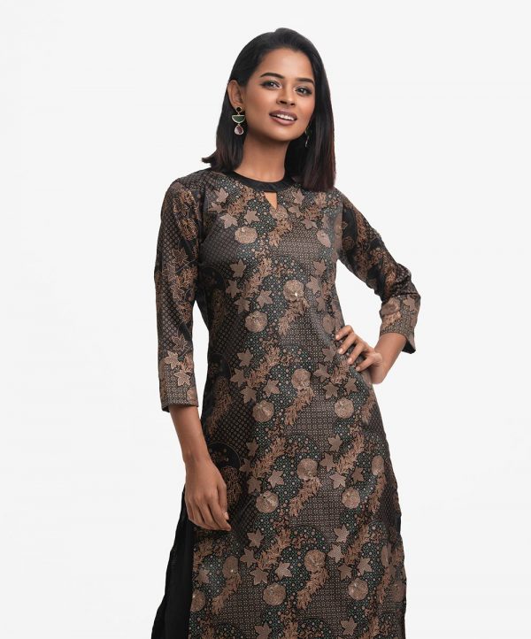 Women’s printed kameez in crepe fabric. Mock neck with v-slit, three-quarter sleeves. Karchupi at front.