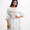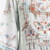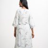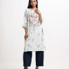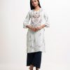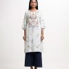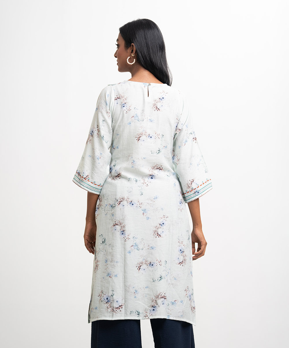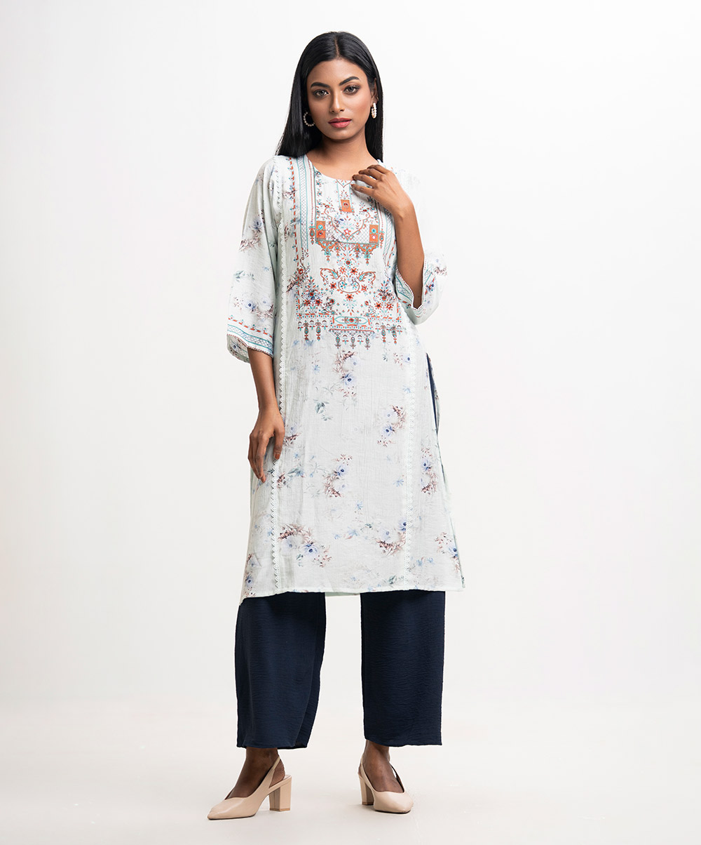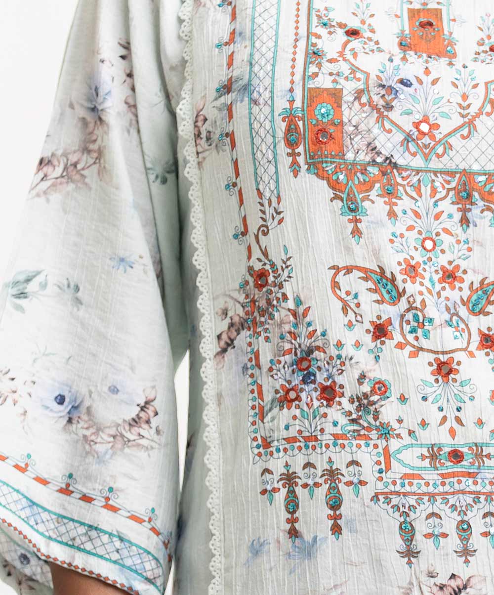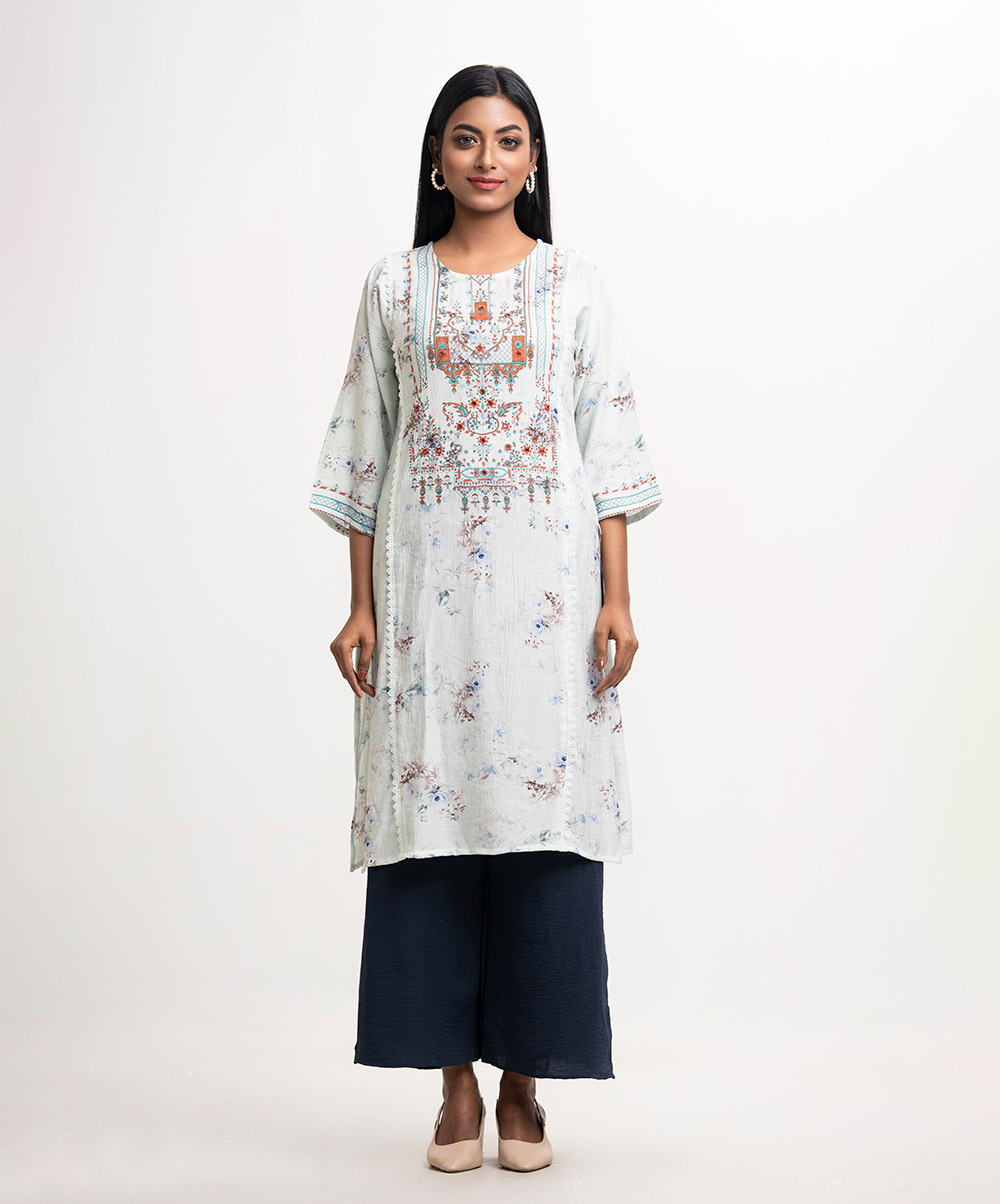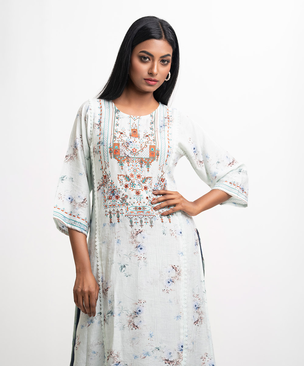 Round neck, patterned kameez in cotton-blended fabric. Three-quarter sleeves, lace and karchupi details.